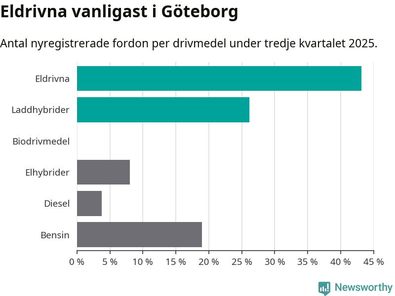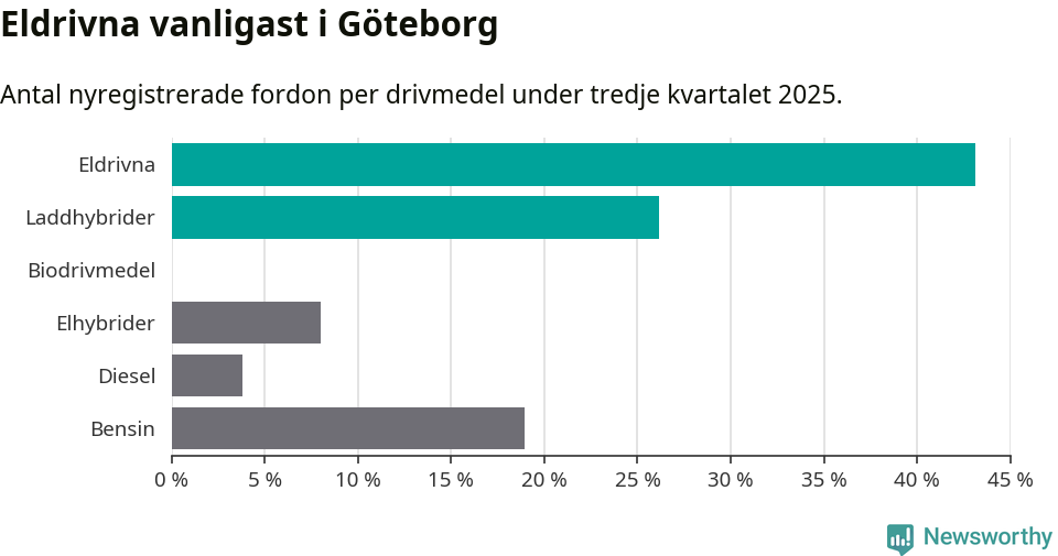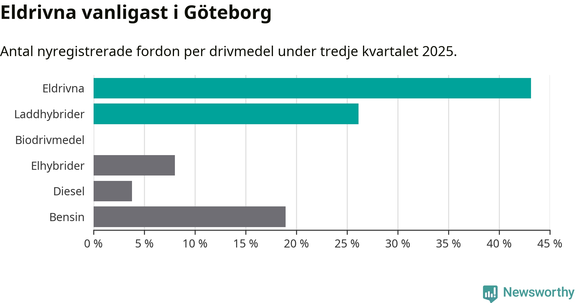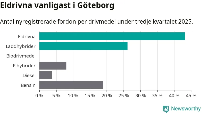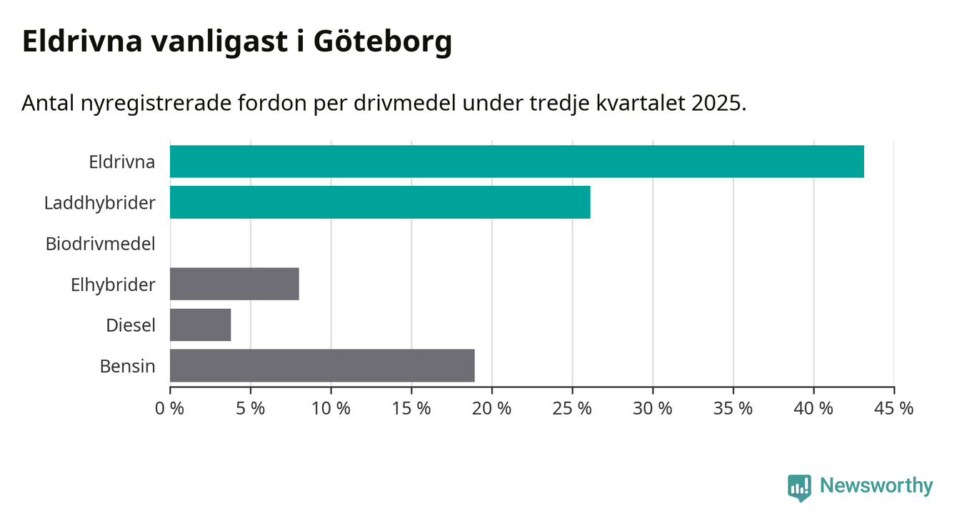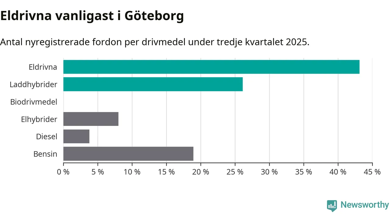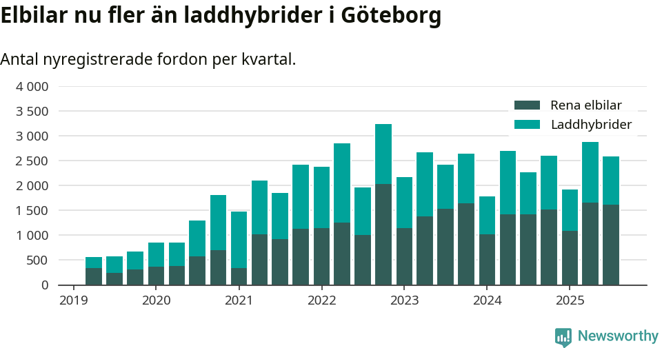 Under tredje kvartalet 2025 var 69 procent av alla nyregistrerade personbilar i Göteborg laddbara (sammanlagt registrerades 3 728 nya bilar). Merparten av de laddbara bilarna var rena elbilar (43 procent av alla).