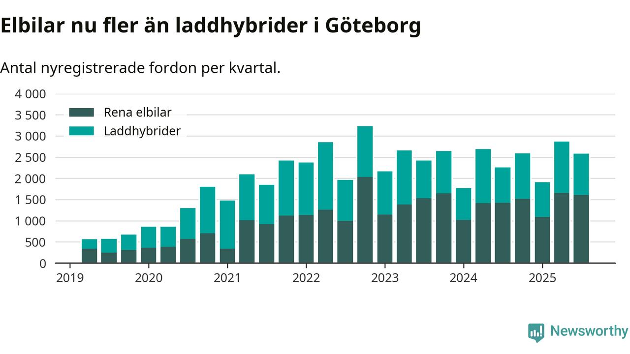 Under tredje kvartalet var sju av tio nyregistrerade bilar i Göteborgs kommun rena elbilar eller laddhybrider. Det är fler än något kvartal tidigare. I riket däremot minskade andelen laddbara bilar något. Framför allt elbilsförsäljningen har tappat fart.