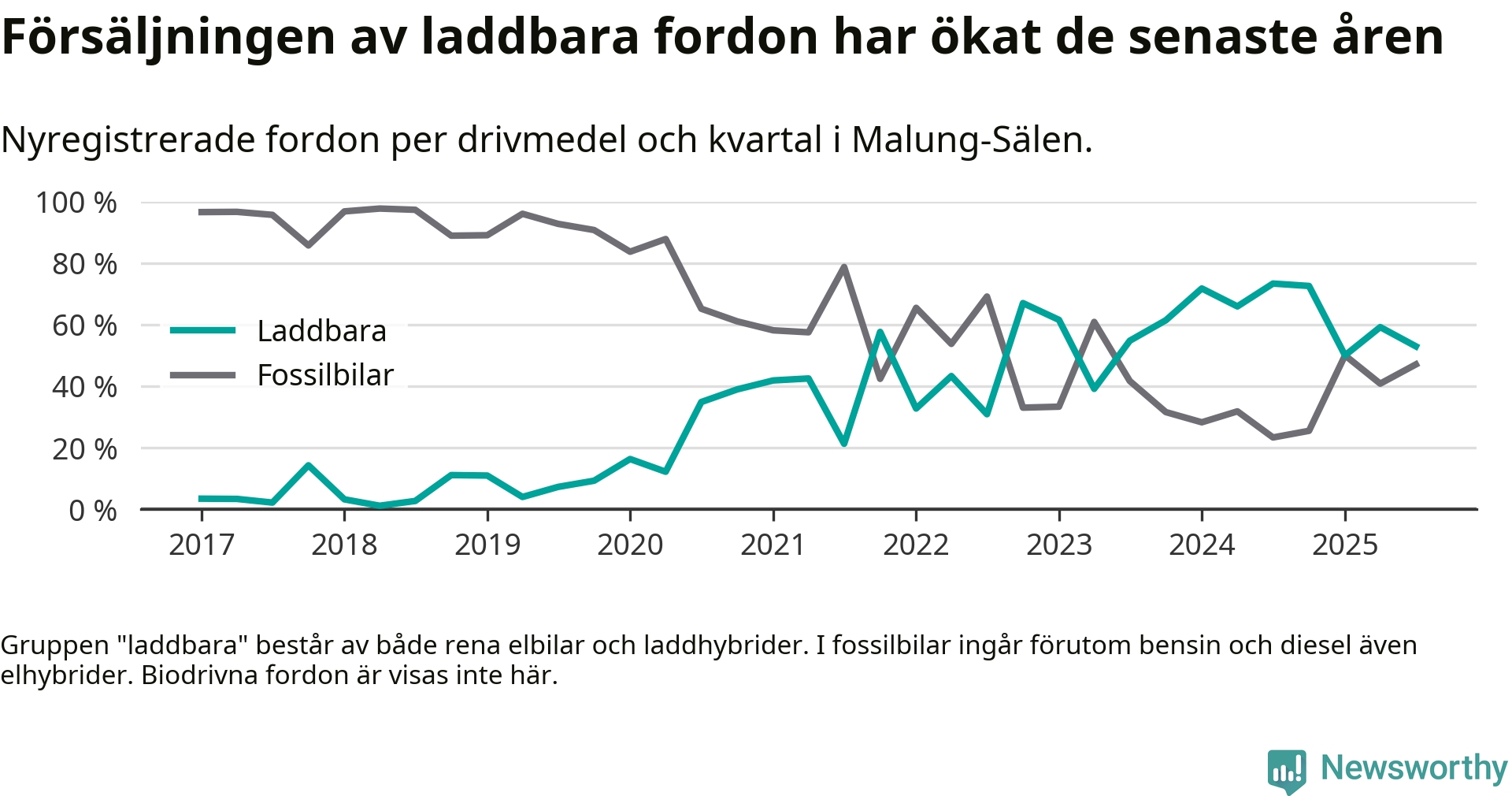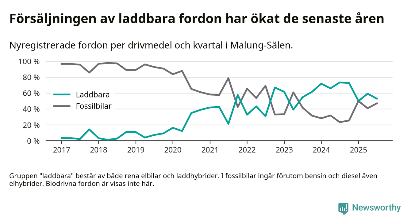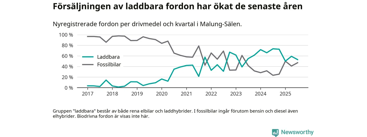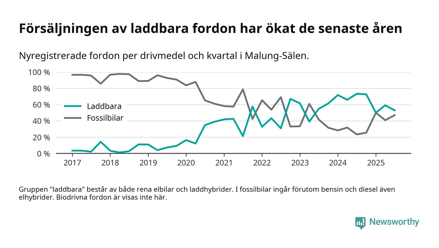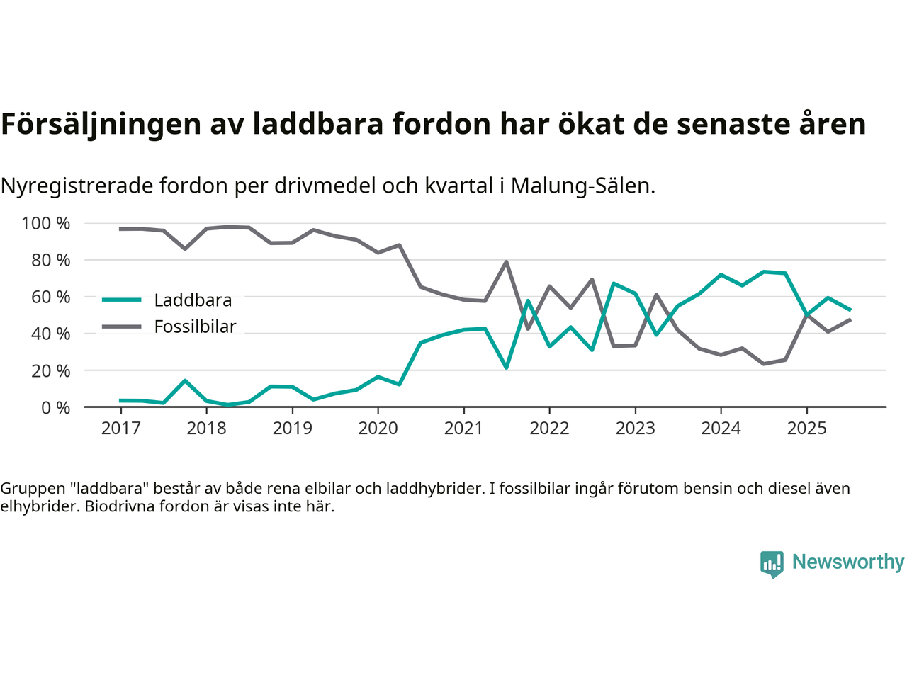 Under tredje kvartalet 2025 var 53 procent av alla nyregistrerade personbilar i Malung-Sälen laddbara (sammanlagt registrerades 34 nya bilar). Merparten av de laddbara bilarna var rena elbilar (32 procent av alla).