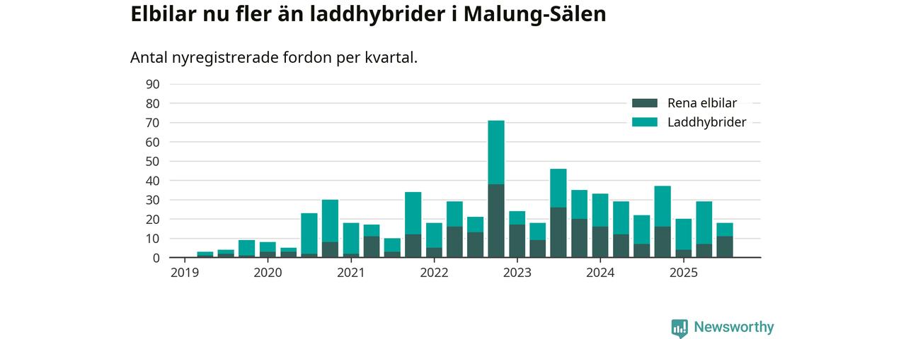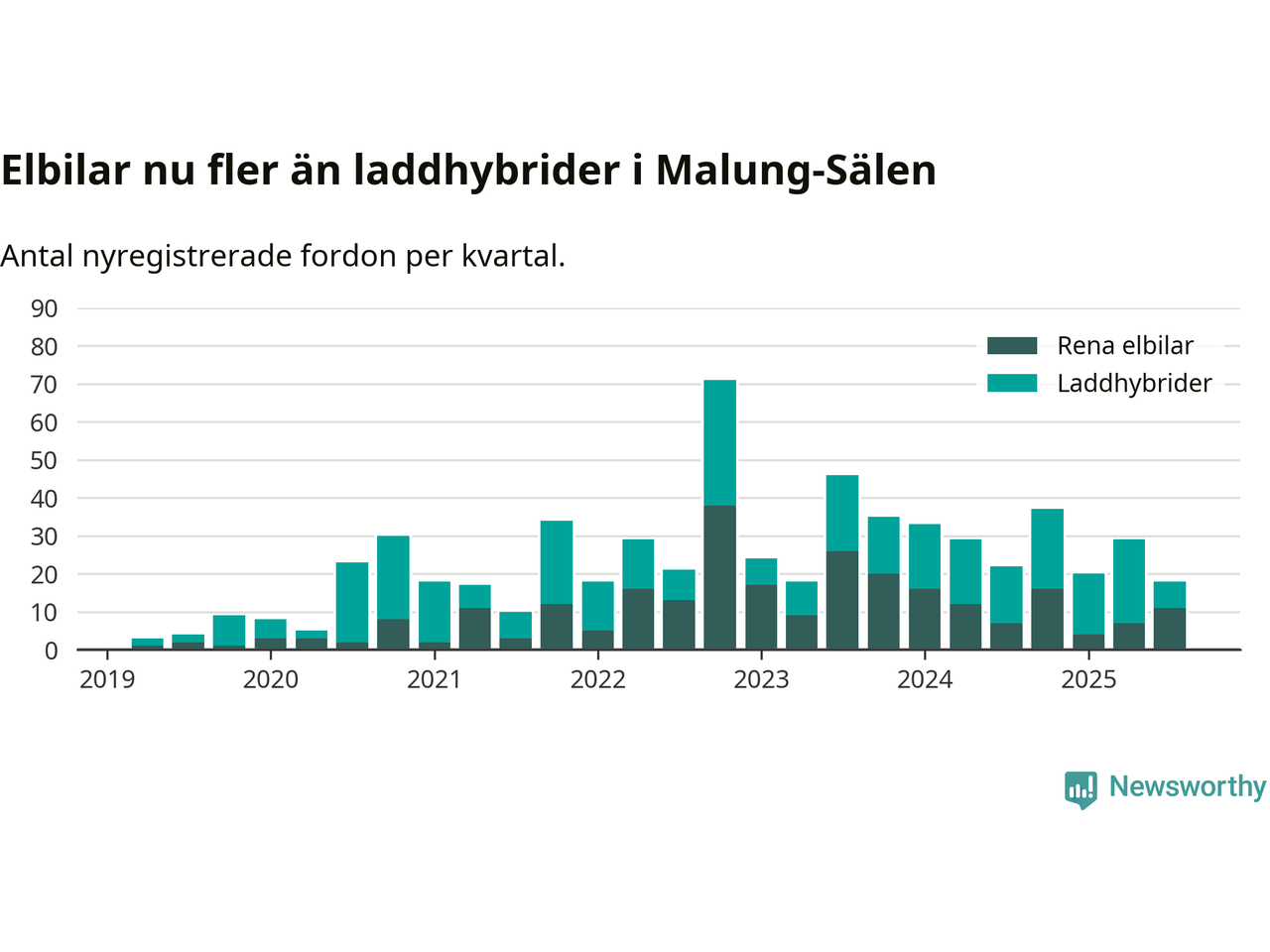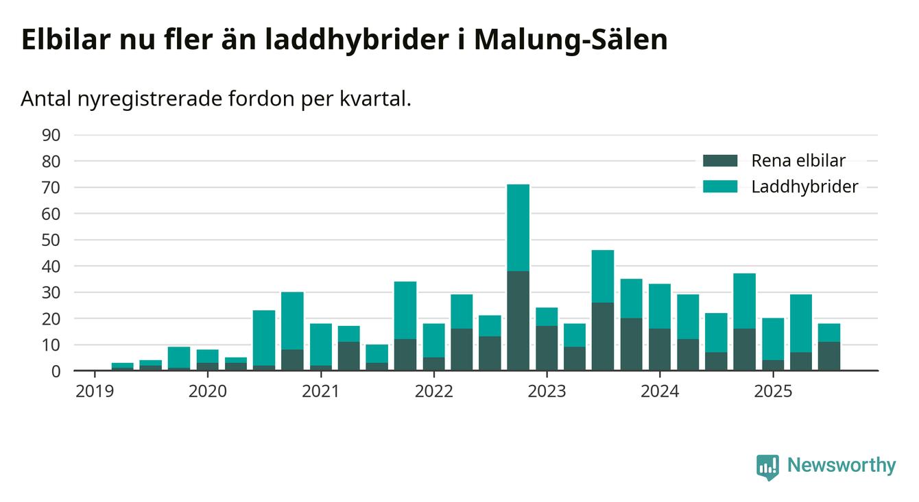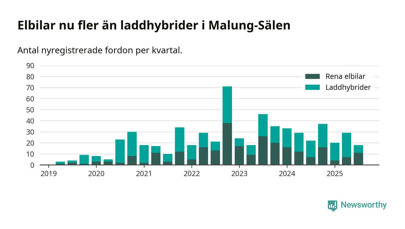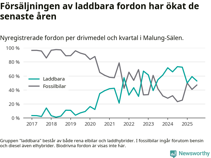 Under tredje kvartalet 2025 var 53 procent av alla nyregistrerade personbilar i Malung-Sälen laddbara (sammanlagt registrerades 34 nya bilar). Merparten av de laddbara bilarna var rena elbilar (32 procent av alla).