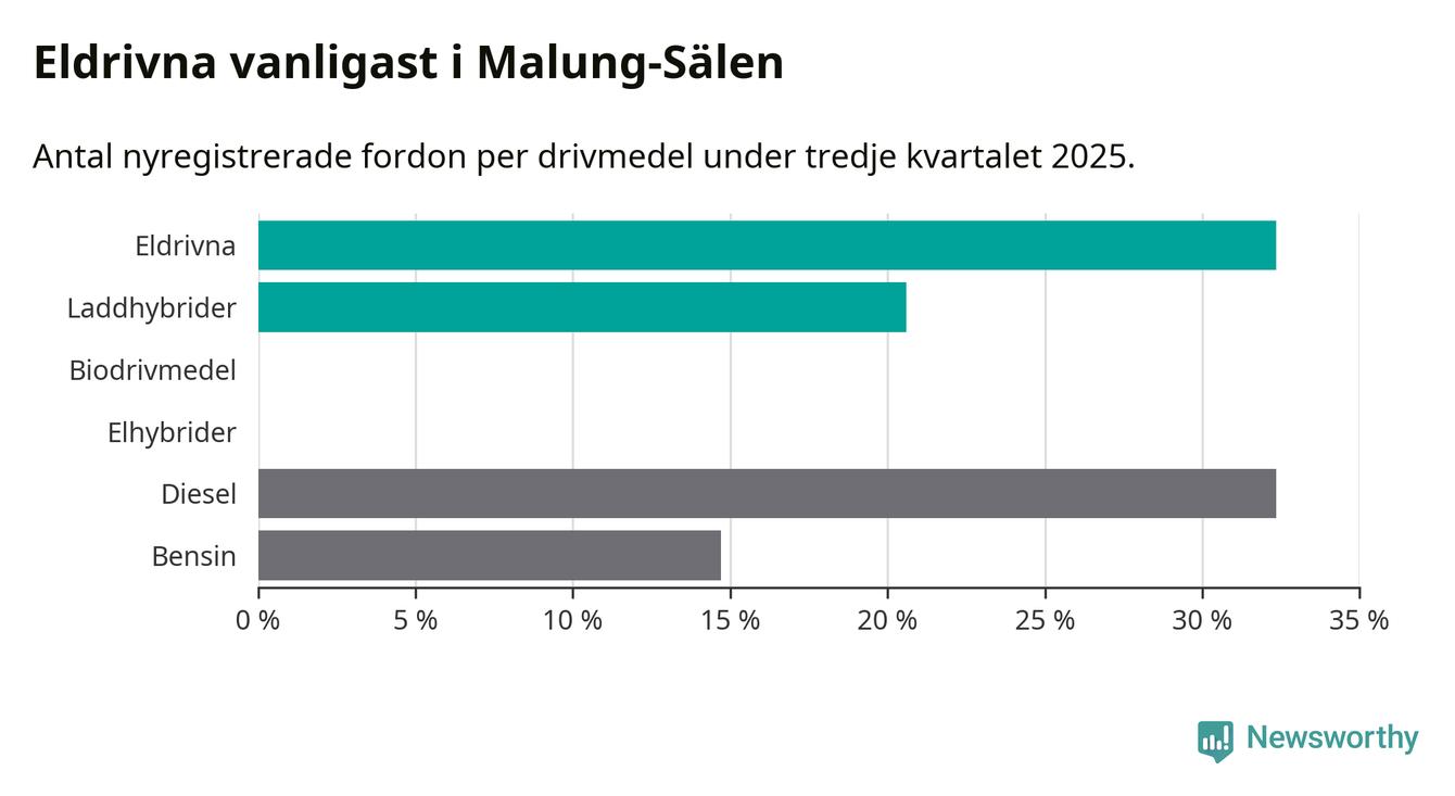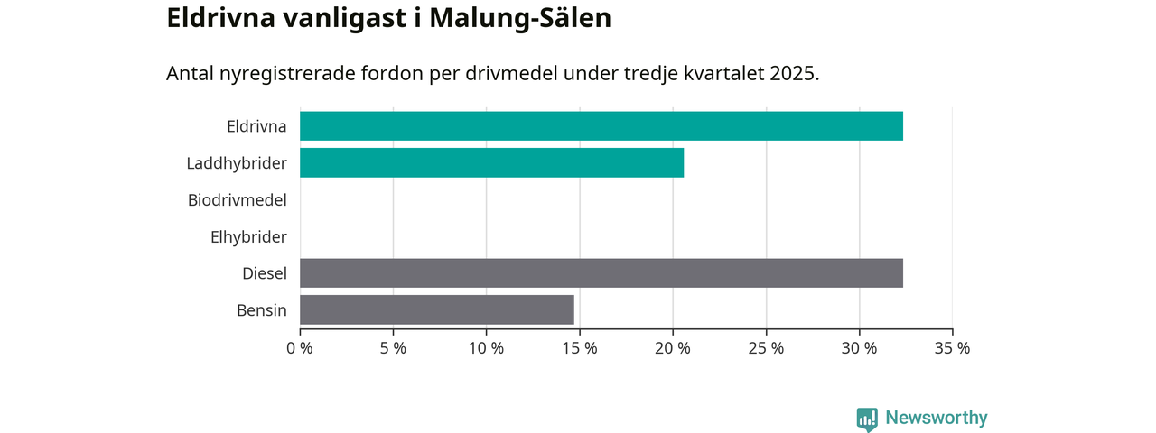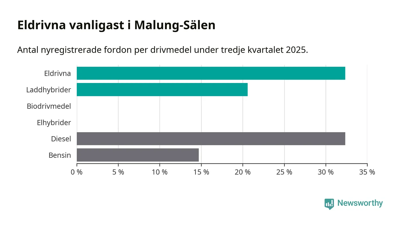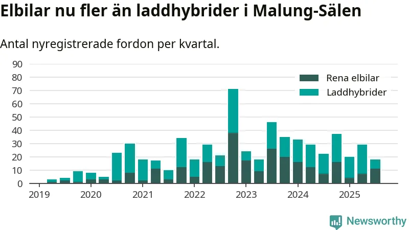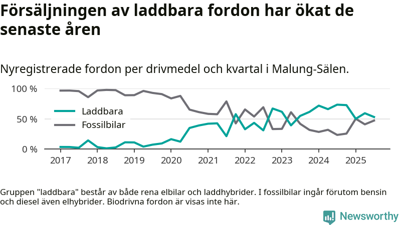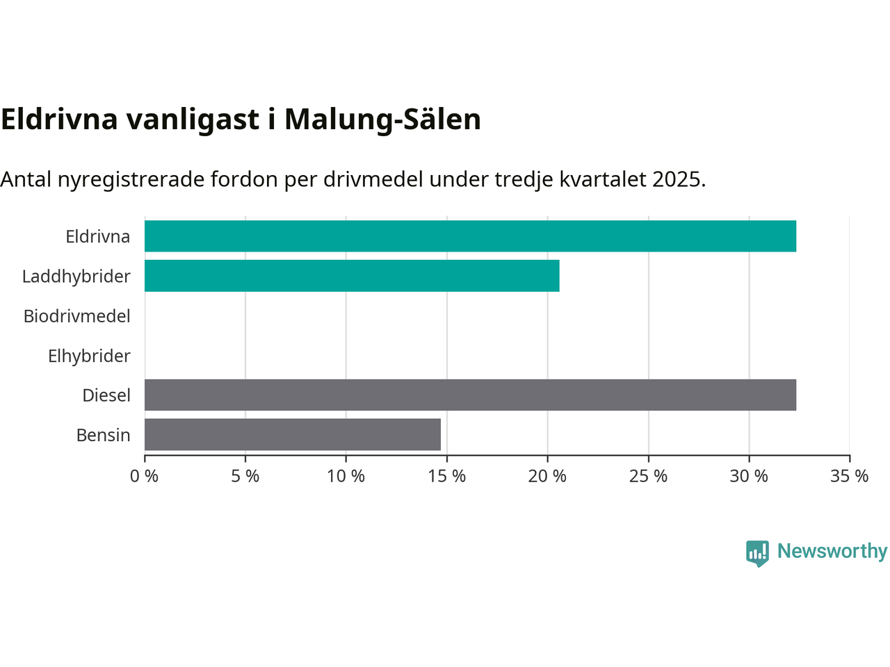 Under tredje kvartalet 2025 var 53 procent av alla nyregistrerade personbilar i Malung-Sälen laddbara (sammanlagt registrerades 34 nya bilar). Merparten av de laddbara bilarna var rena elbilar (32 procent av alla).