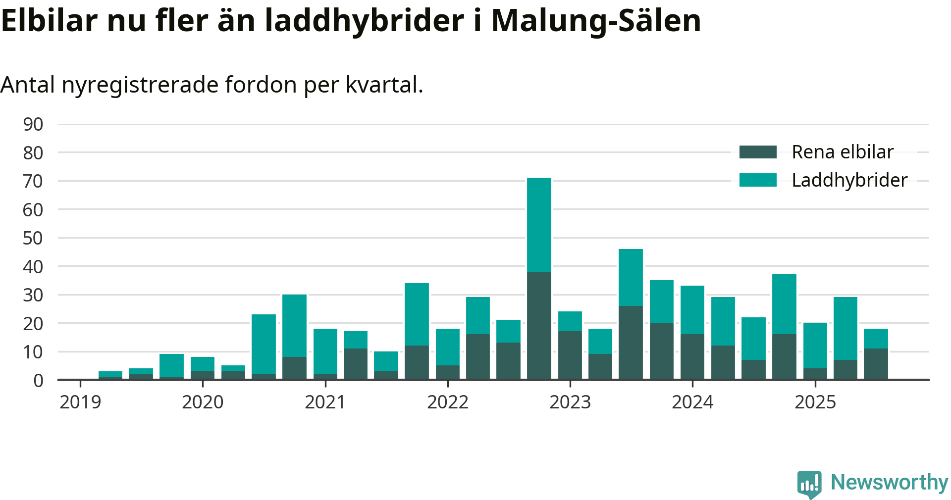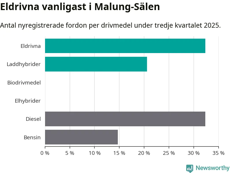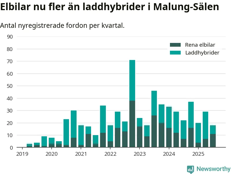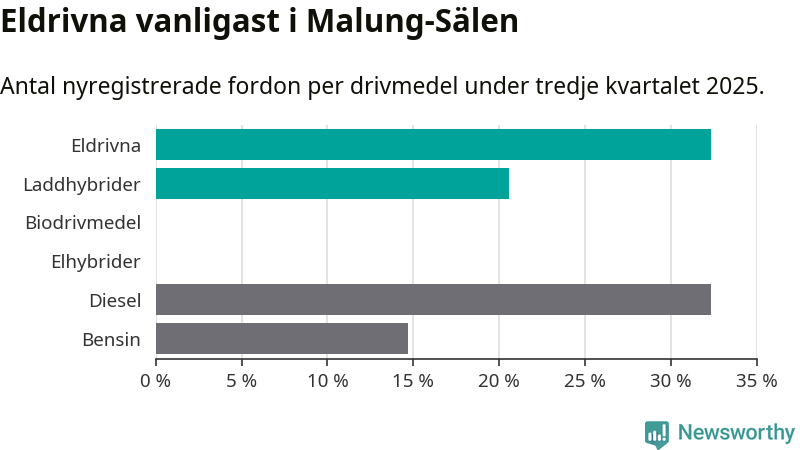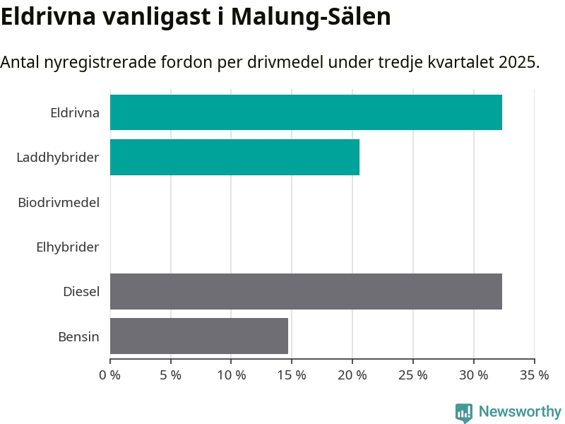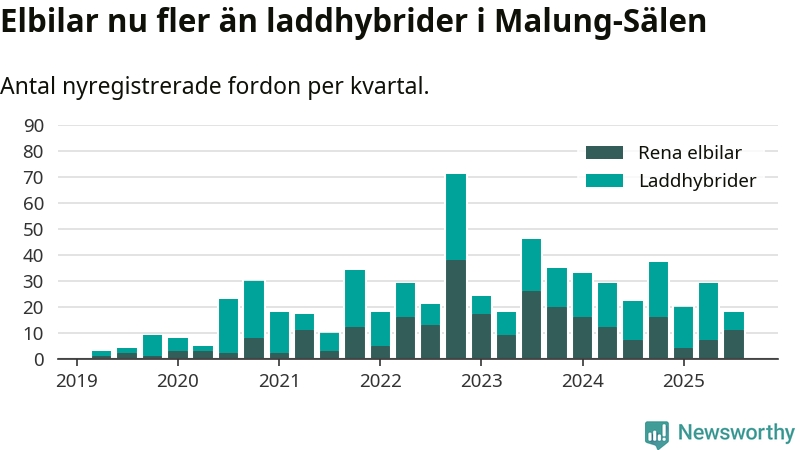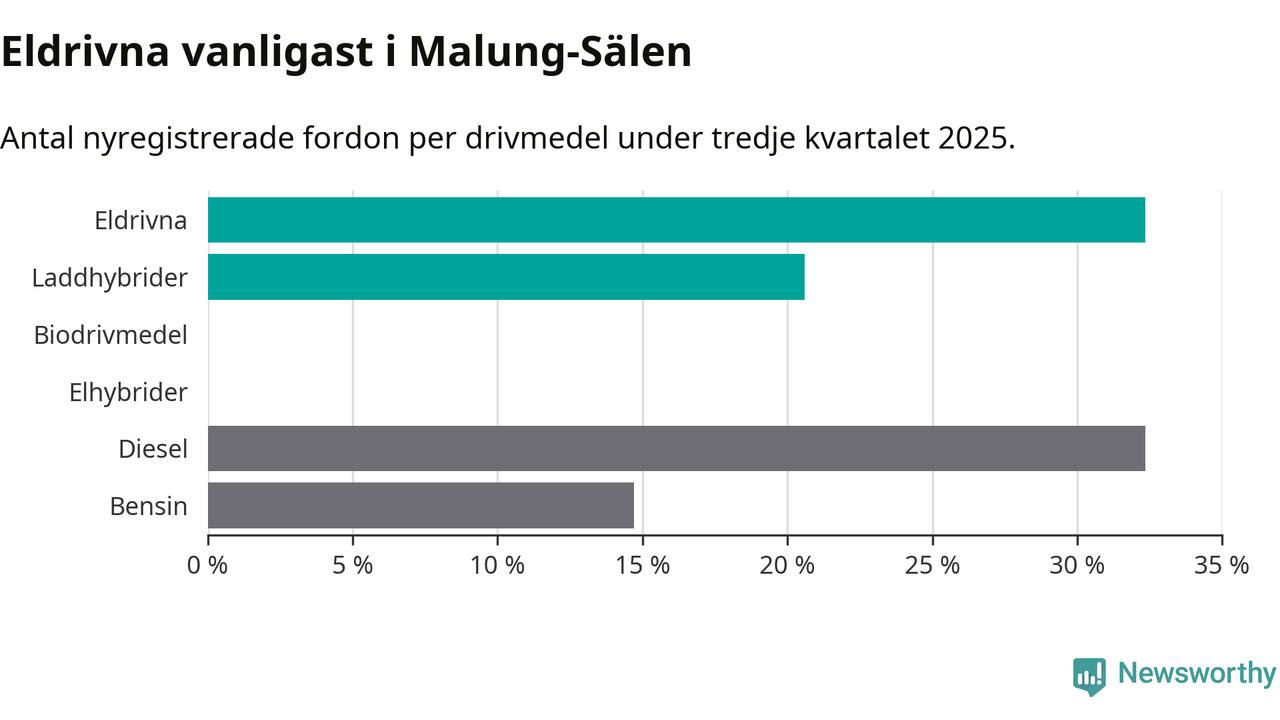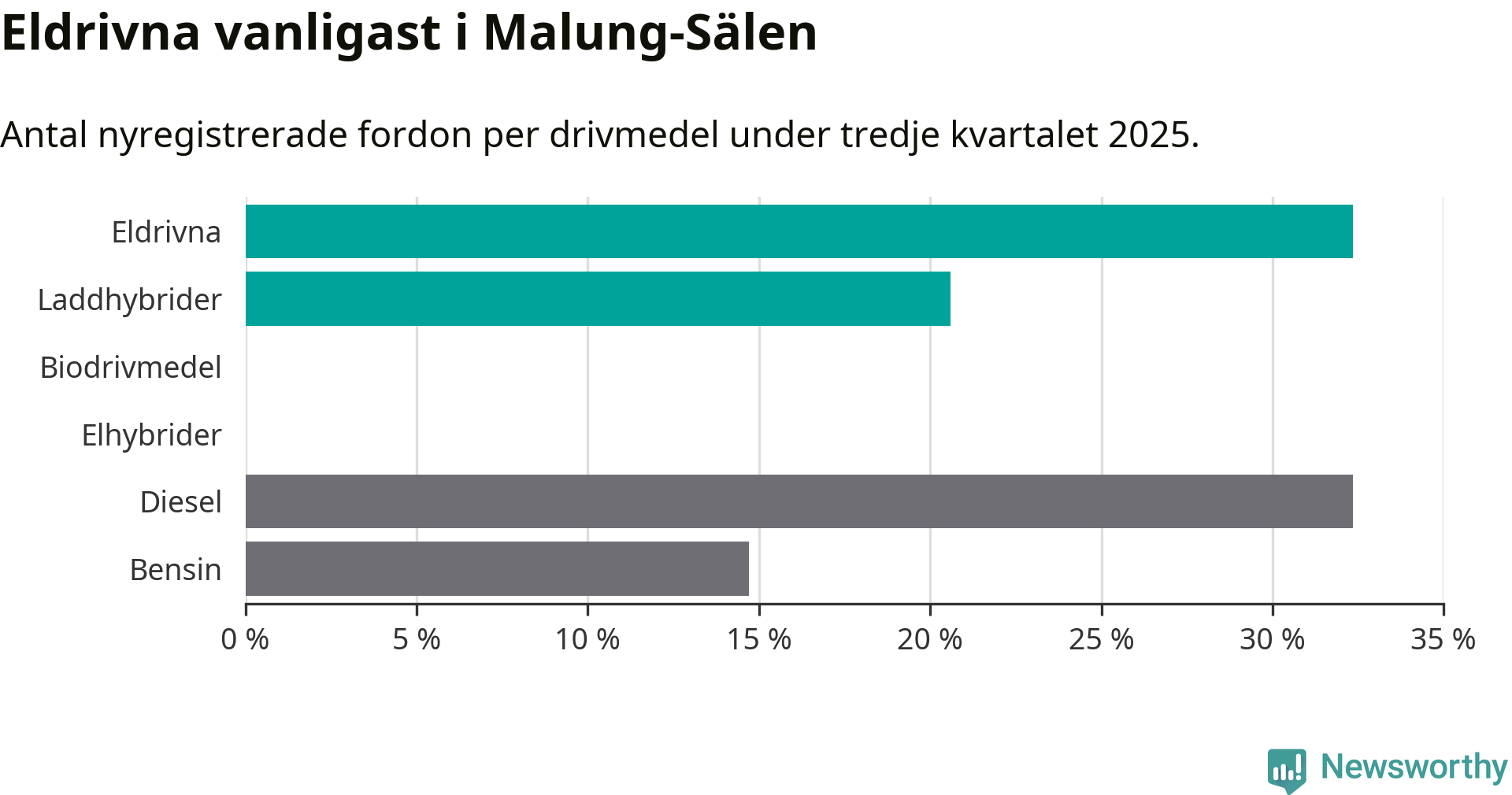 Under tredje kvartalet 2025 var 53 procent av alla nyregistrerade personbilar i Malung-Sälen laddbara (sammanlagt registrerades 34 nya bilar). Merparten av de laddbara bilarna var rena elbilar (32 procent av alla).