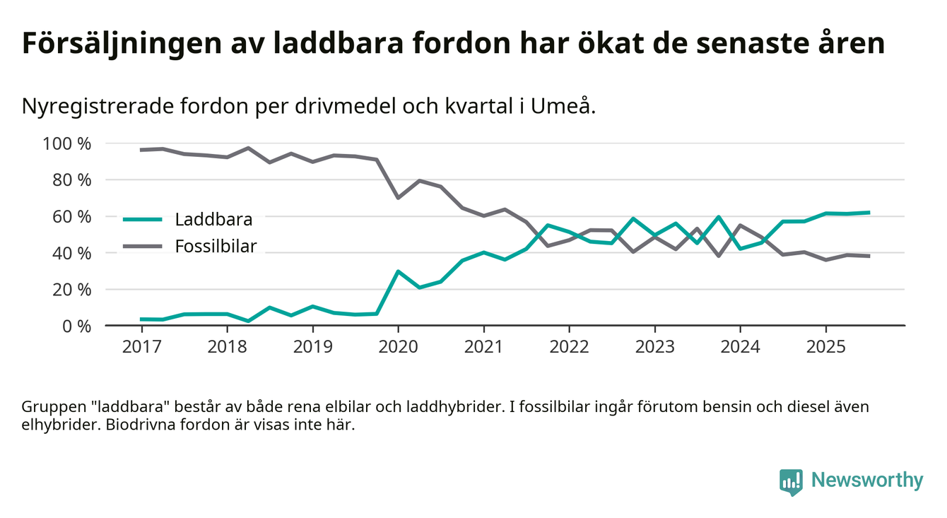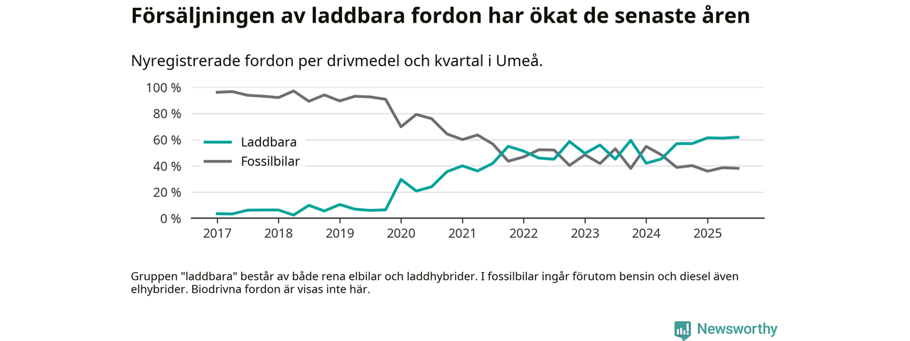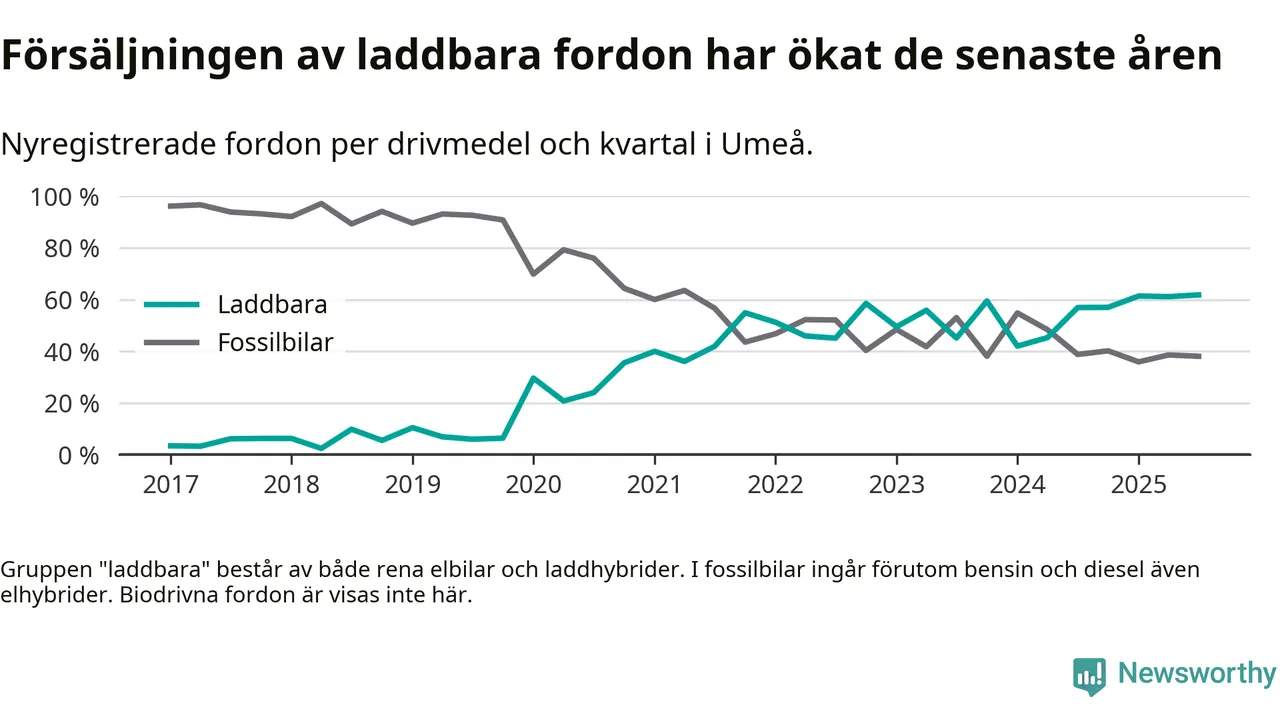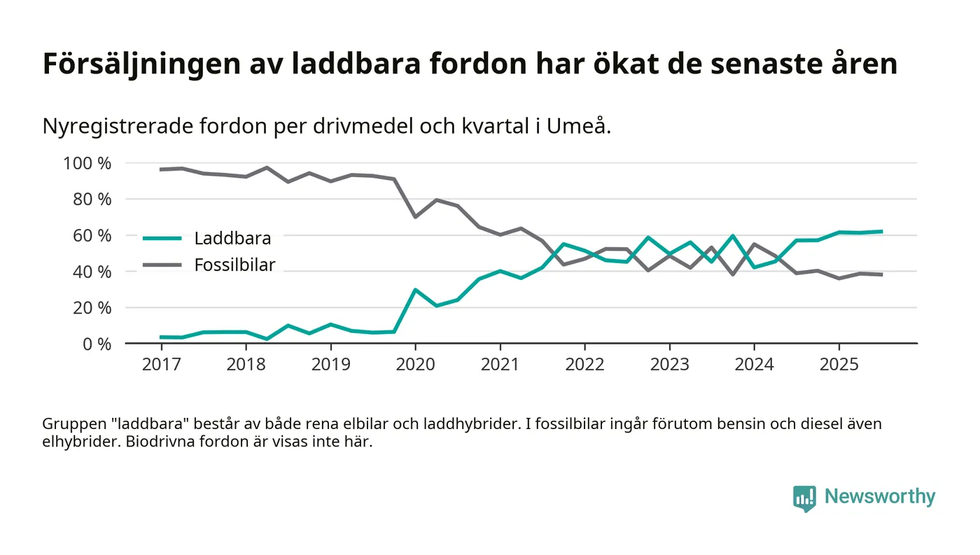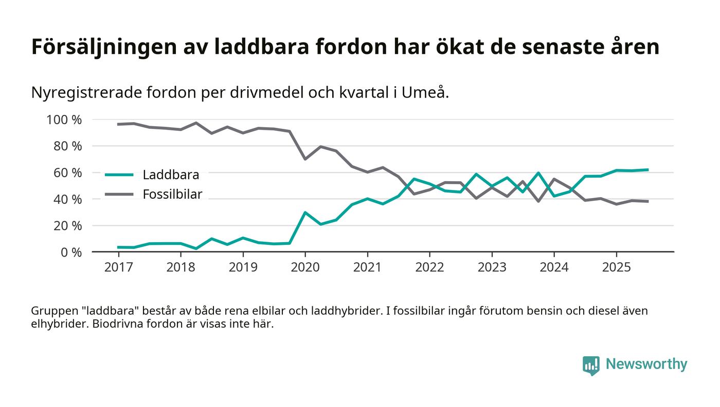 Under tredje kvartalet 2025 var 62 procent av alla nyregistrerade personbilar i Umeå laddbara (sammanlagt registrerades 644 nya bilar). Merparten av de laddbara bilarna var så kallade laddhybrider, det vill säga fordon som går att ladda och köra på el, men som även har en förbränningsmotor. 30 procent av alla nya bilar var rena elbilar.