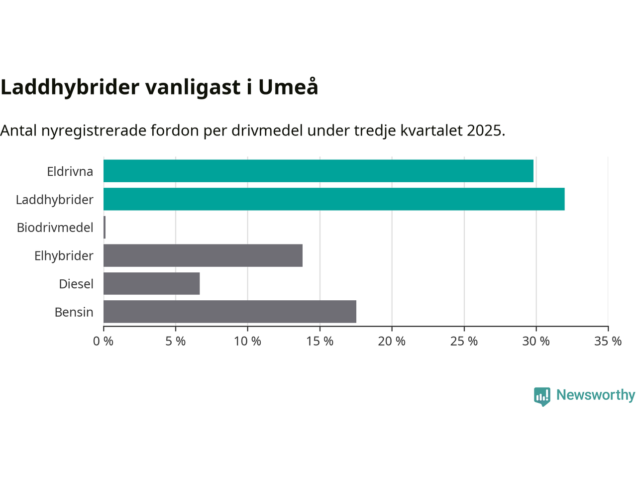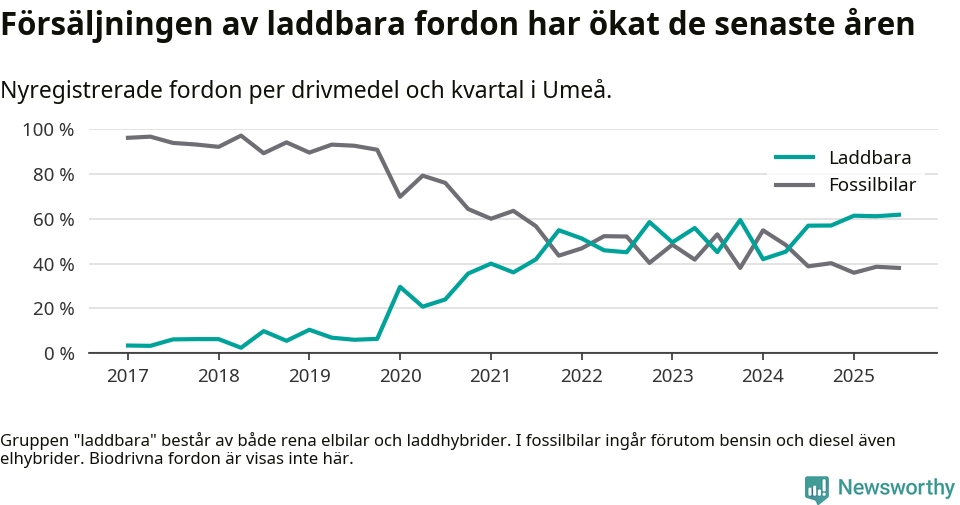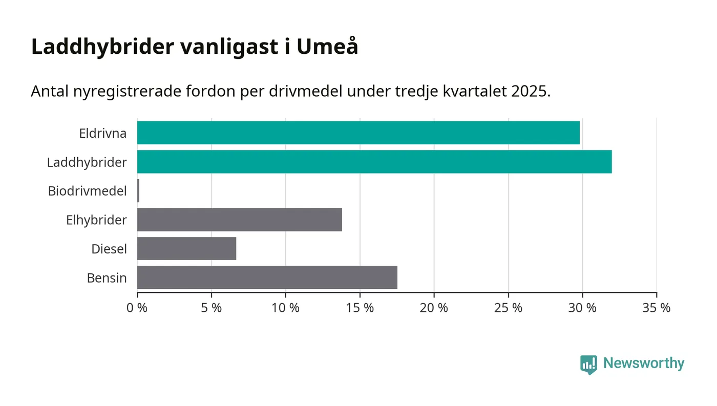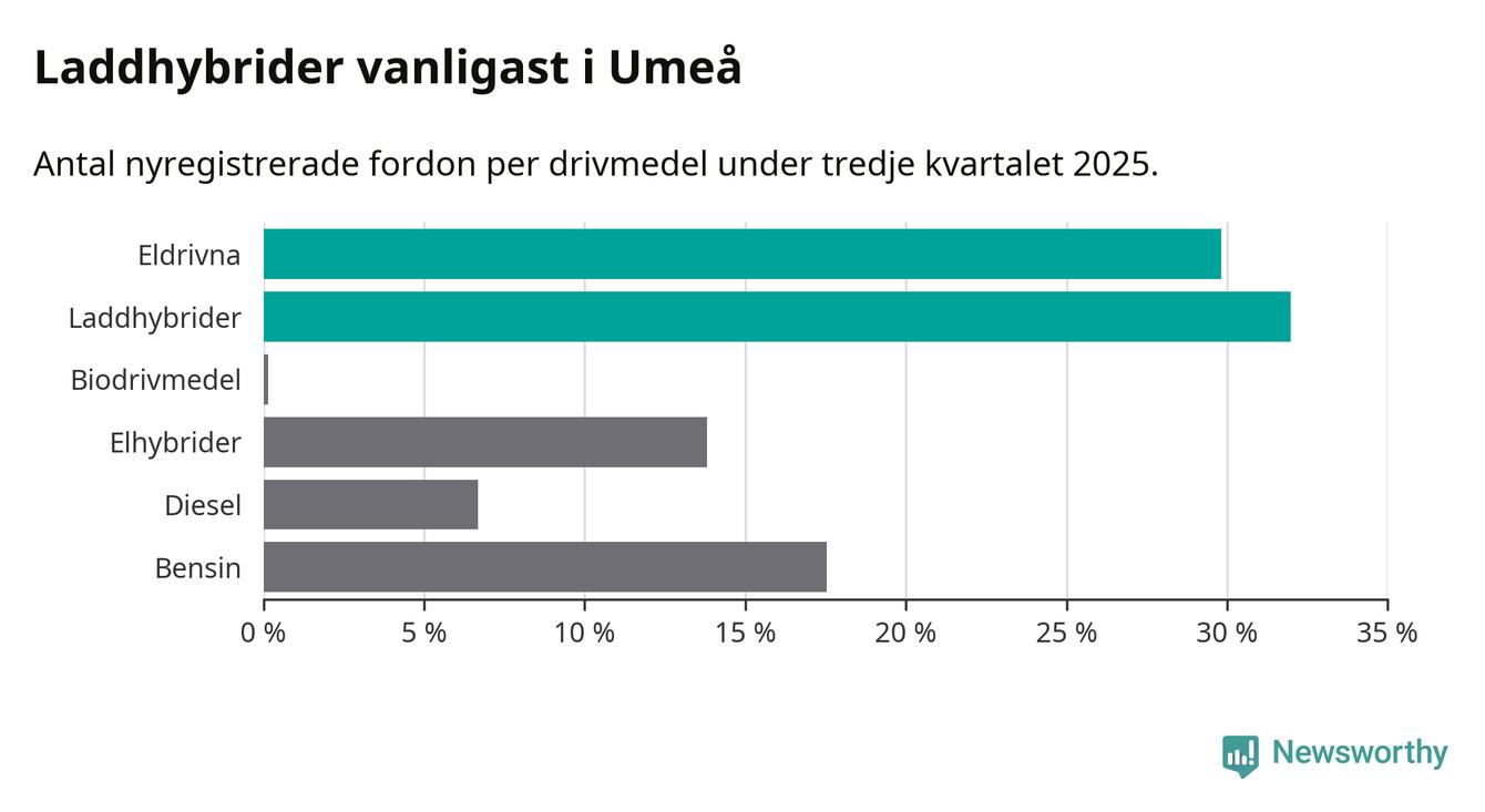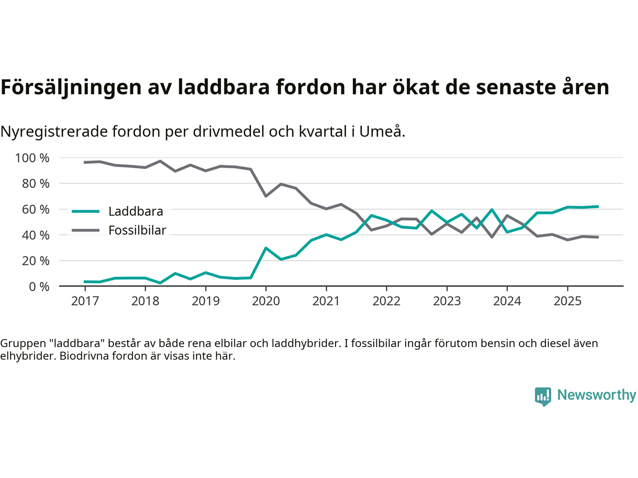 Under tredje kvartalet 2025 var 62 procent av alla nyregistrerade personbilar i Umeå laddbara (sammanlagt registrerades 644 nya bilar). Merparten av de laddbara bilarna var så kallade laddhybrider, det vill säga fordon som går att ladda och köra på el, men som även har en förbränningsmotor. 30 procent av alla nya bilar var rena elbilar.