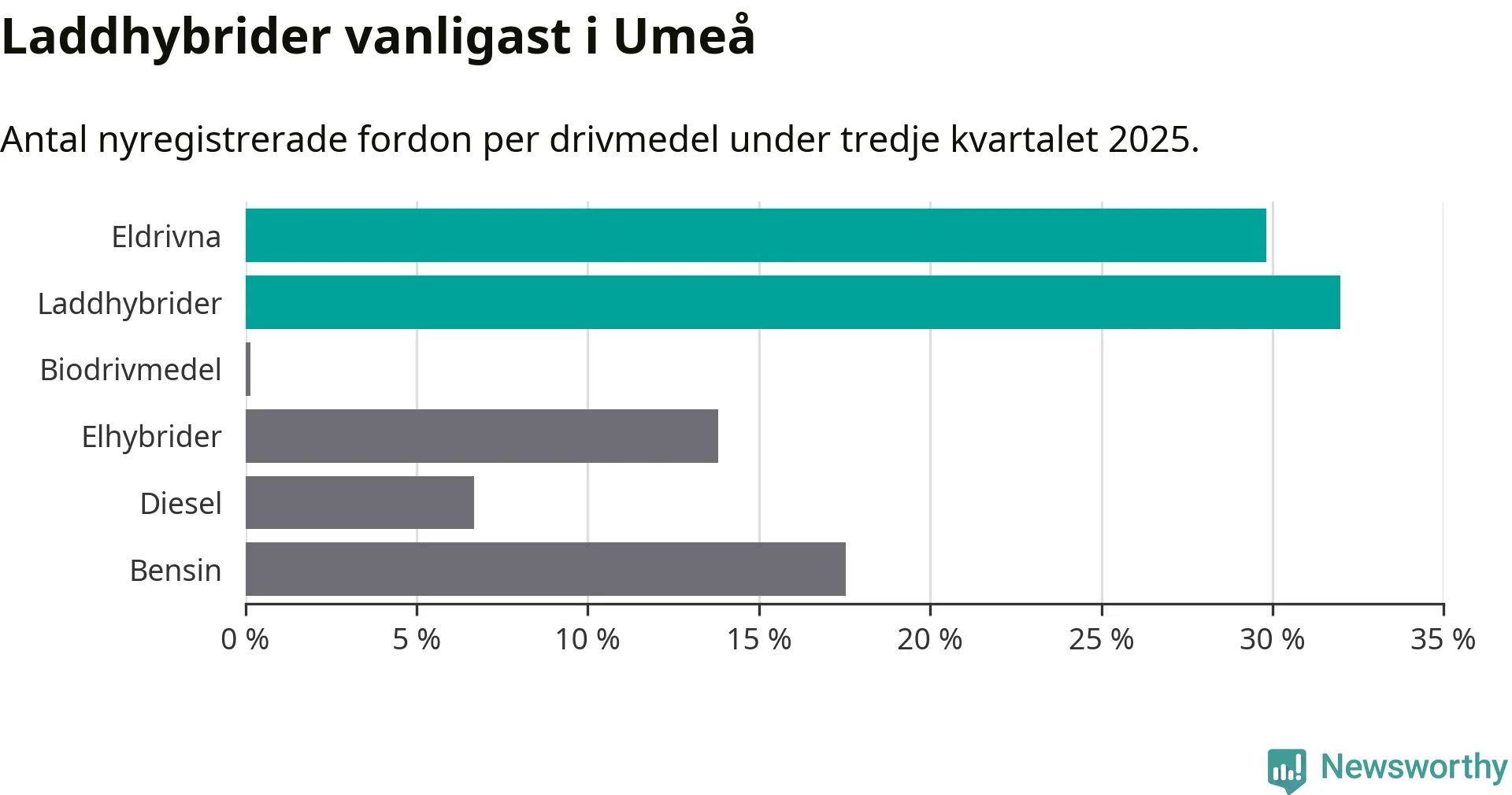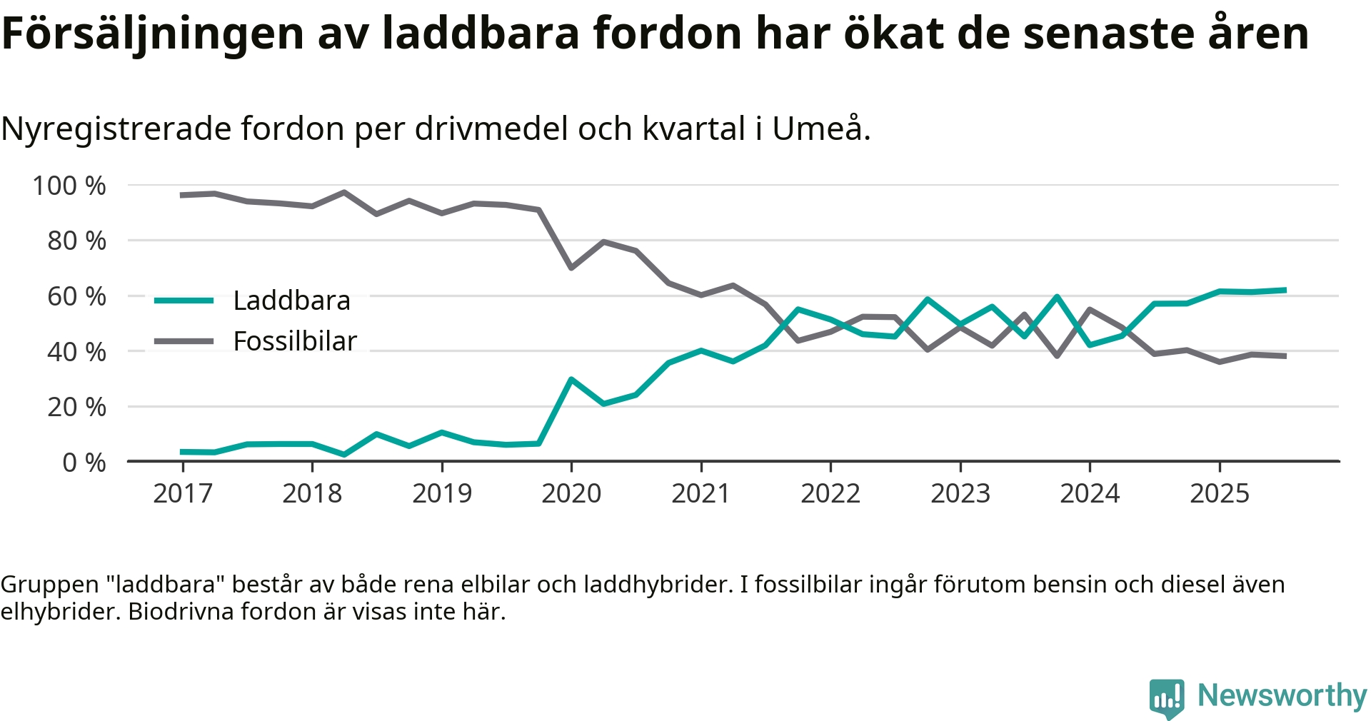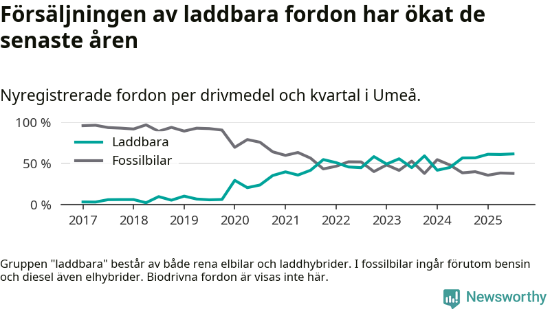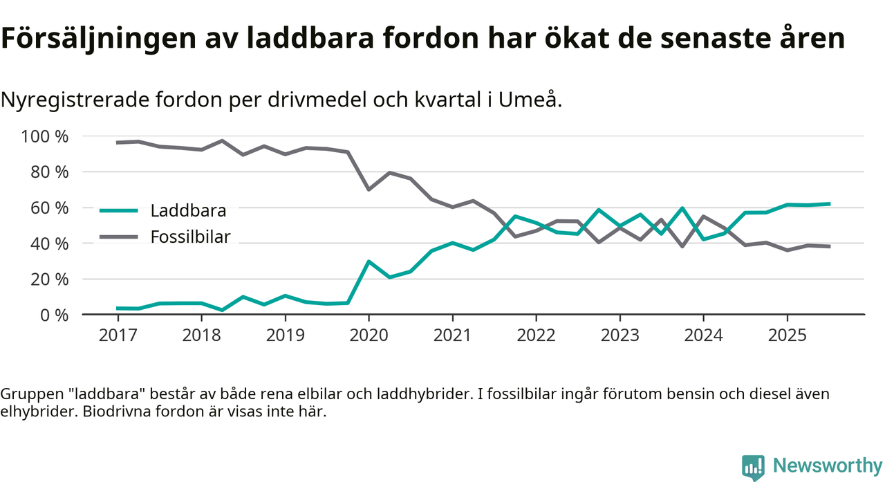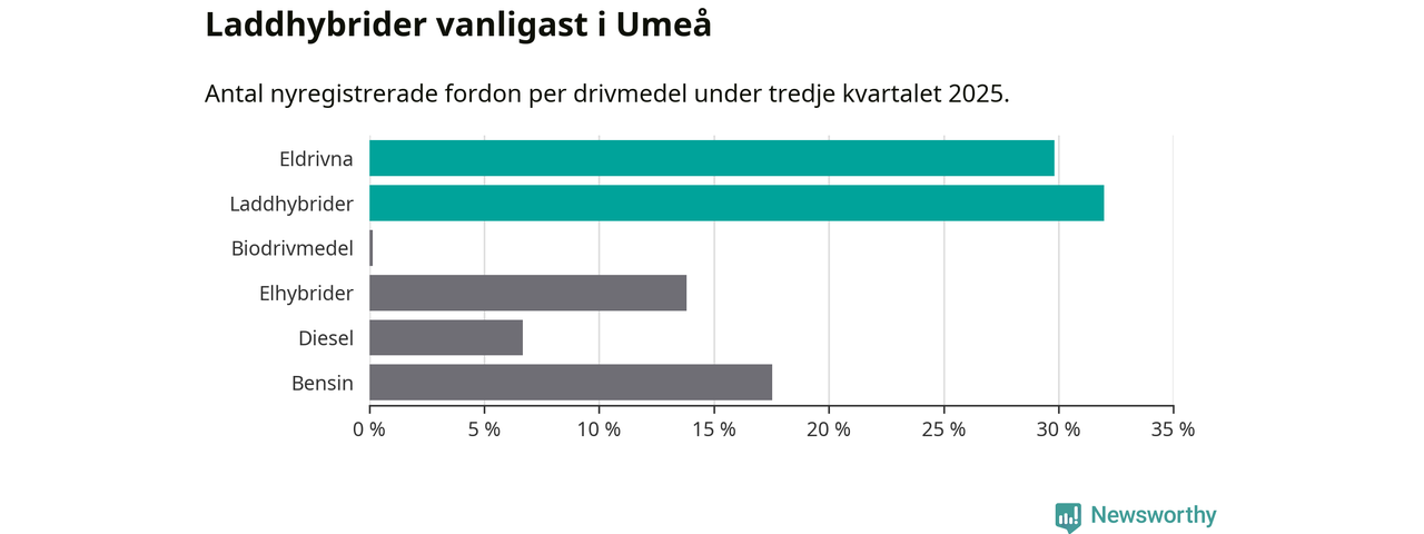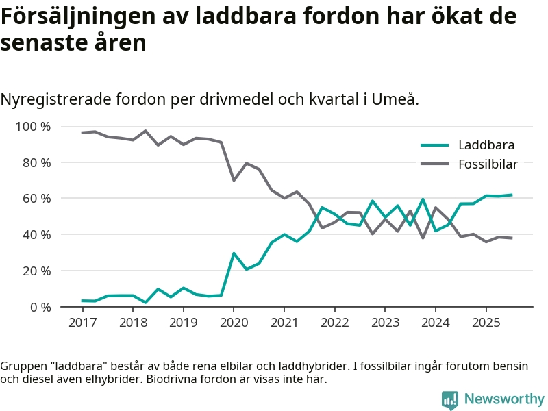 Under tredje kvartalet 2025 var 62 procent av alla nyregistrerade personbilar i Umeå laddbara (sammanlagt registrerades 644 nya bilar). Merparten av de laddbara bilarna var så kallade laddhybrider, det vill säga fordon som går att ladda och köra på el, men som även har en förbränningsmotor. 30 procent av alla nya bilar var rena elbilar.