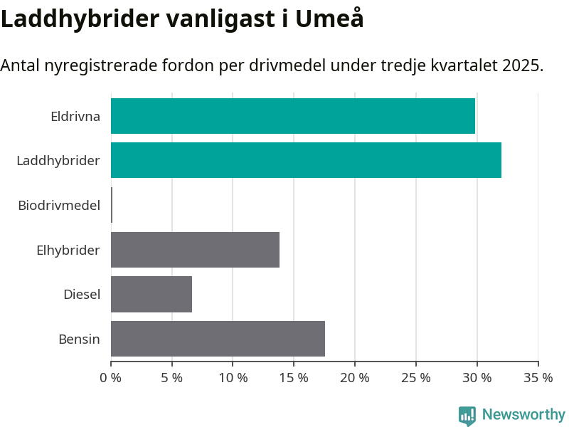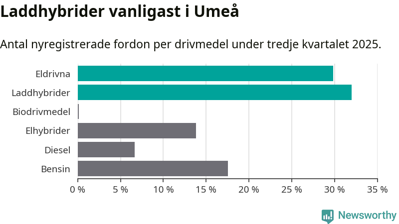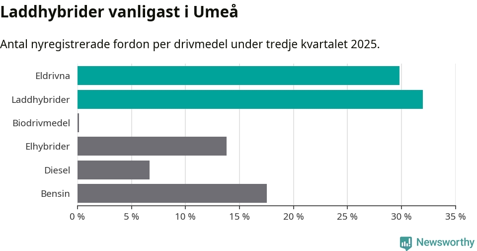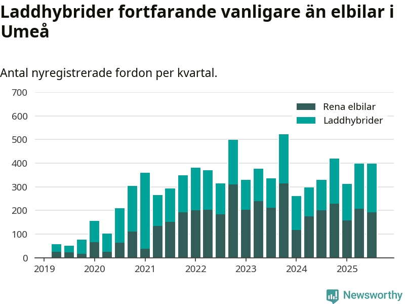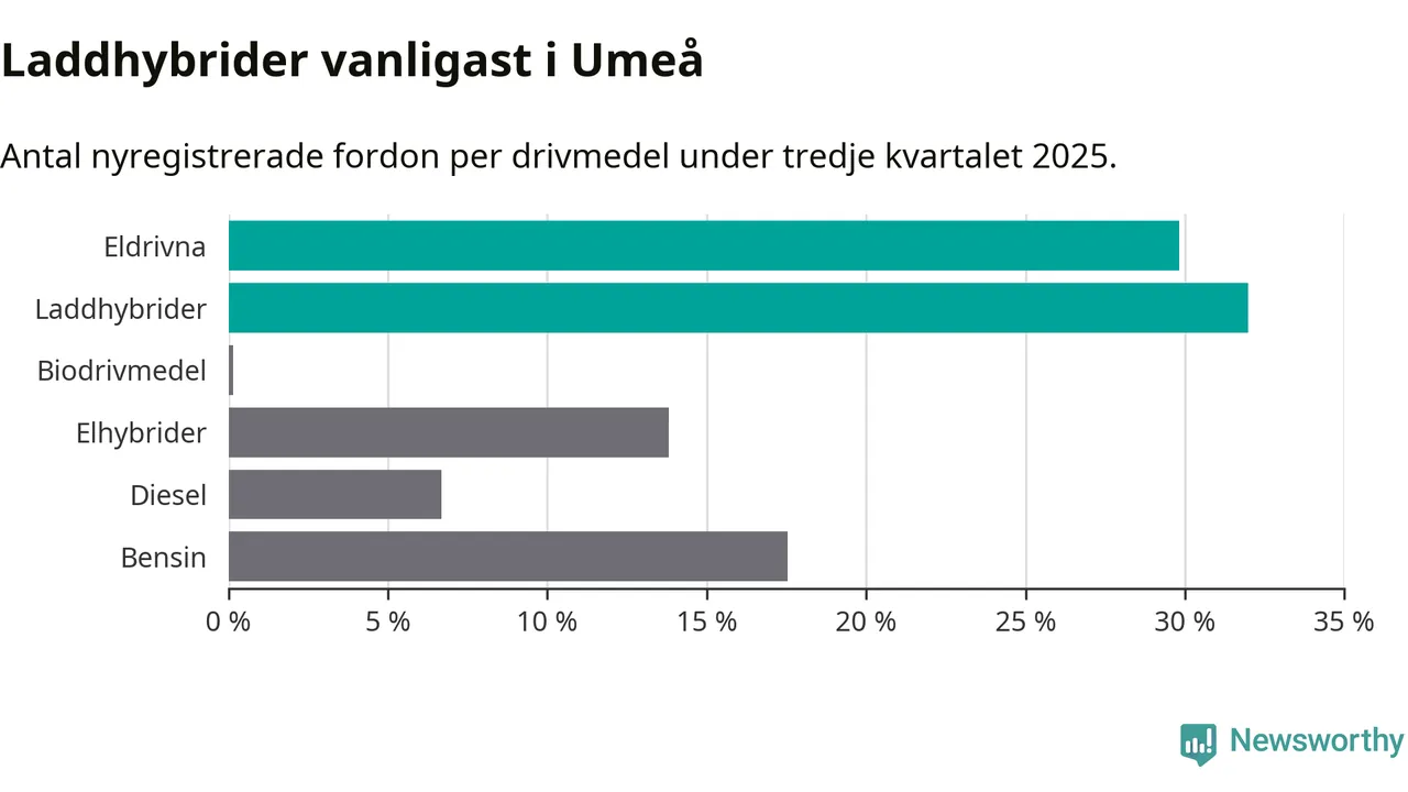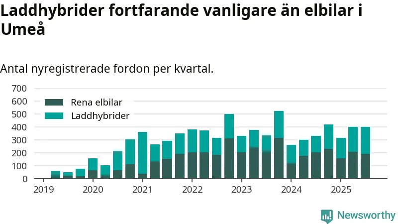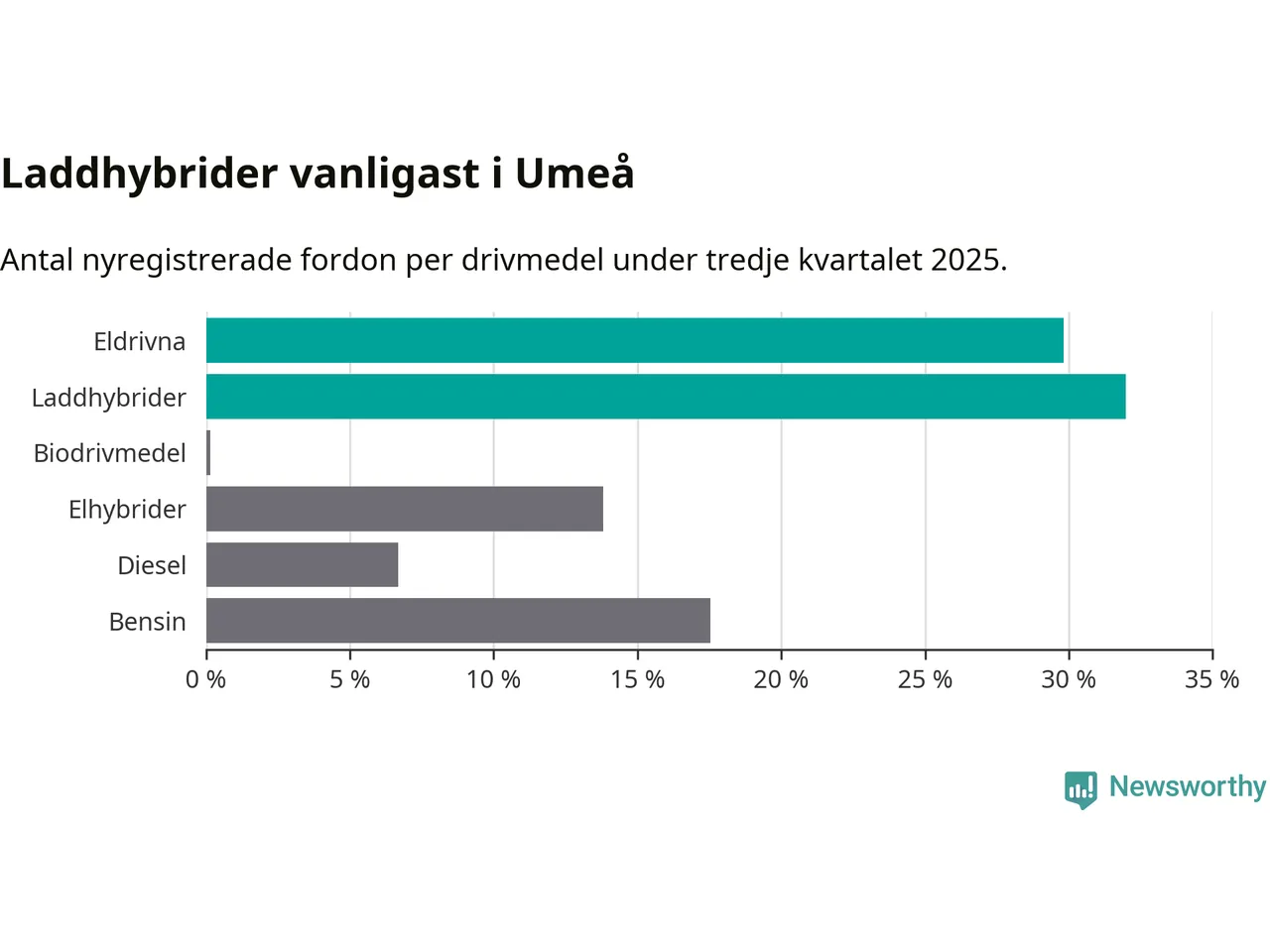 Under tredje kvartalet 2025 var 62 procent av alla nyregistrerade personbilar i Umeå laddbara (sammanlagt registrerades 644 nya bilar). Merparten av de laddbara bilarna var så kallade laddhybrider, det vill säga fordon som går att ladda och köra på el, men som även har en förbränningsmotor. 30 procent av alla nya bilar var rena elbilar.