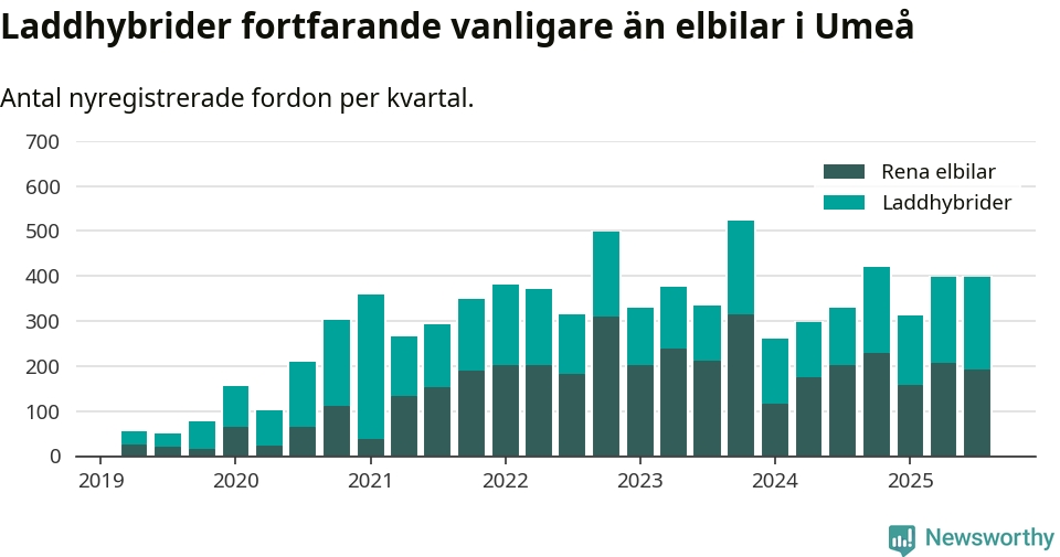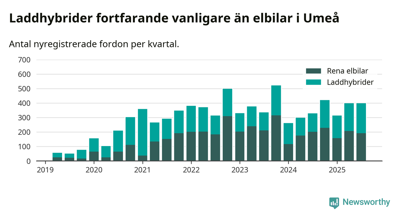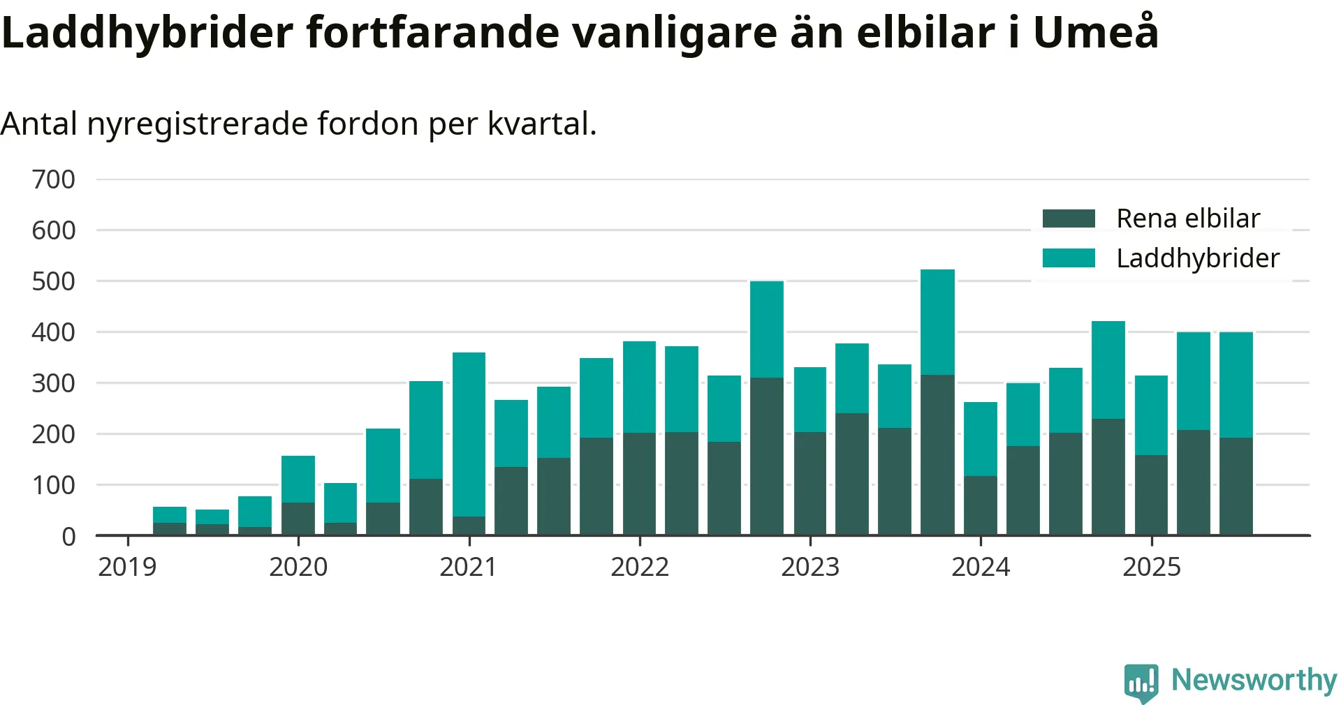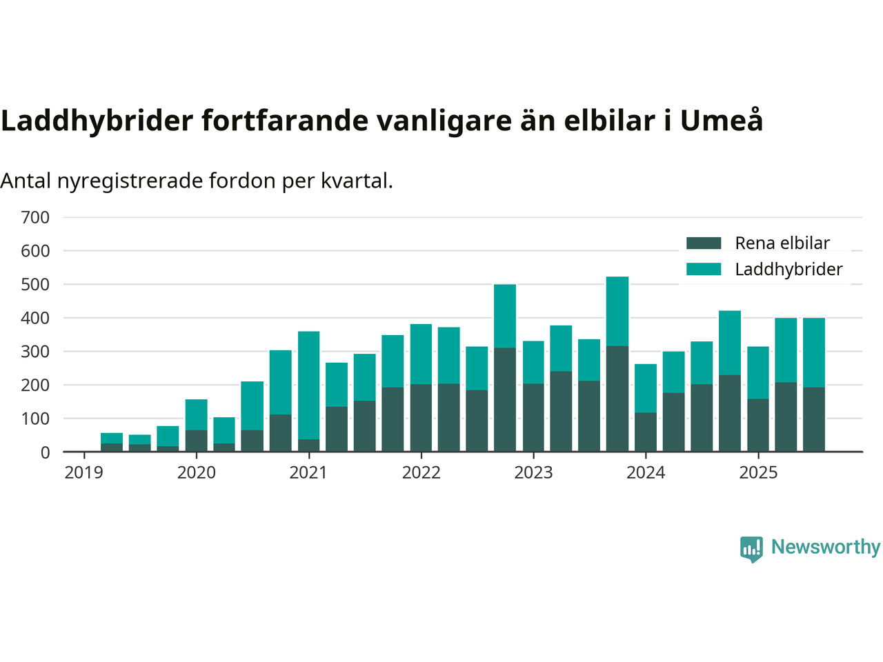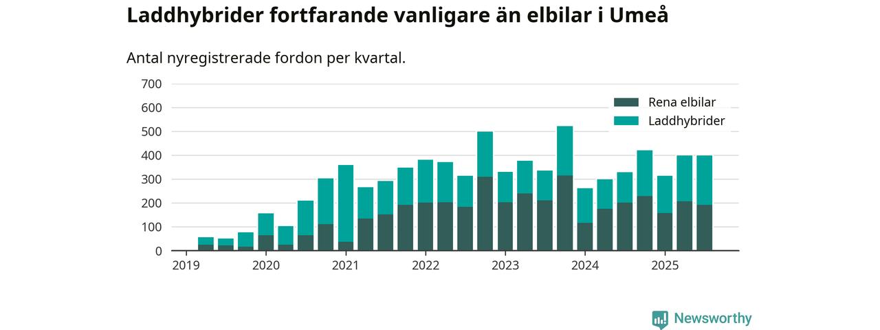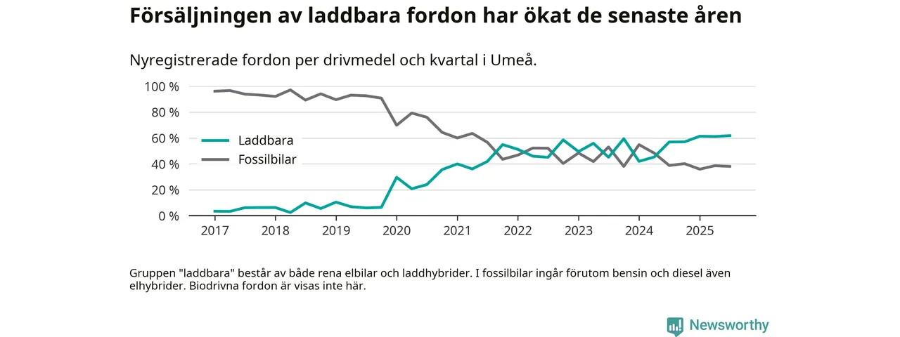 Under tredje kvartalet var sex av tio nyregistrerade bilar i Umeå kommun rena elbilar eller laddhybrider. Det är fler än något kvartal tidigare. I riket däremot minskade andelen laddbara bilar något. Framför allt elbilsförsäljningen har tappat fart.