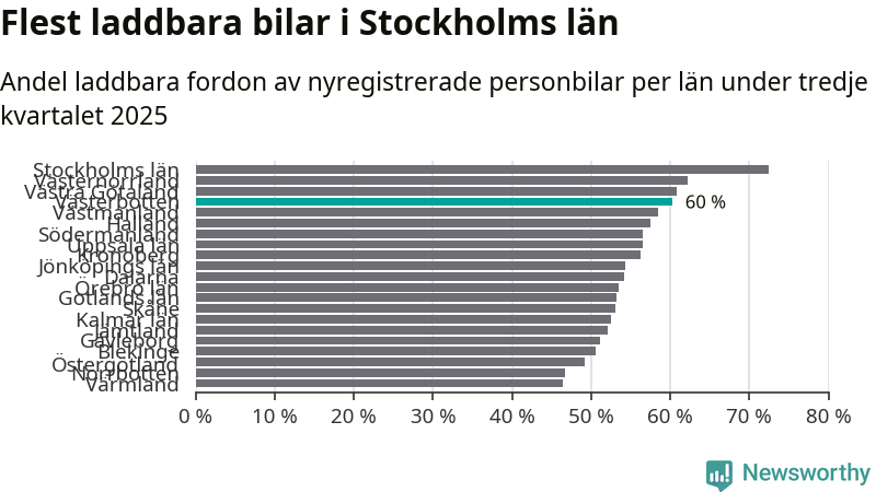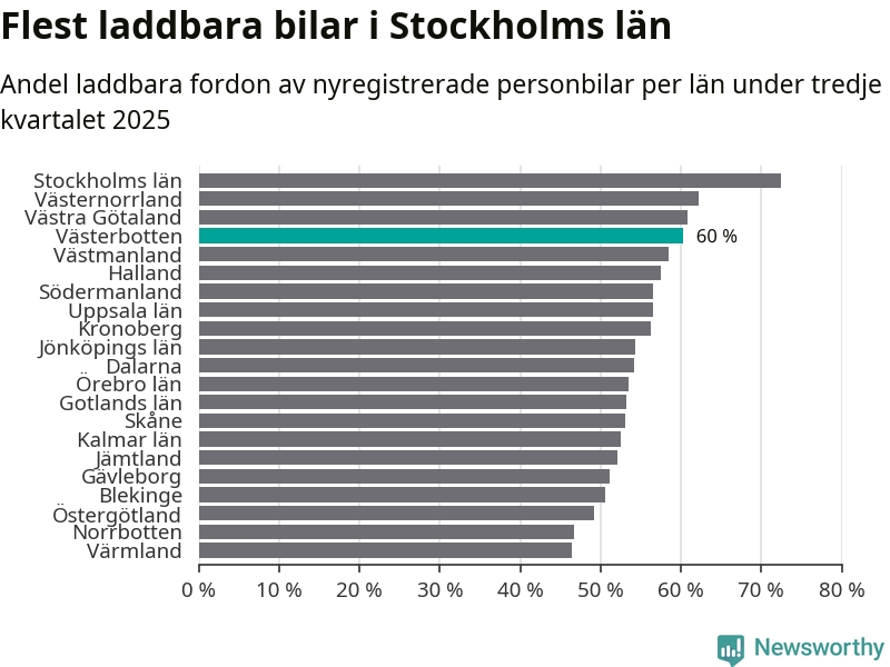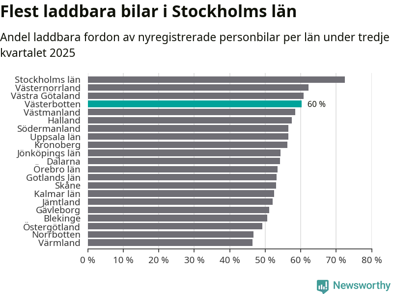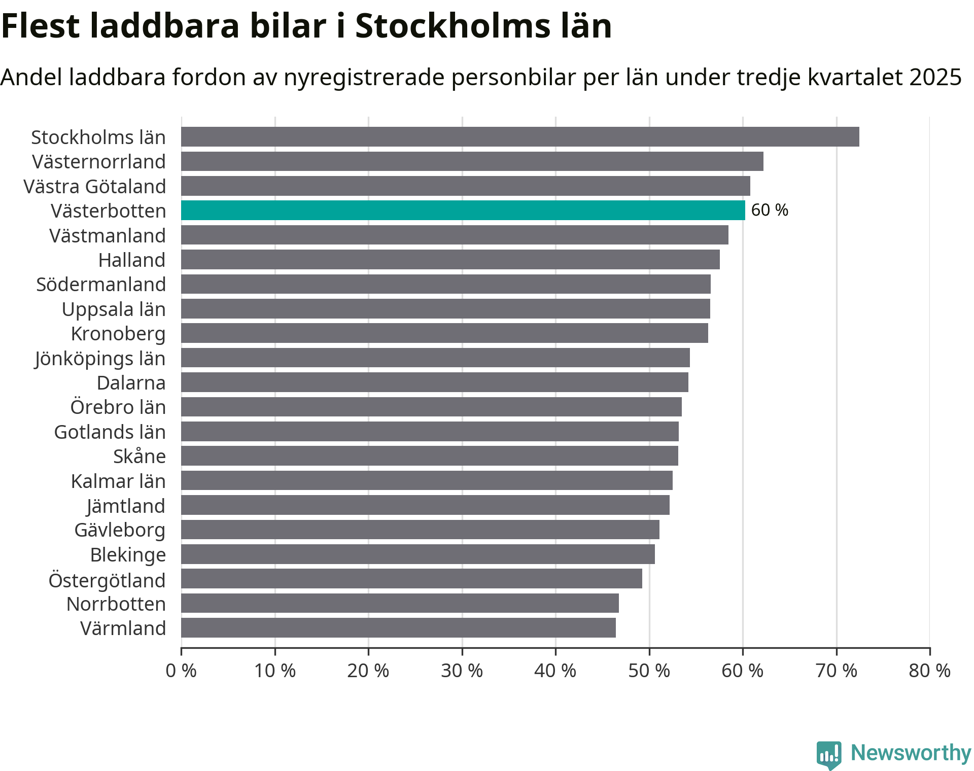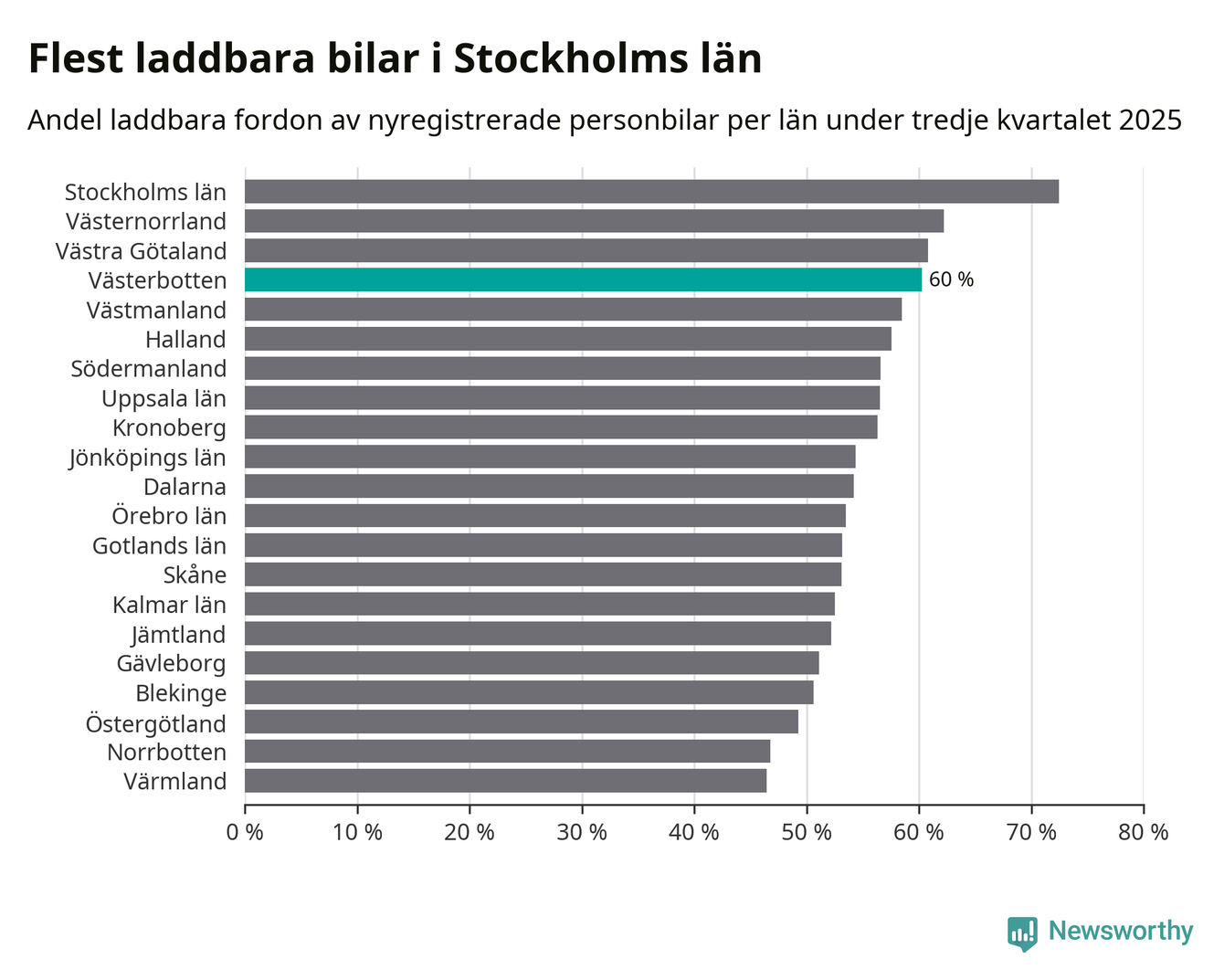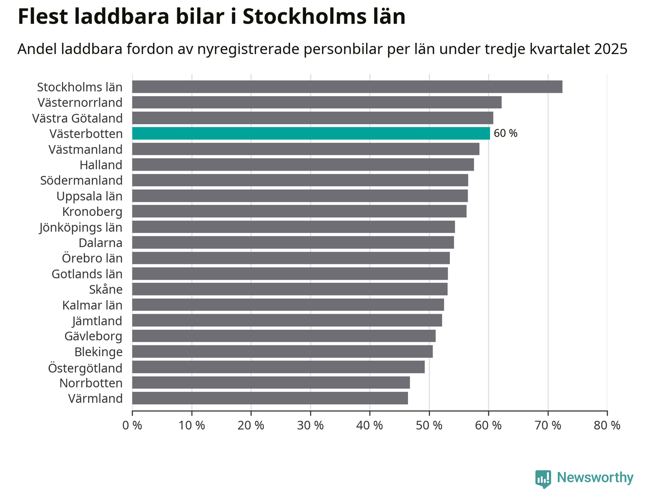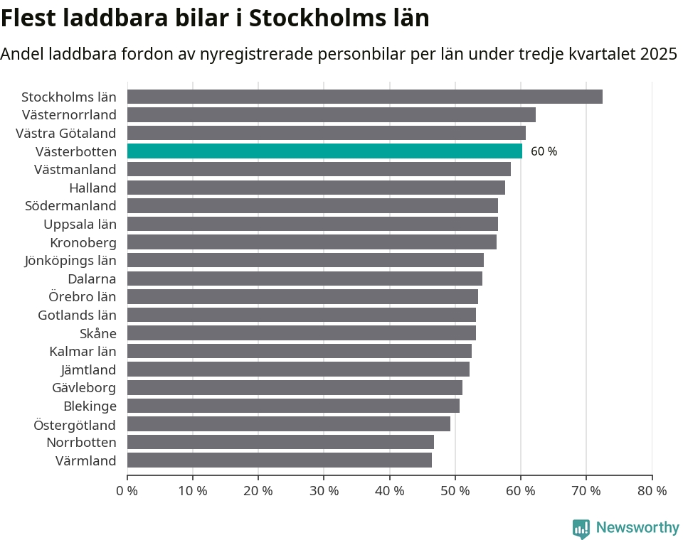 I hela landet var 62 procent av alla nya bilar laddbara under tredje kvartalet. Det är något färre än föregående kvartal (−0,5 procentenheter). I Västerbottens län var 60 procent av de nya bilarna laddbara, vilket är något fler än föregående kvartal (+0,2 procentenheter).