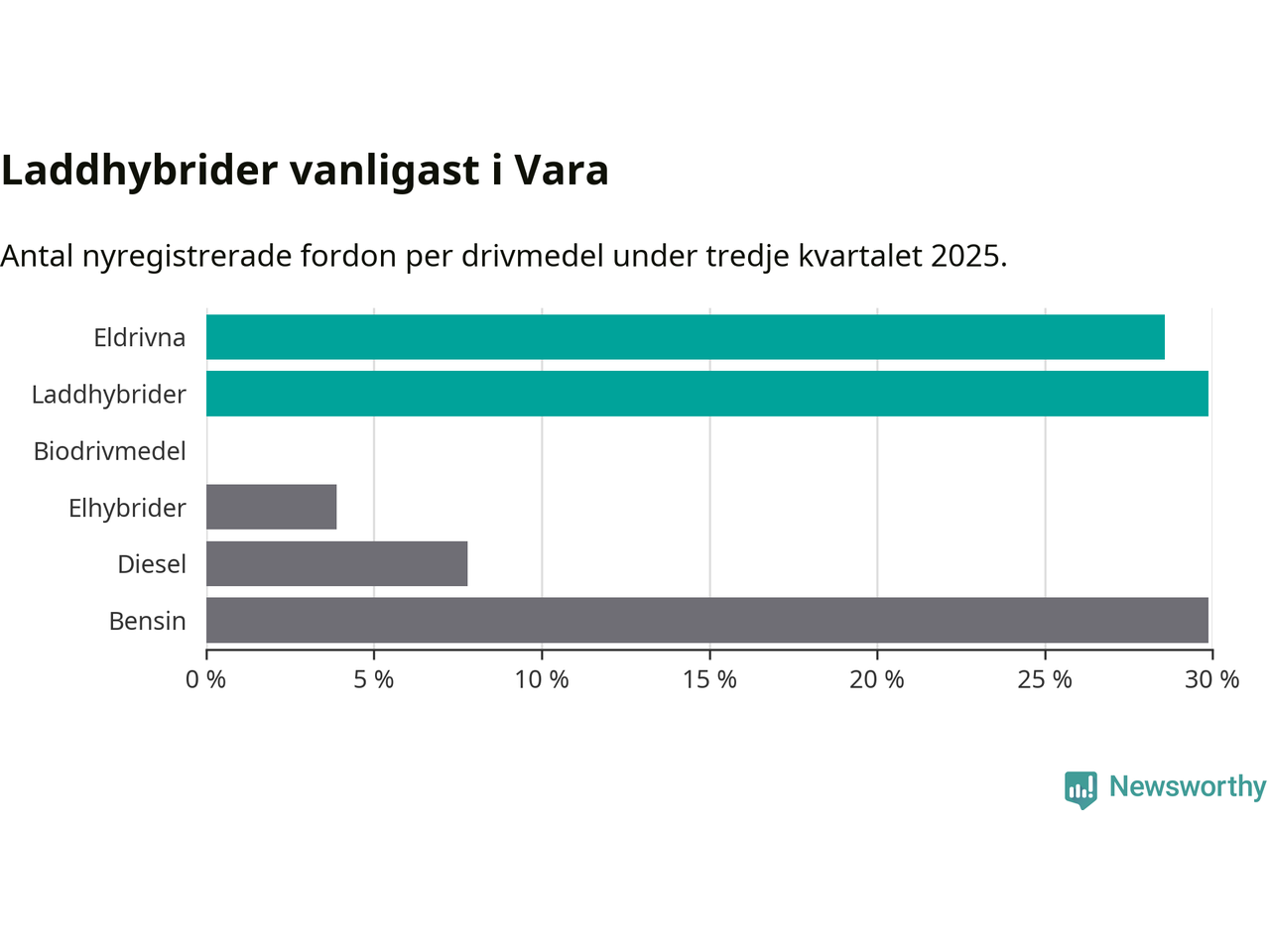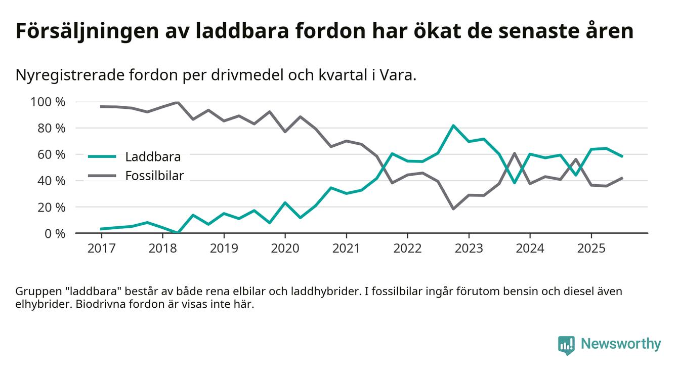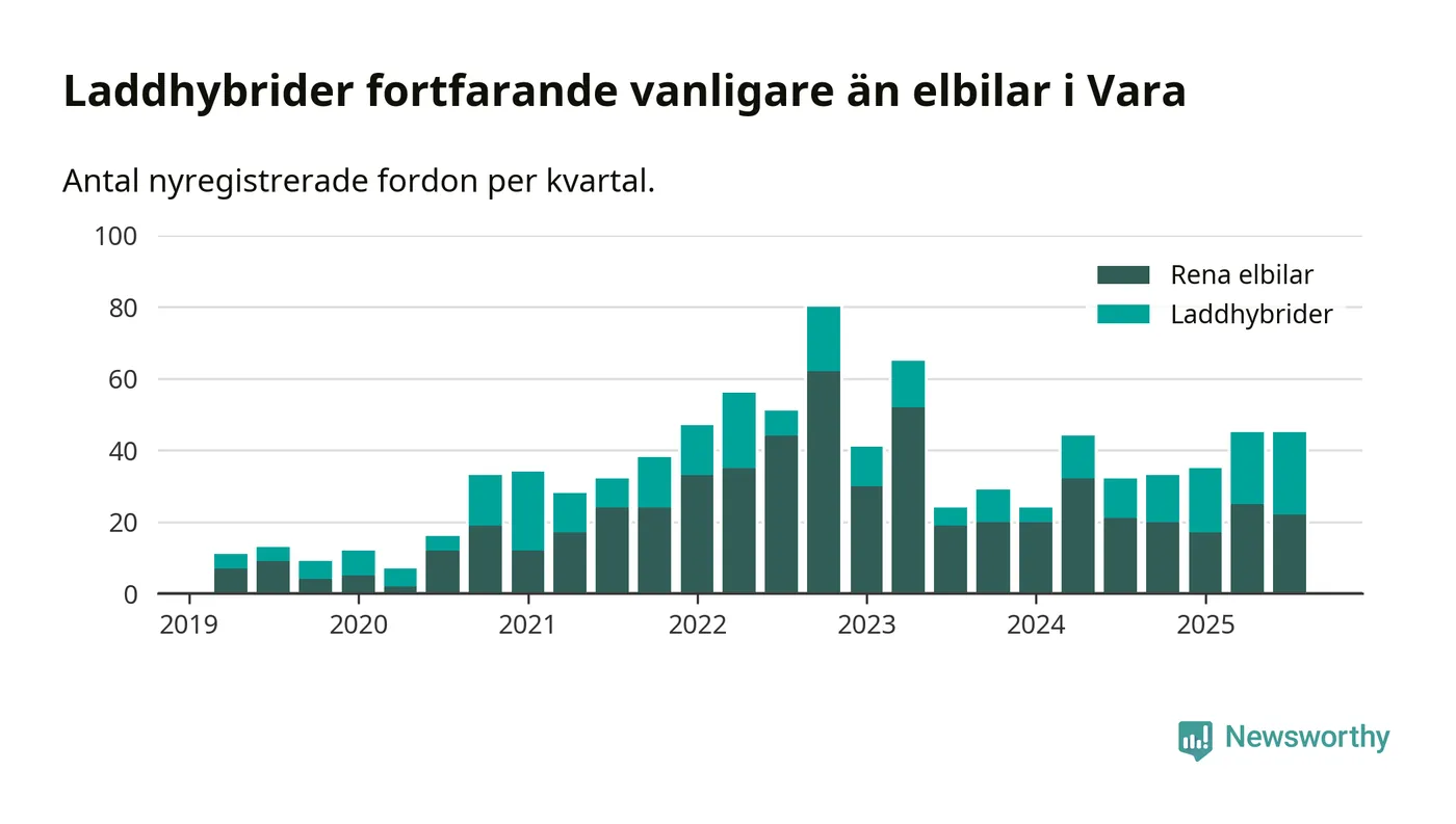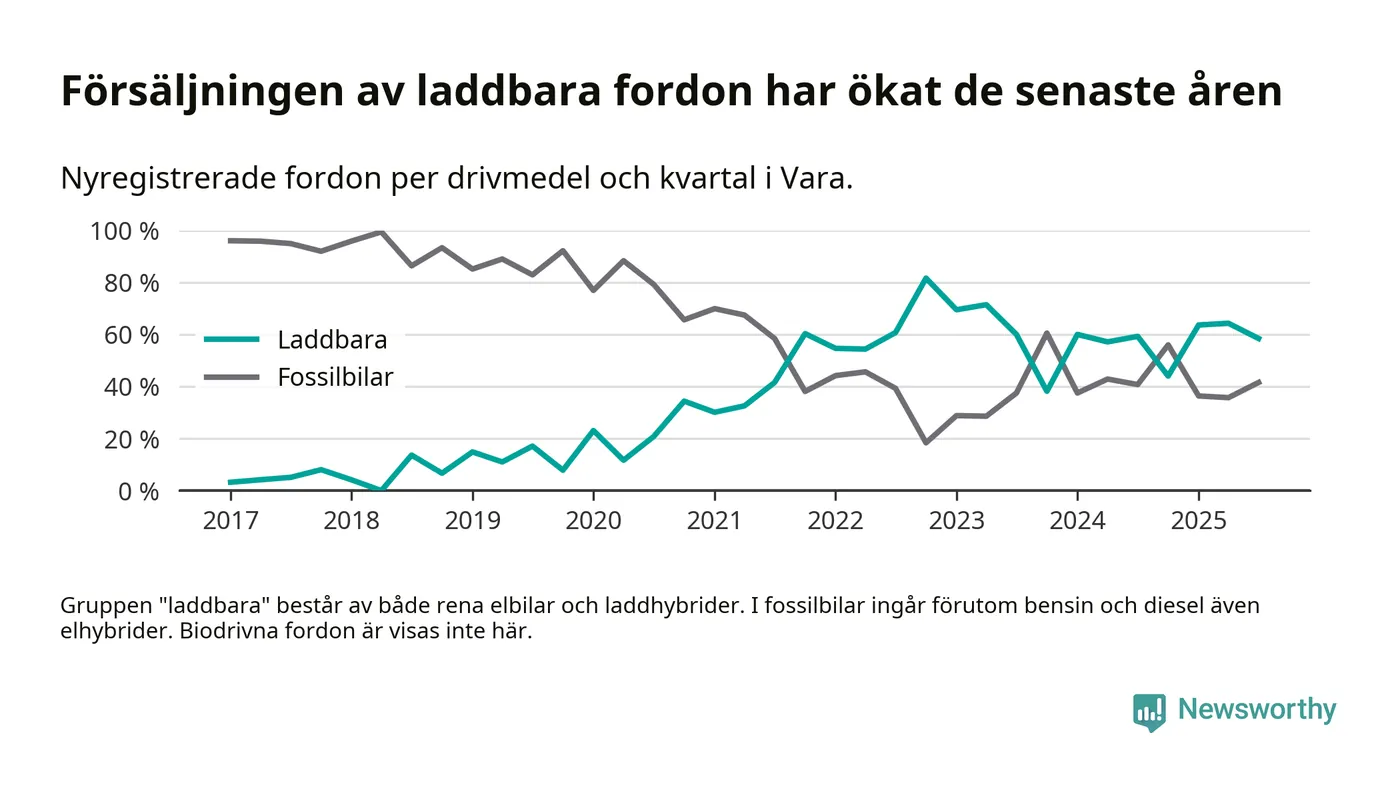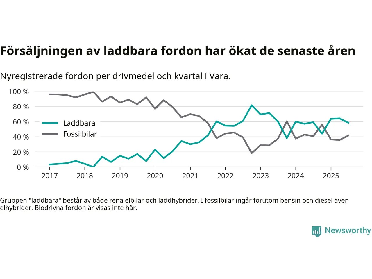 Under tredje kvartalet 2025 var 58 procent av alla nyregistrerade personbilar i Vara laddbara (sammanlagt registrerades 77 nya bilar). Merparten av de laddbara bilarna var så kallade laddhybrider, det vill säga fordon som går att ladda och köra på el, men som även har en förbränningsmotor. 29 procent av alla nya bilar var rena elbilar.
