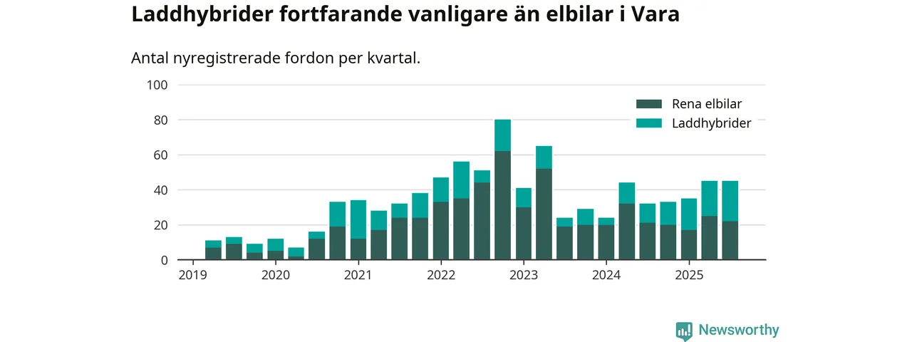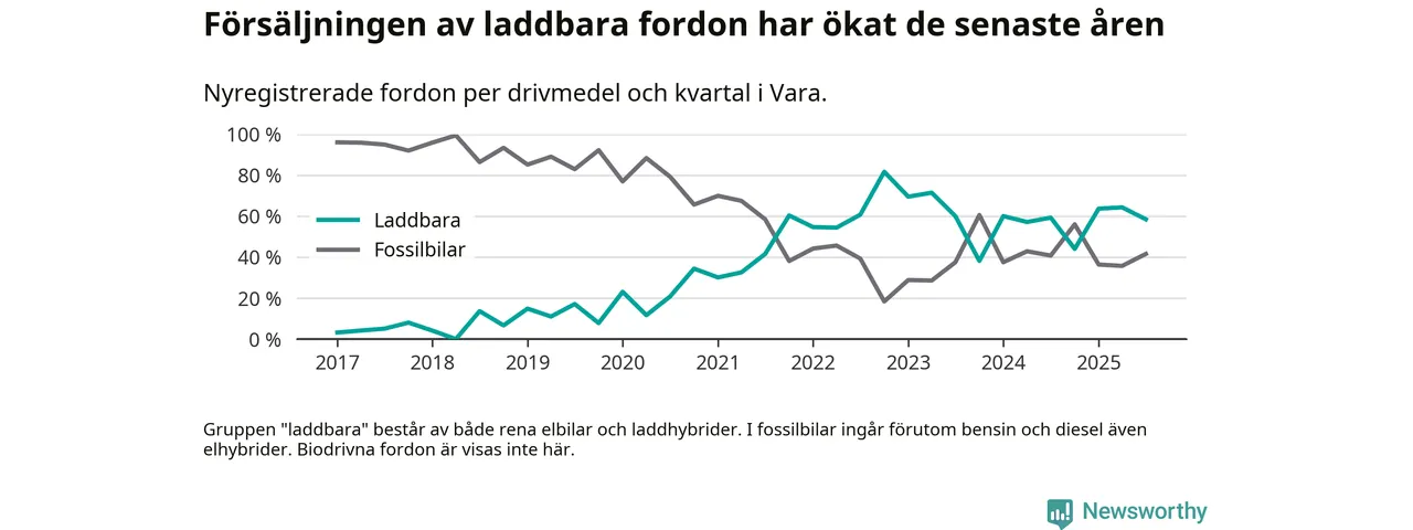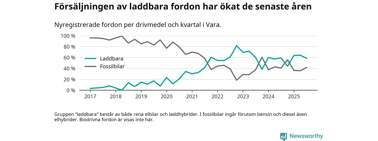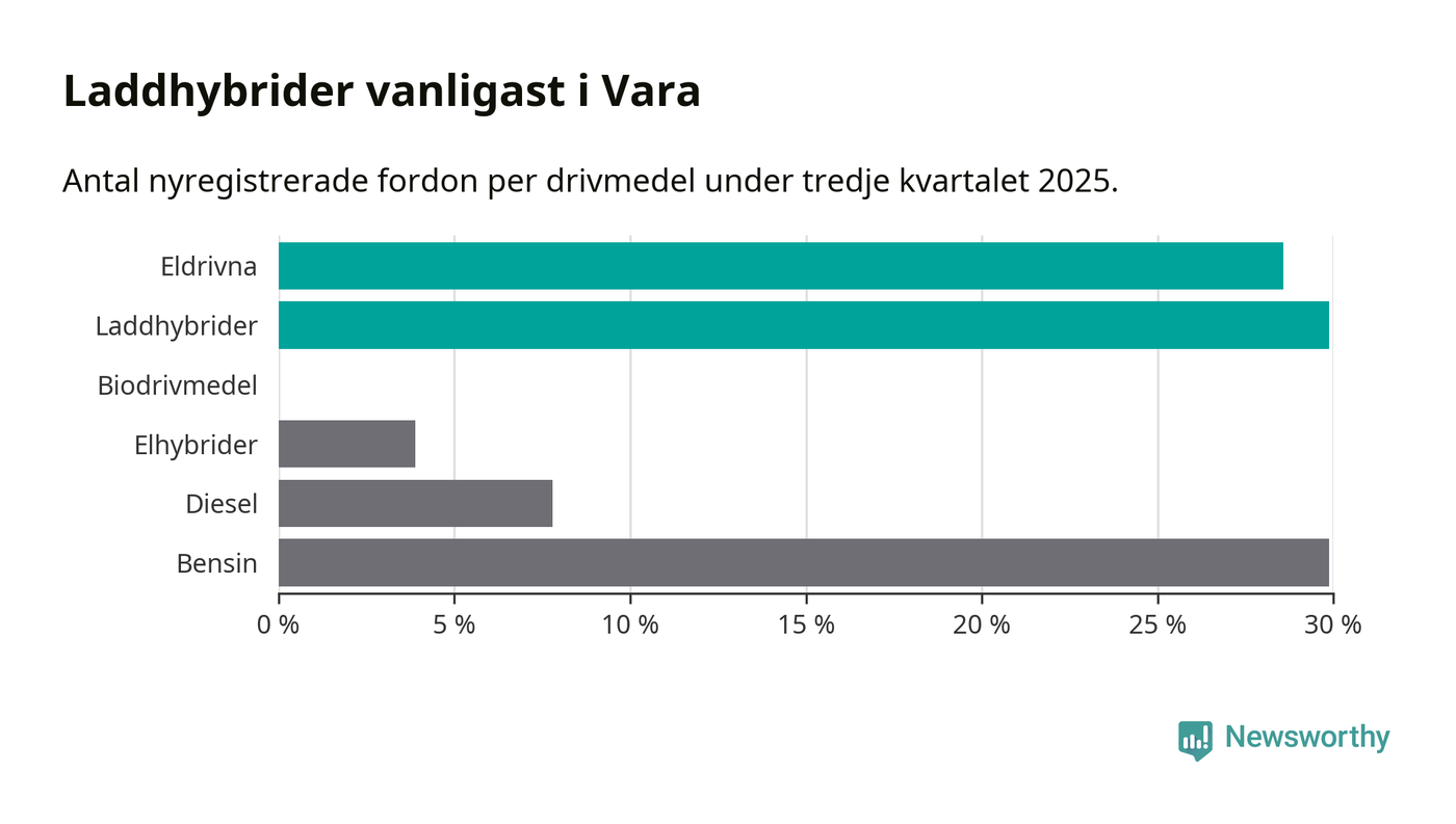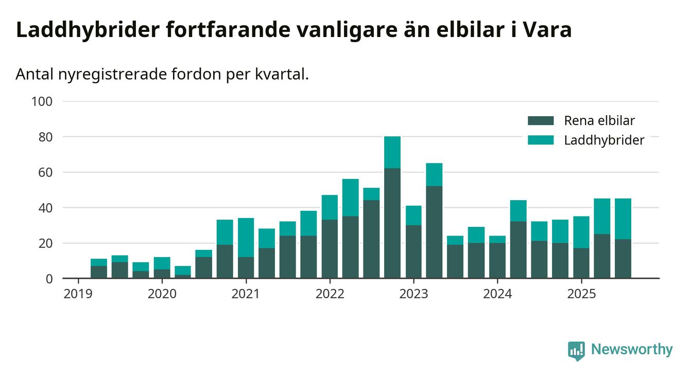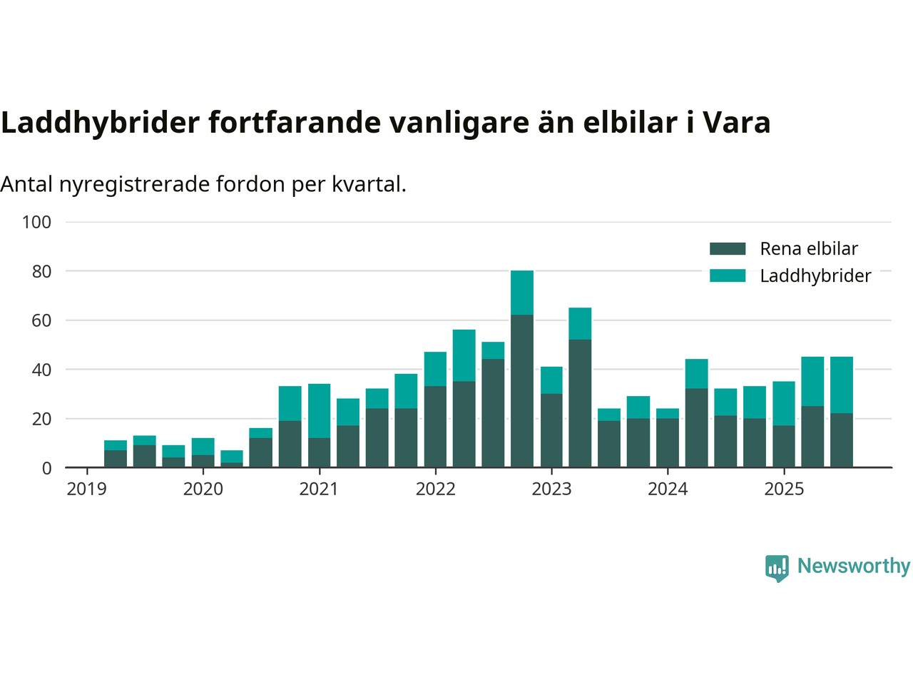 Under tredje kvartalet 2025 var 58 procent av alla nyregistrerade personbilar i Vara laddbara (sammanlagt registrerades 77 nya bilar). Merparten av de laddbara bilarna var så kallade laddhybrider, det vill säga fordon som går att ladda och köra på el, men som även har en förbränningsmotor. 29 procent av alla nya bilar var rena elbilar.