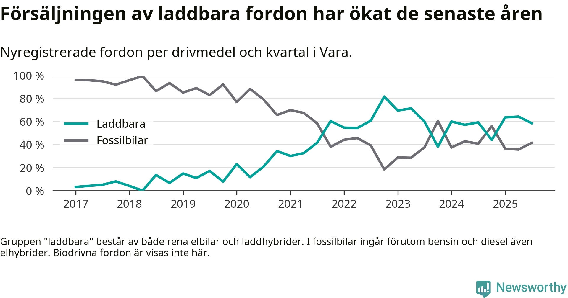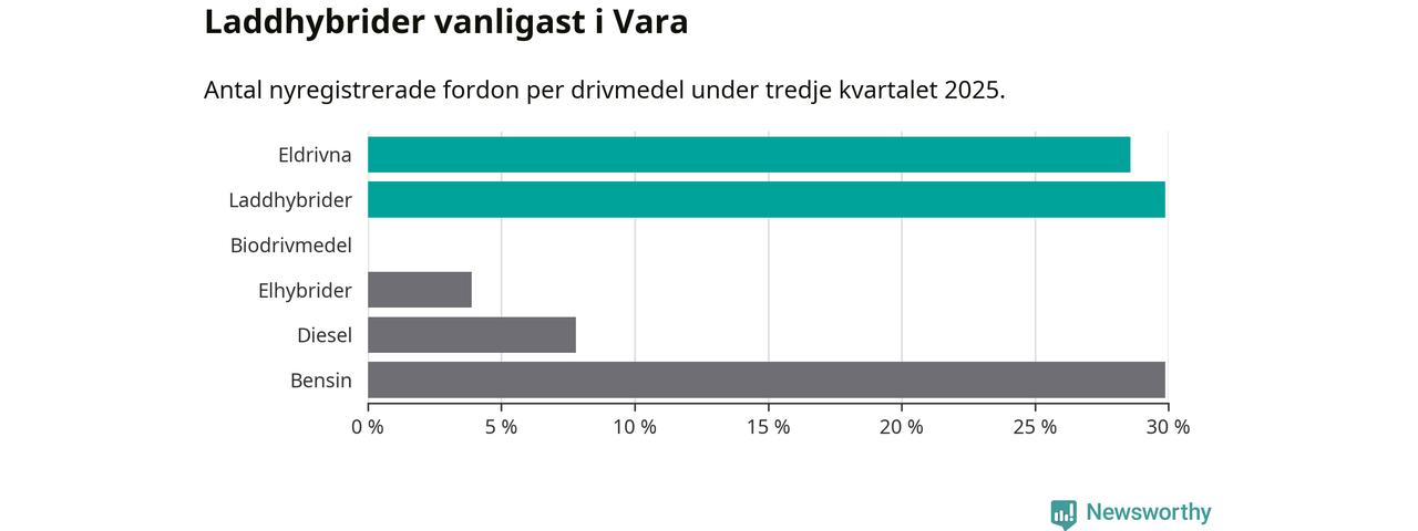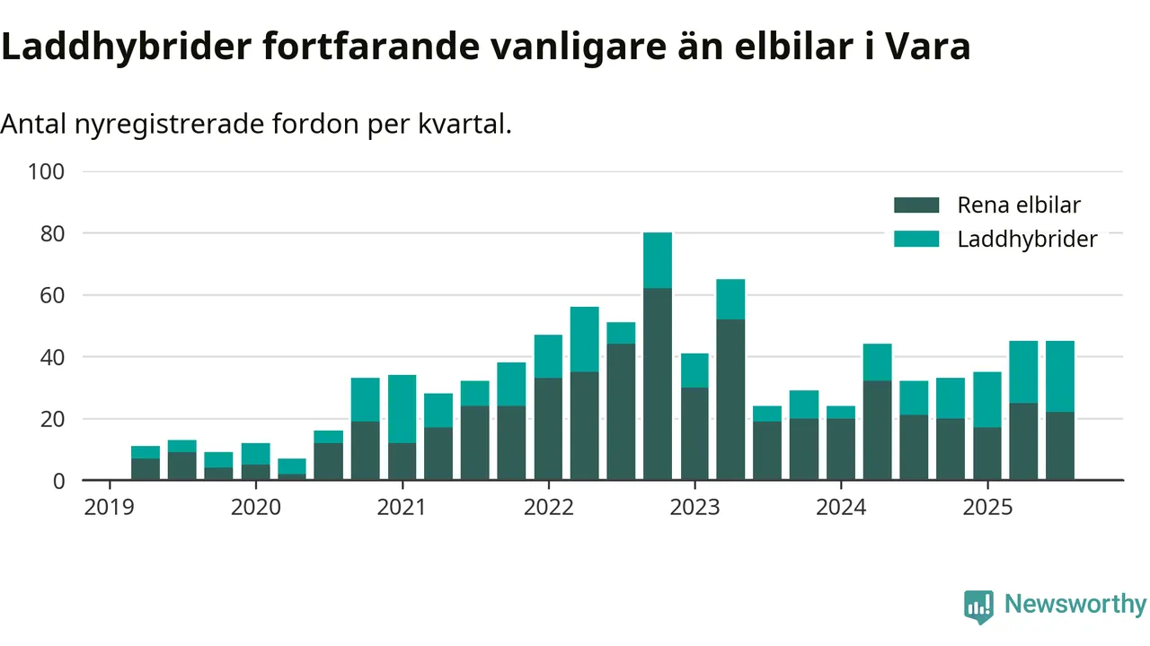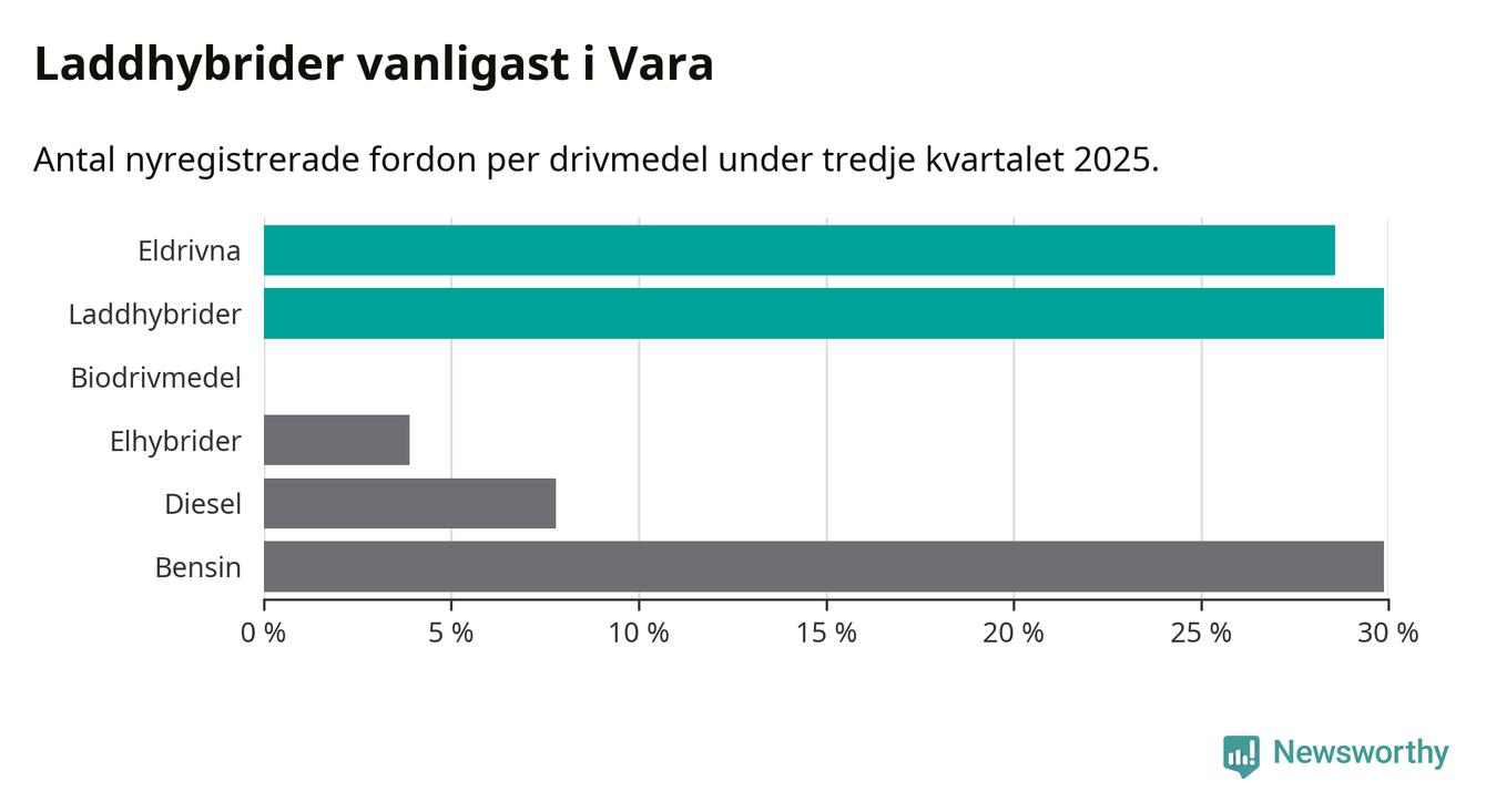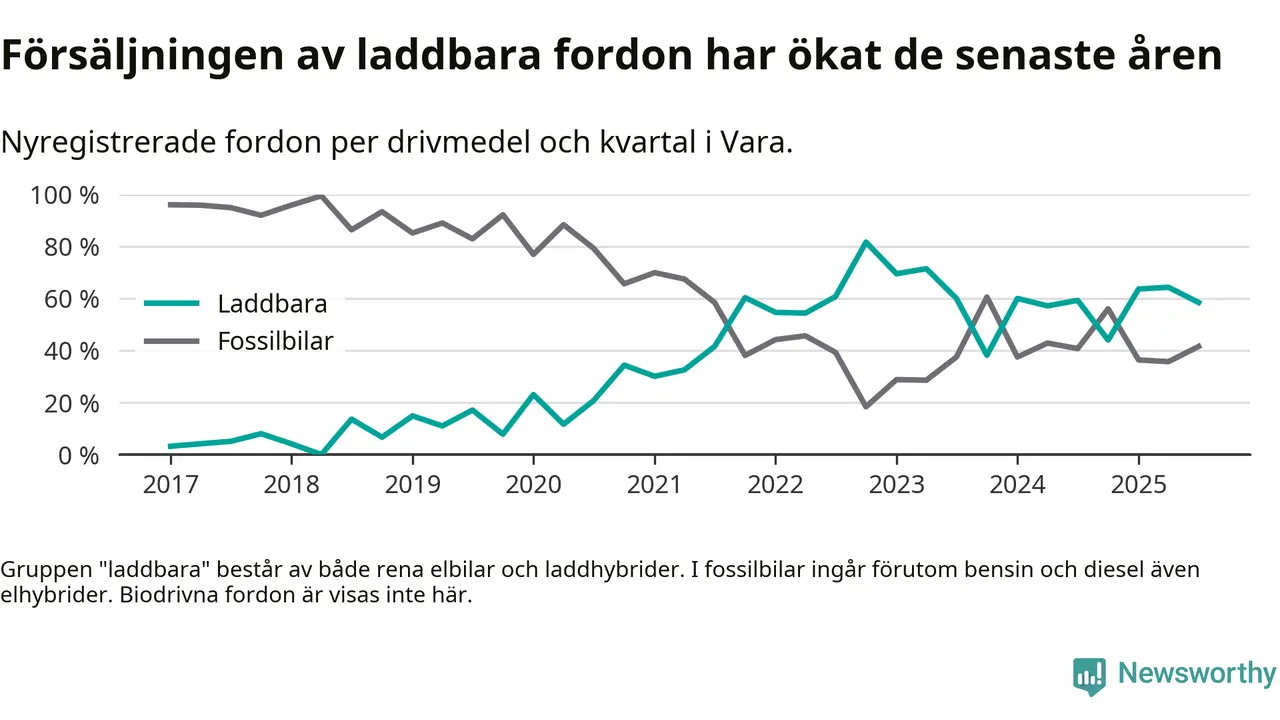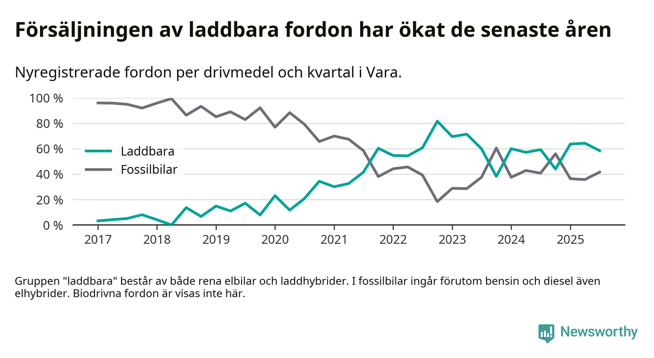 Under tredje kvartalet 2025 var 58 procent av alla nyregistrerade personbilar i Vara laddbara (sammanlagt registrerades 77 nya bilar). Merparten av de laddbara bilarna var så kallade laddhybrider, det vill säga fordon som går att ladda och köra på el, men som även har en förbränningsmotor. 29 procent av alla nya bilar var rena elbilar.