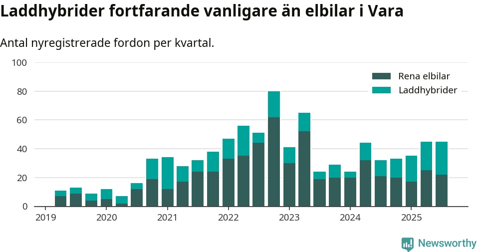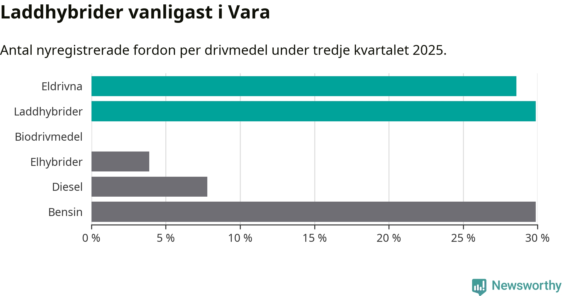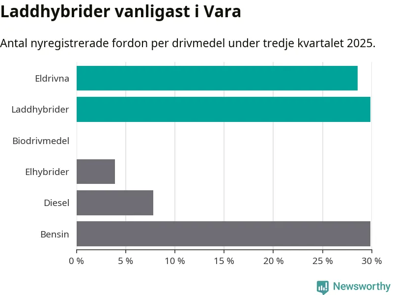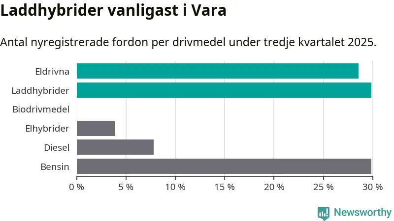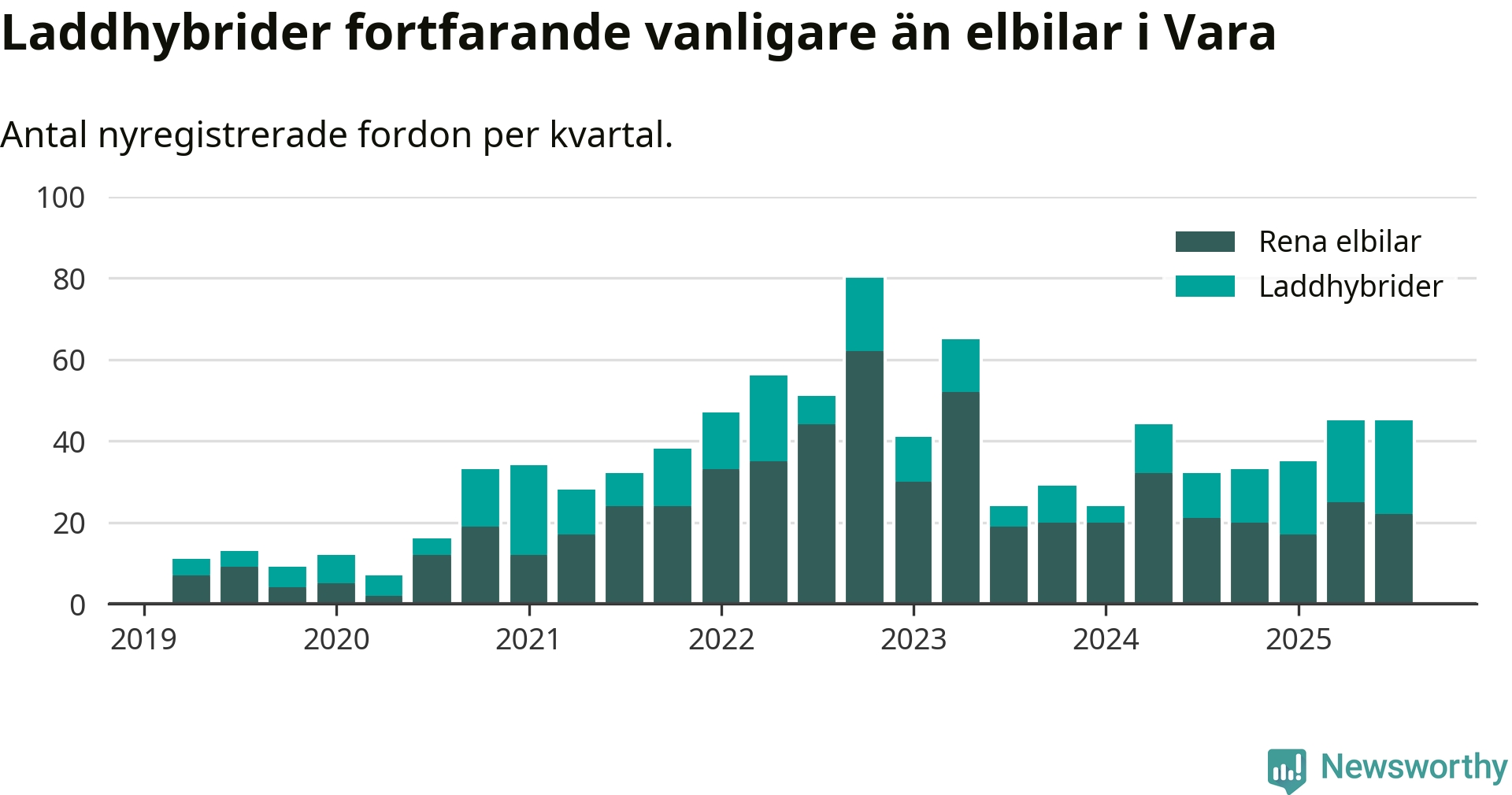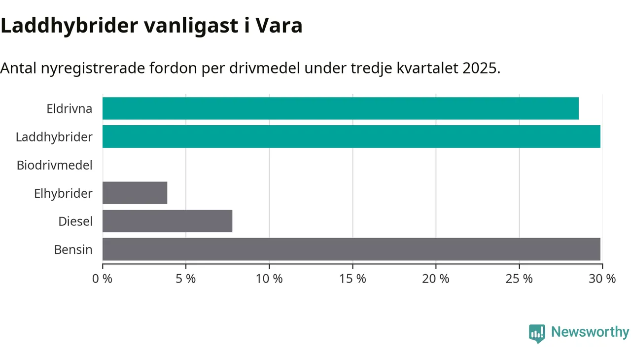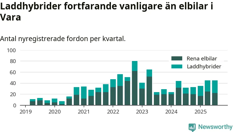 Under tredje kvartalet 2025 var 58 procent av alla nyregistrerade personbilar i Vara laddbara (sammanlagt registrerades 77 nya bilar). Merparten av de laddbara bilarna var så kallade laddhybrider, det vill säga fordon som går att ladda och köra på el, men som även har en förbränningsmotor. 29 procent av alla nya bilar var rena elbilar.
