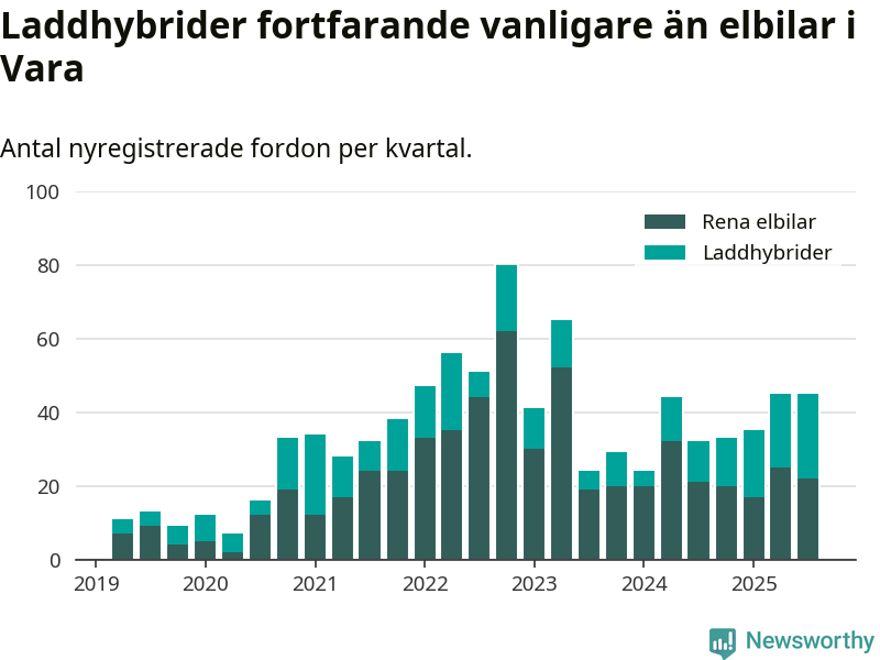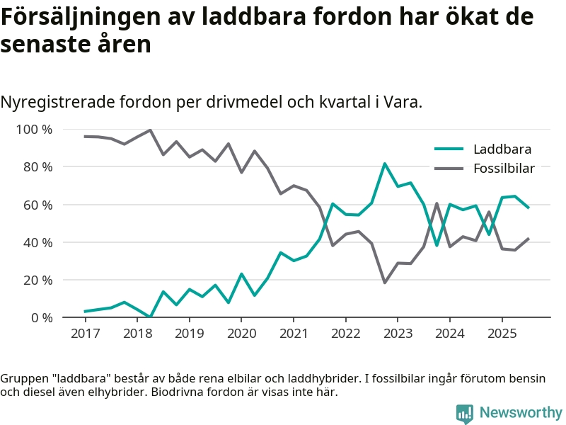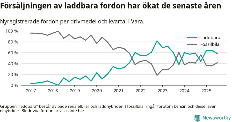I Vara minskade andelen laddbara bilar under tredje kvartalet jämfört med kvartalet innan. Nyregistreringen peakade under fjärde kvartalet 2022 då 82 procent av de nya bilarna var laddbara.