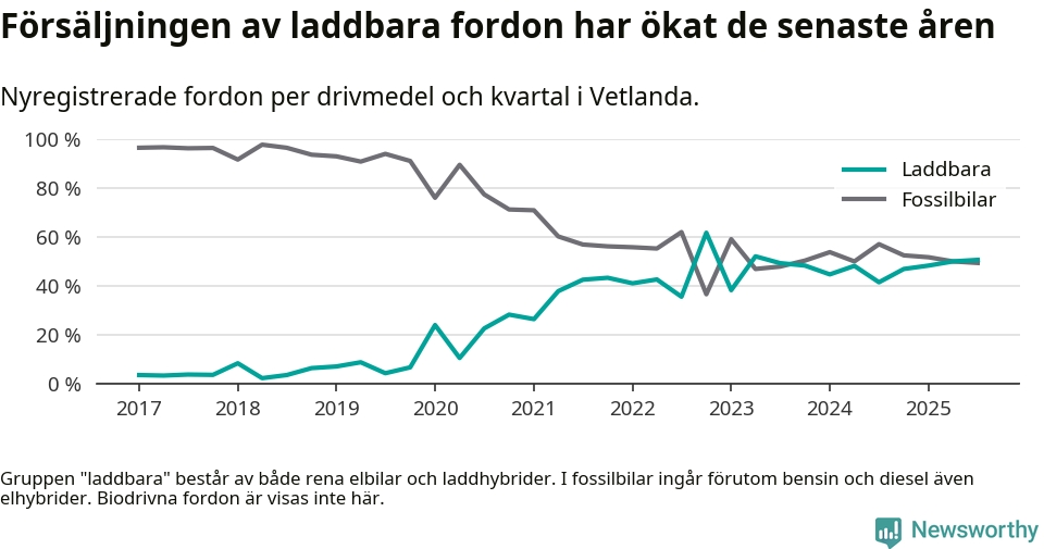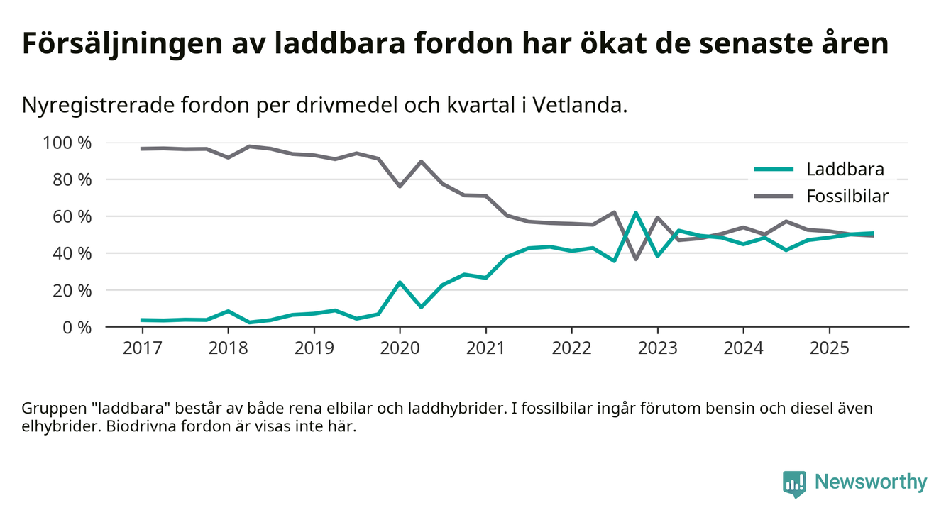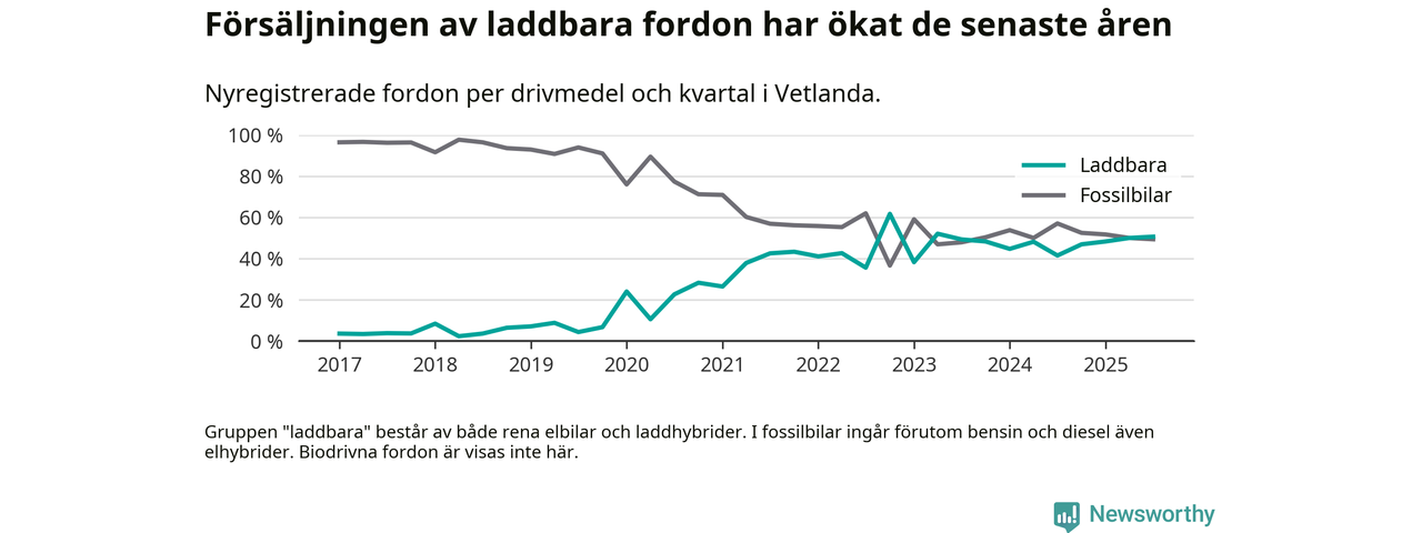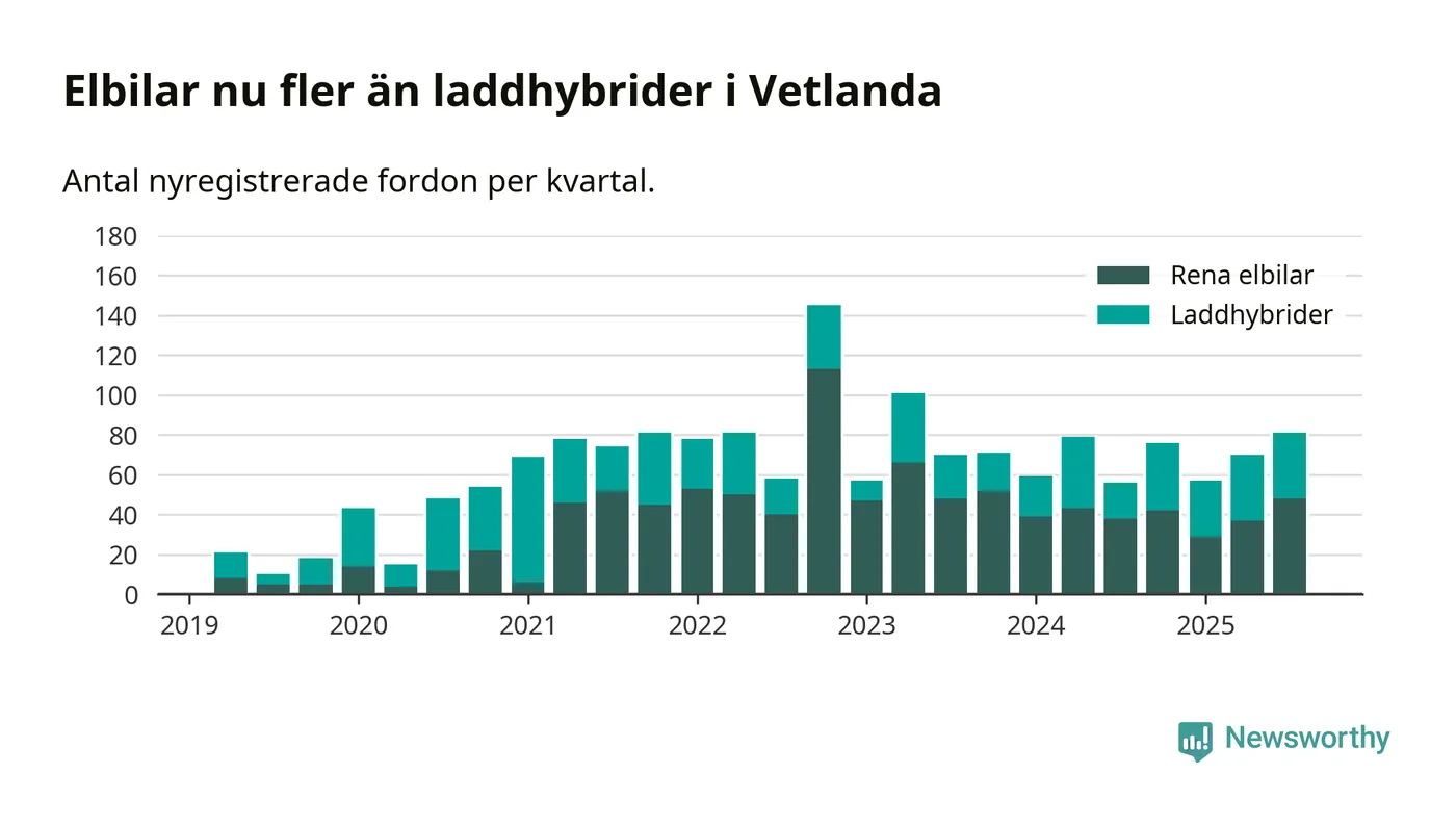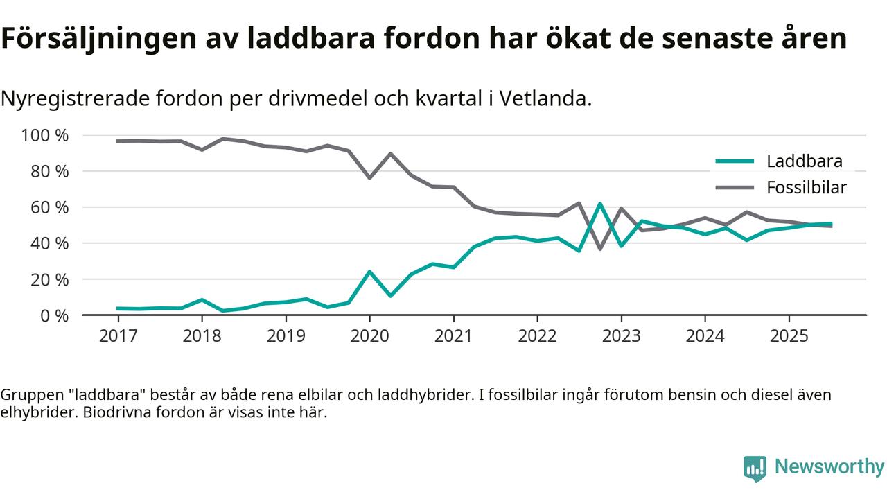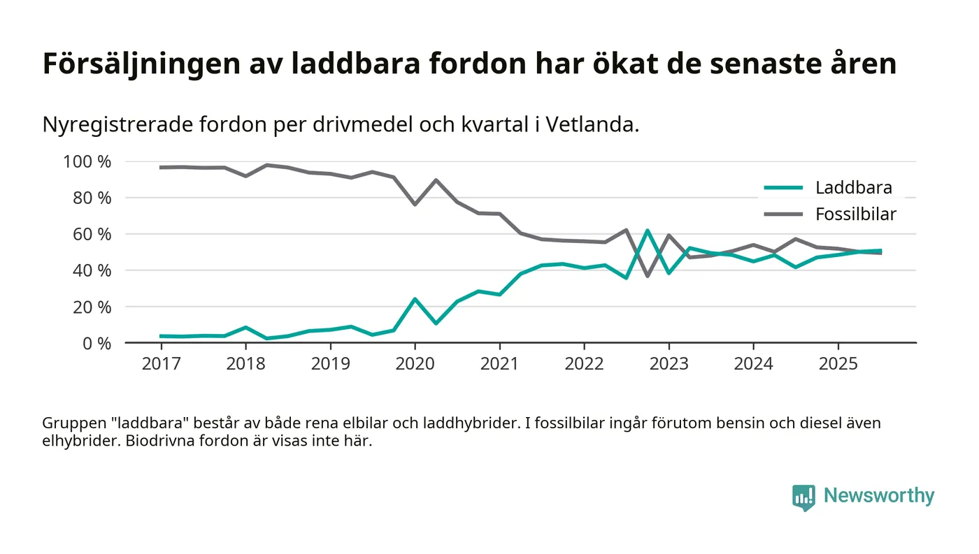 Under tredje kvartalet 2025 var 51 procent av alla nyregistrerade personbilar i Vetlanda laddbara (sammanlagt registrerades 160 nya bilar). Merparten av de laddbara bilarna var rena elbilar (30 procent av alla).