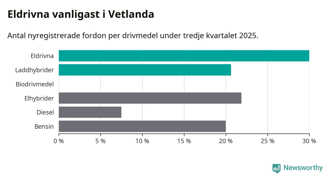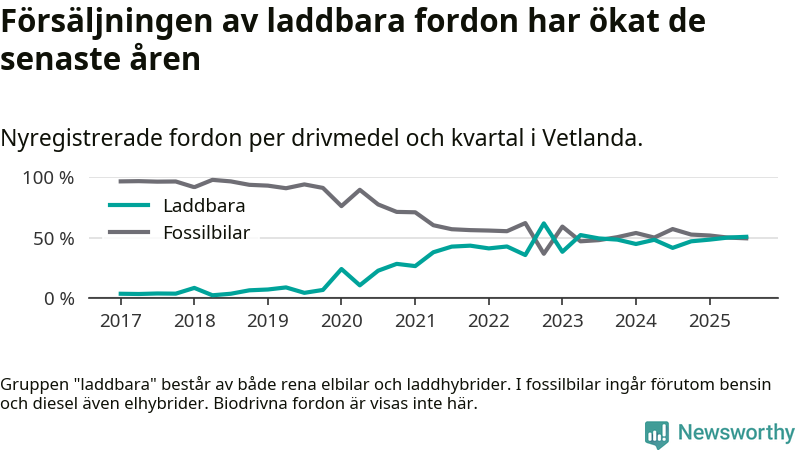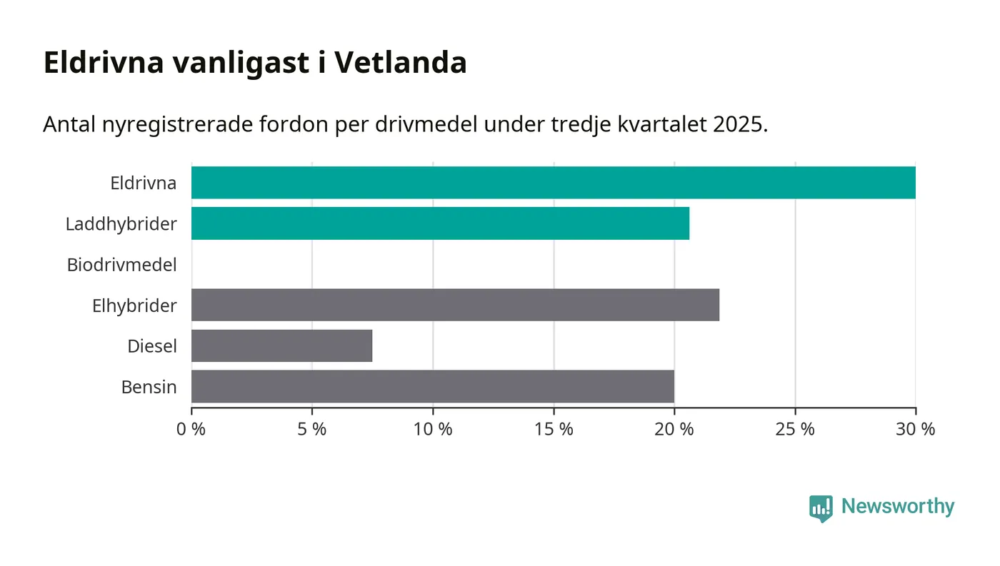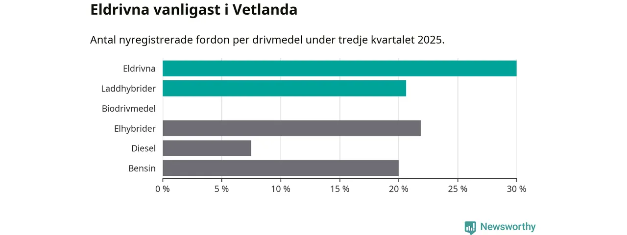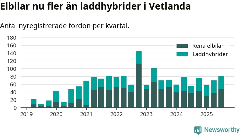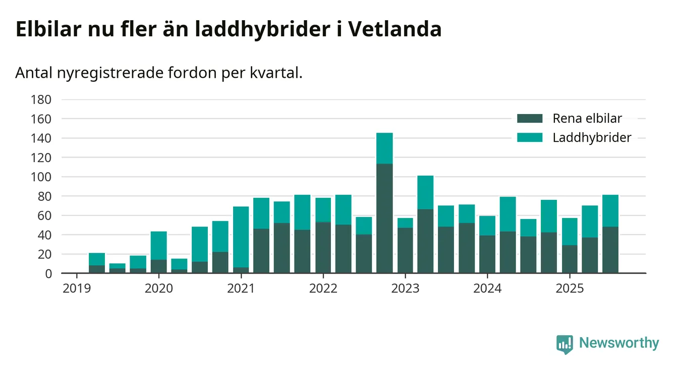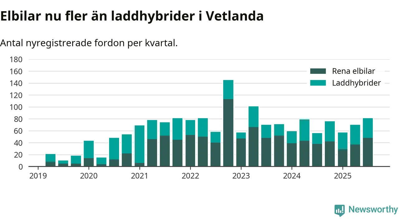 Under tredje kvartalet 2025 var 51 procent av alla nyregistrerade personbilar i Vetlanda laddbara (sammanlagt registrerades 160 nya bilar). Merparten av de laddbara bilarna var rena elbilar (30 procent av alla).