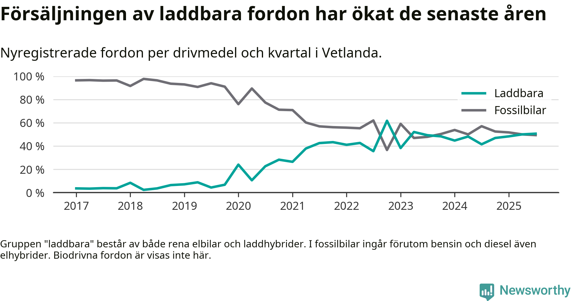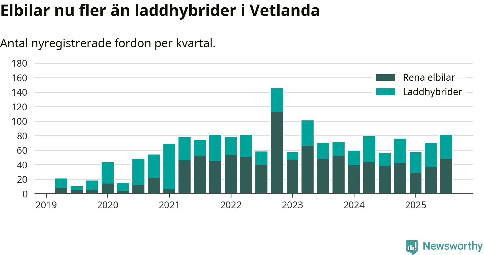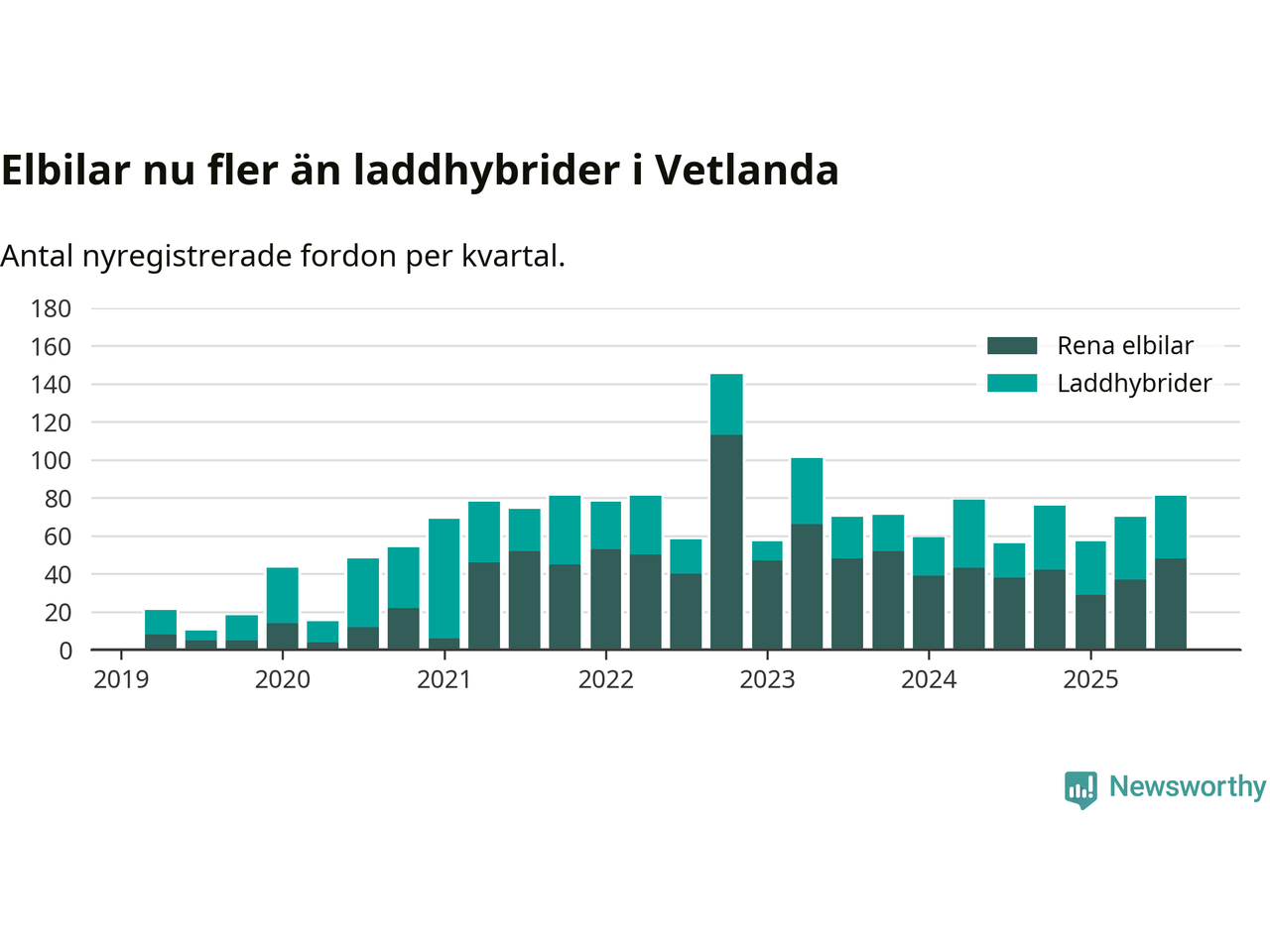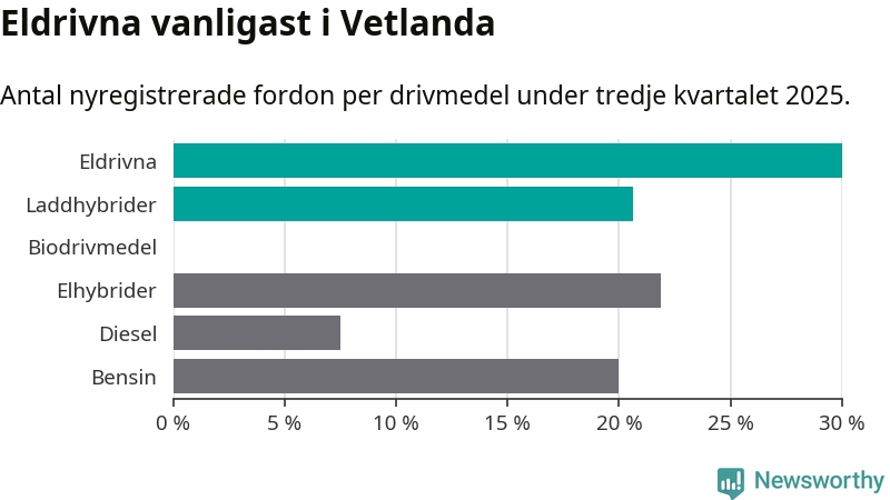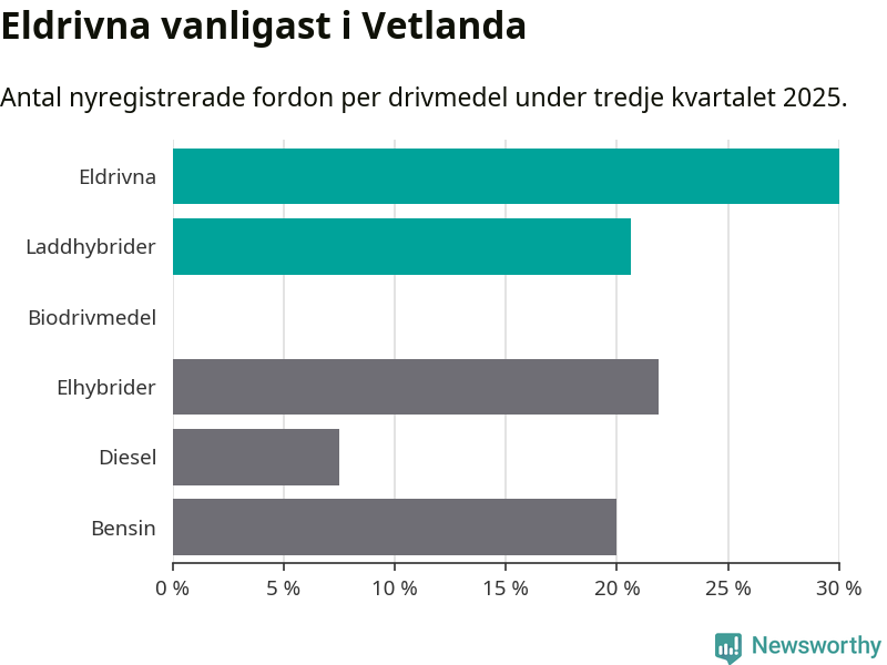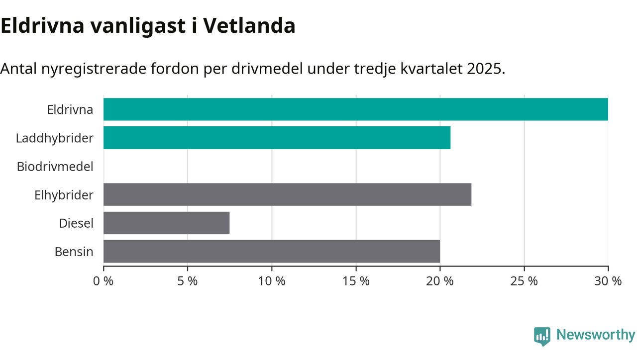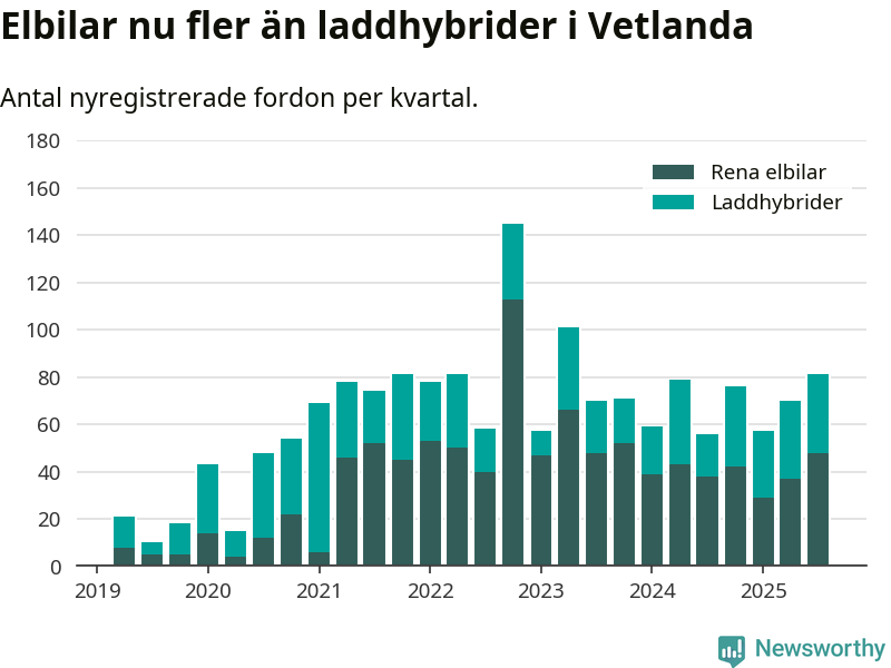 Under tredje kvartalet 2025 var 51 procent av alla nyregistrerade personbilar i Vetlanda laddbara (sammanlagt registrerades 160 nya bilar). Merparten av de laddbara bilarna var rena elbilar (30 procent av alla).
