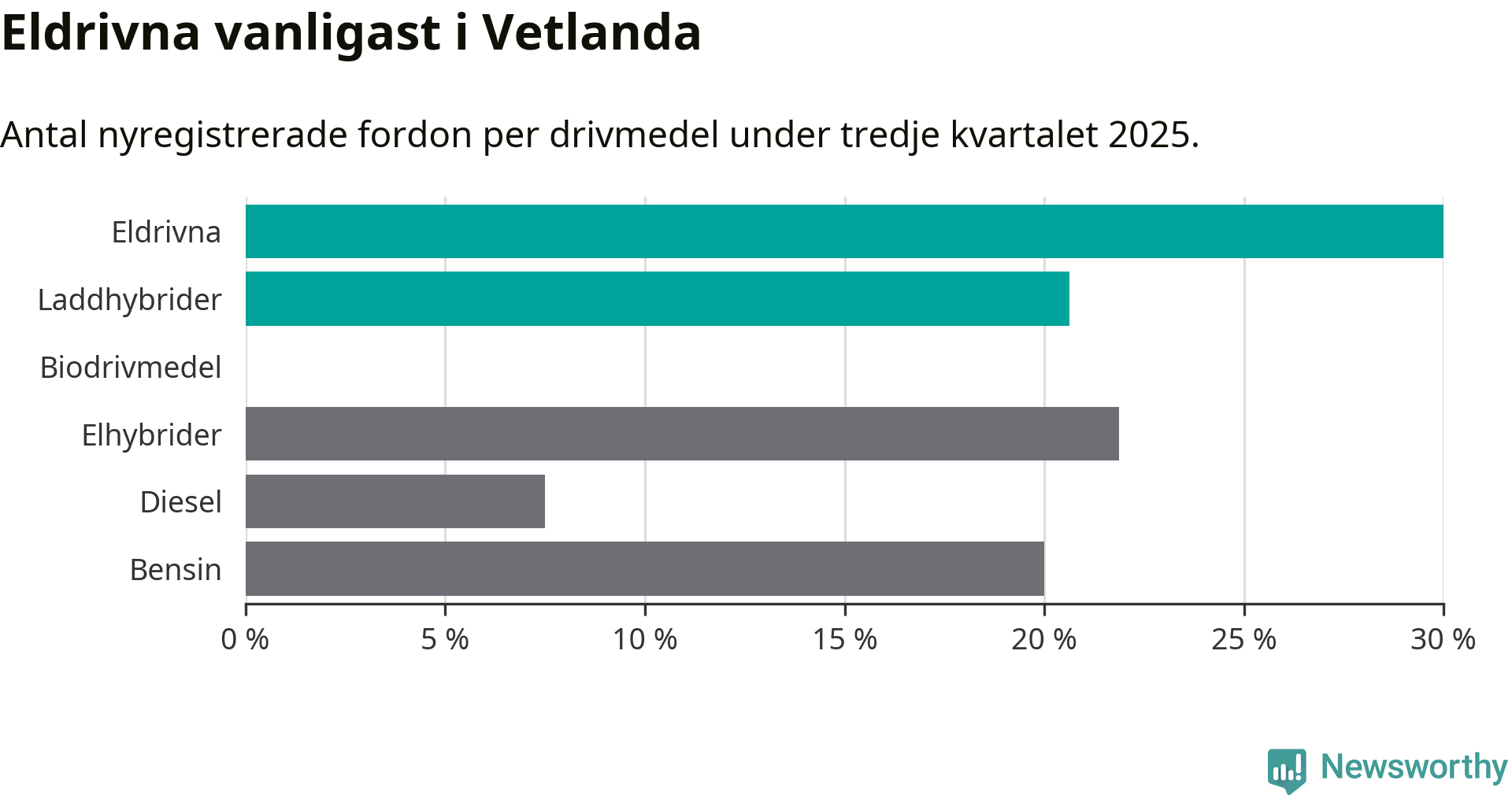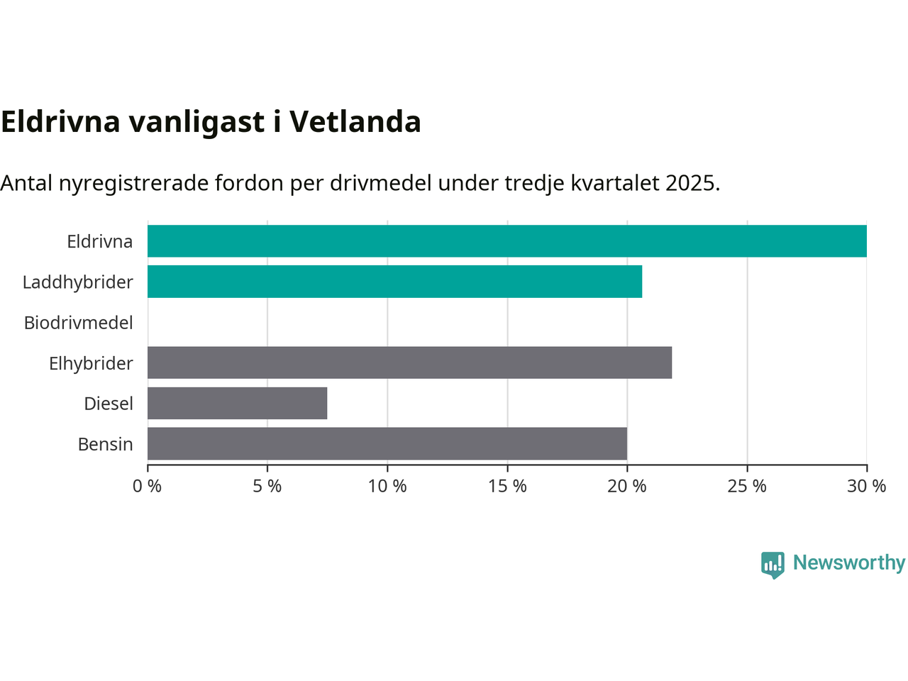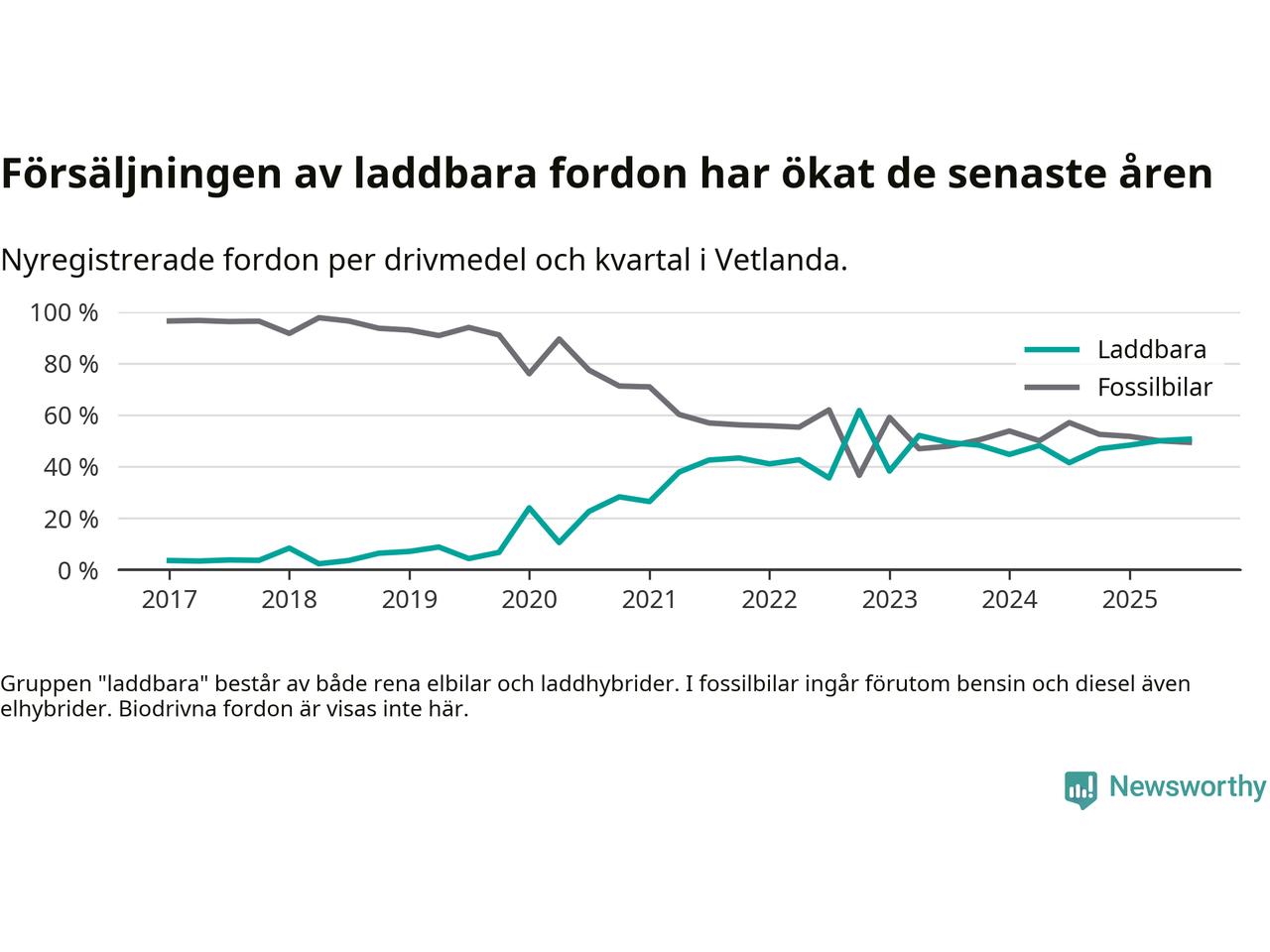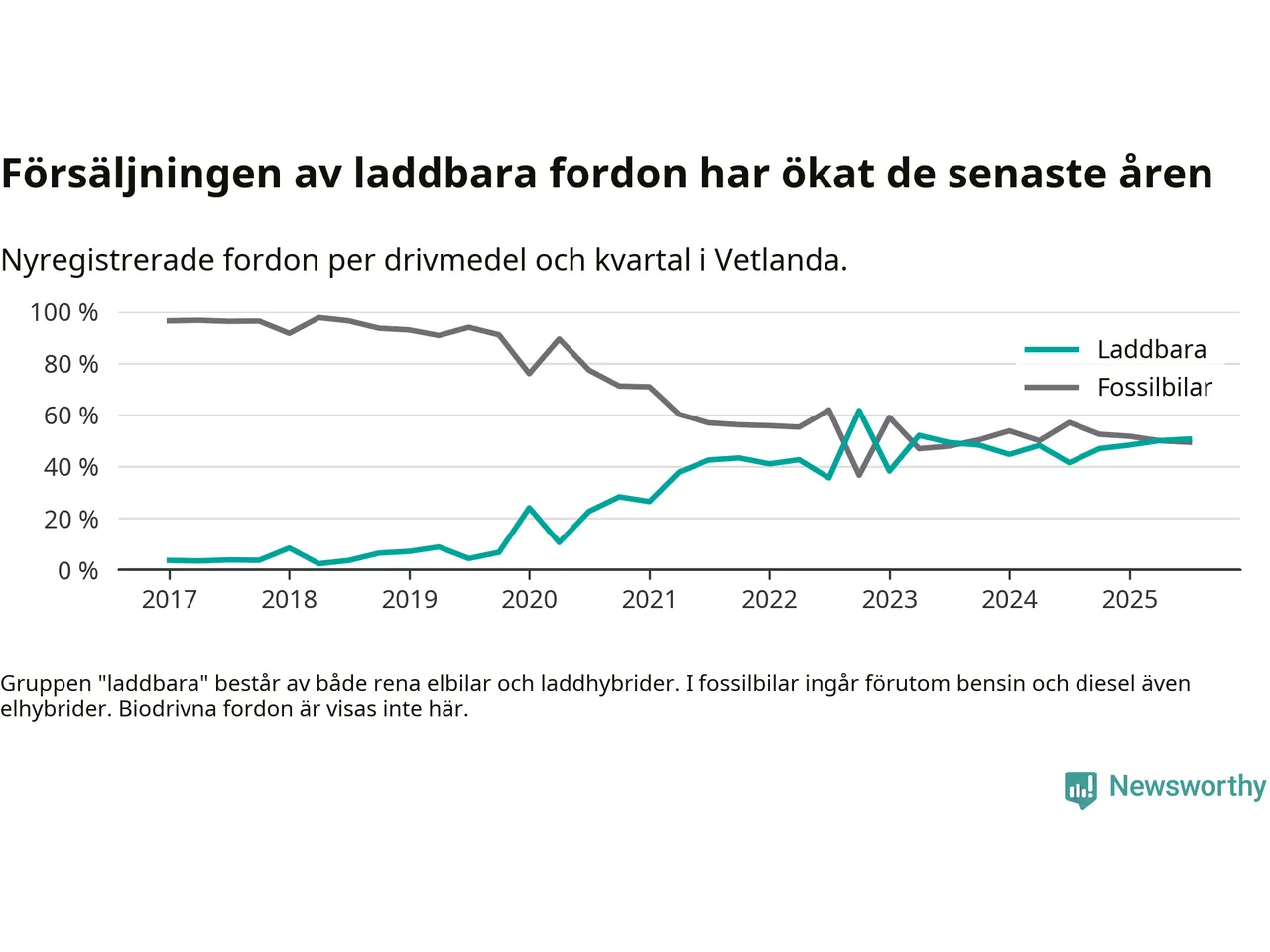 Under tredje kvartalet 2025 var 51 procent av alla nyregistrerade personbilar i Vetlanda laddbara (sammanlagt registrerades 160 nya bilar). Merparten av de laddbara bilarna var rena elbilar (30 procent av alla).