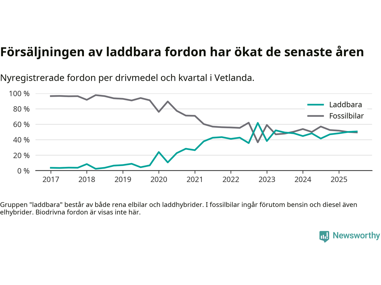 Under tredje kvartalet var hälften av alla nyregistrerade bilar i Vetlanda kommun rena elbilar eller laddhybrider, en ökning jämfört med kvartalet innan. I riket däremot minskade andelen laddbara bilar något. Framför allt elbilsförsäljningen har tappat fart.
