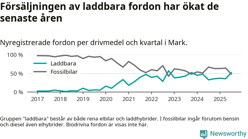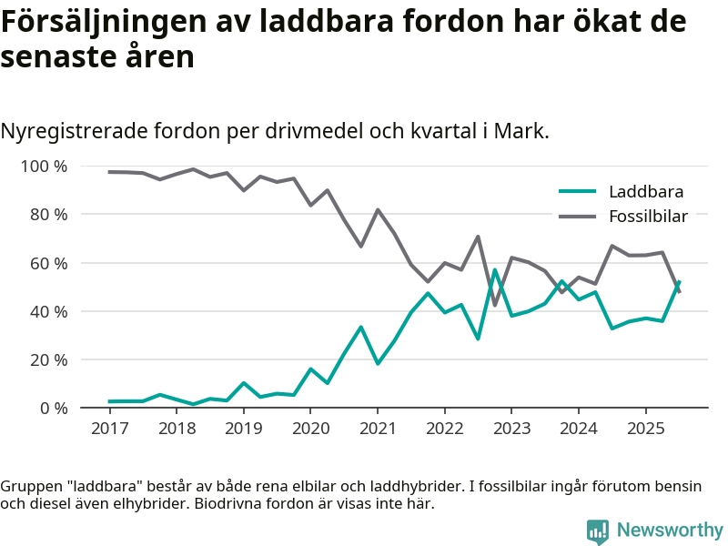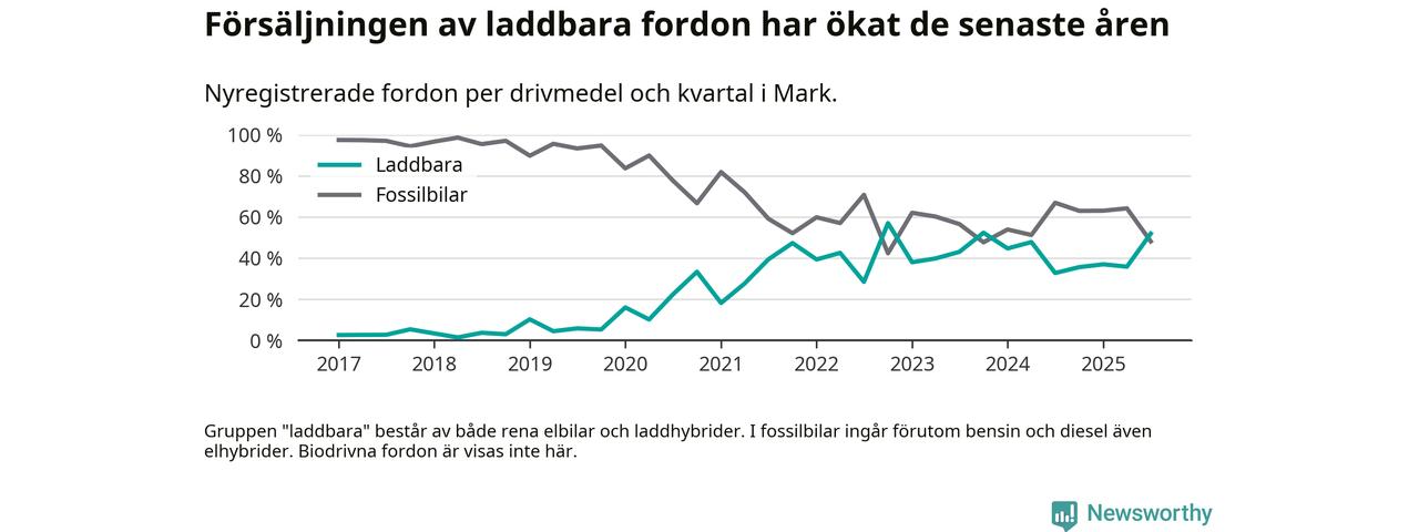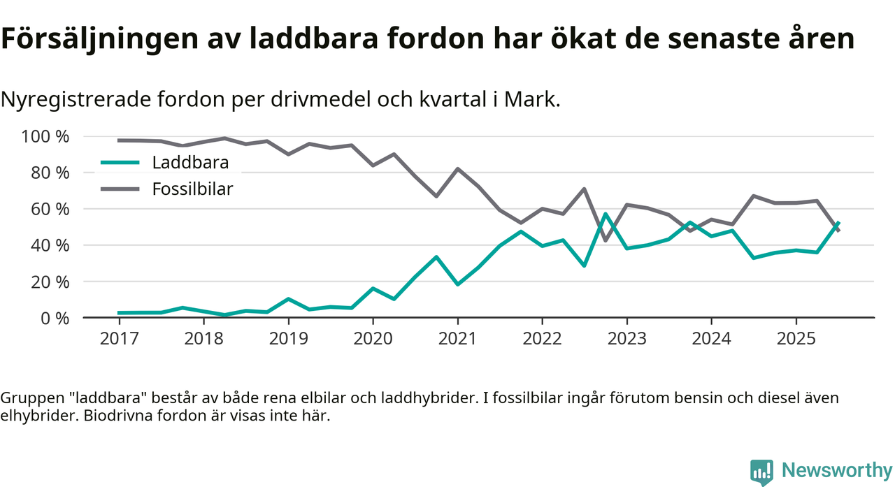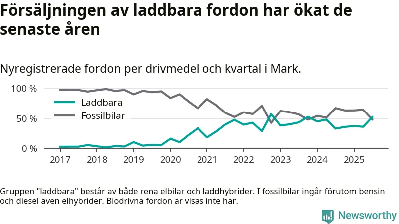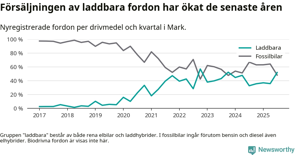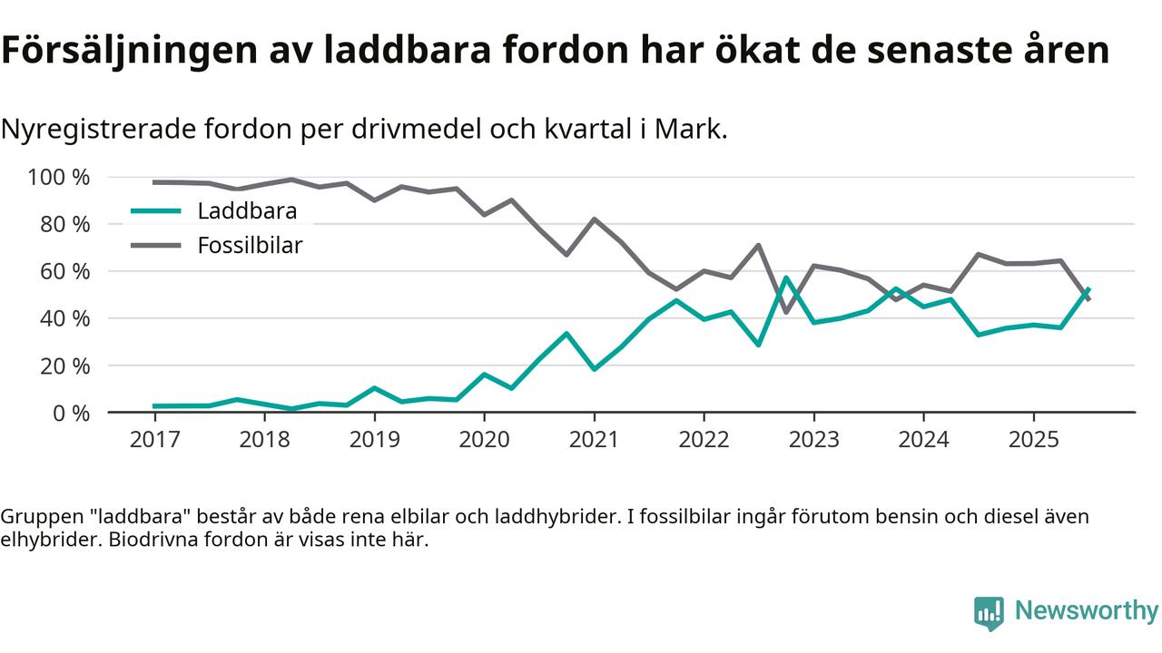 Under tredje kvartalet var hälften av alla nyregistrerade bilar i Marks kommun rena elbilar eller laddhybrider, en ökning jämfört med kvartalet innan. I riket däremot minskade andelen laddbara bilar något. Framför allt elbilsförsäljningen har tappat fart.