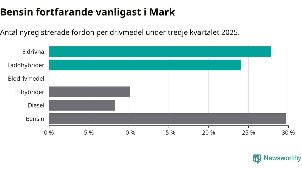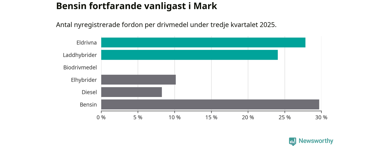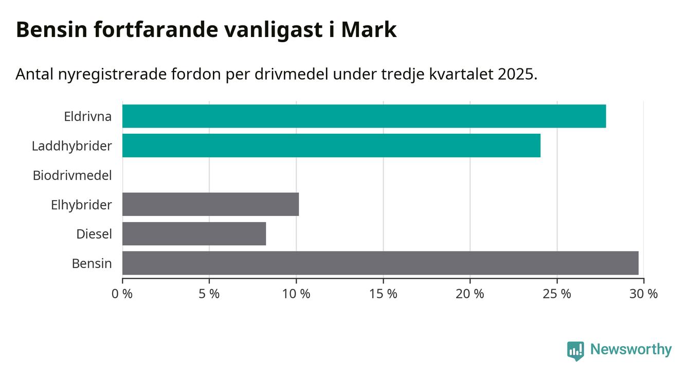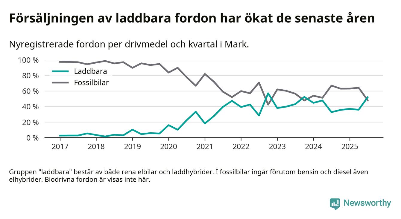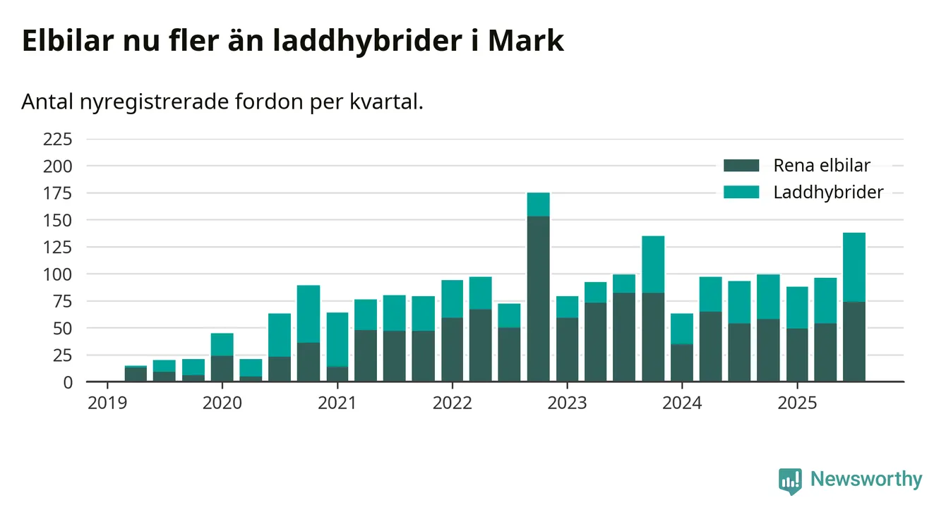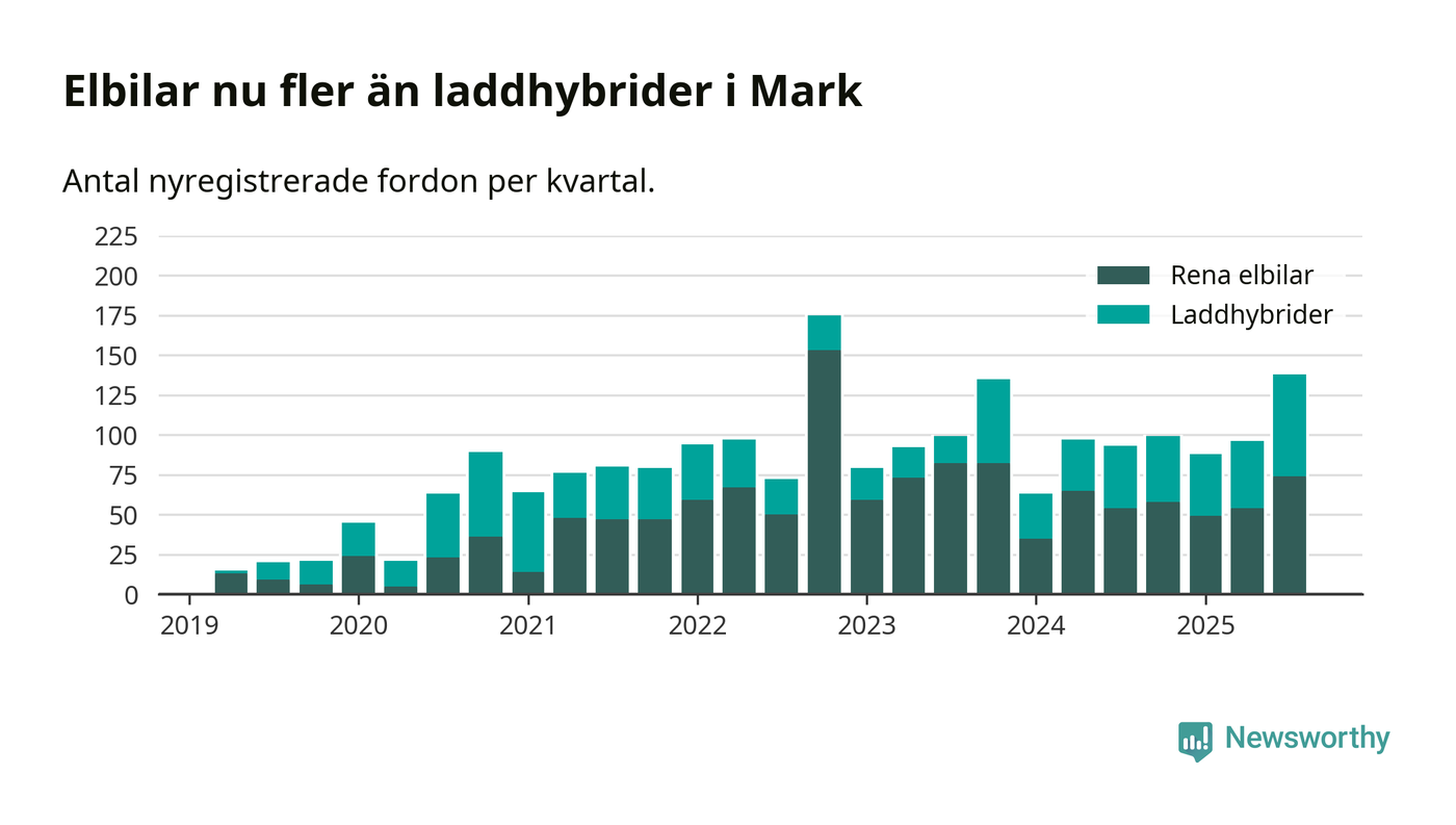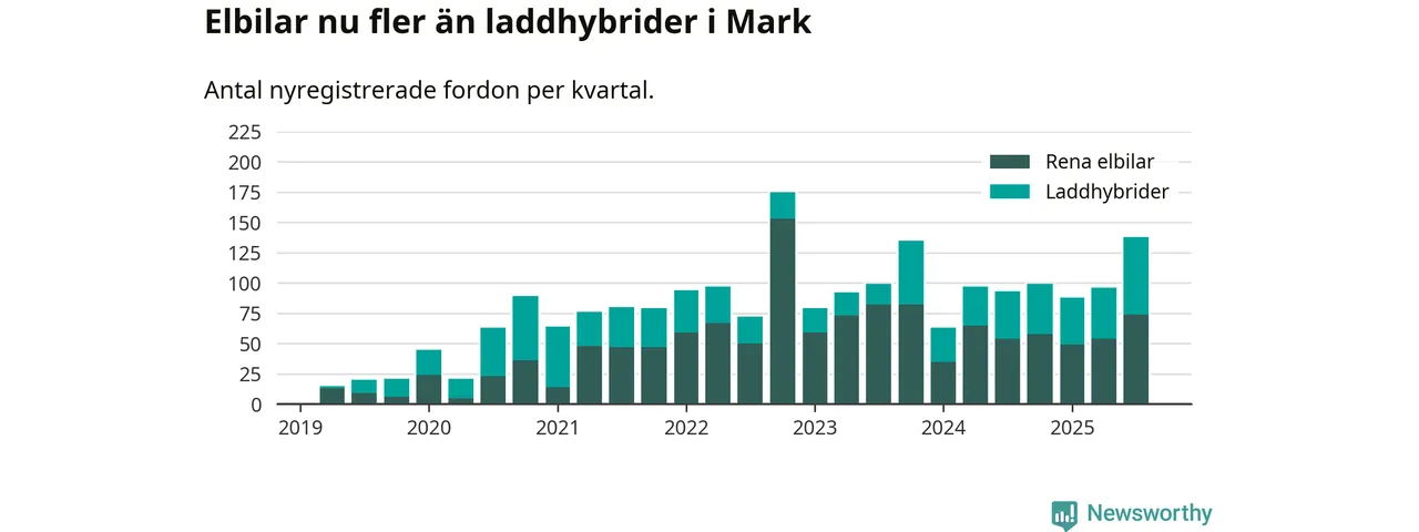 Under tredje kvartalet 2025 var 52 procent av alla nyregistrerade personbilar i Mark laddbara (sammanlagt registrerades 266 nya bilar). Merparten av de laddbara bilarna var rena elbilar (28 procent av alla).