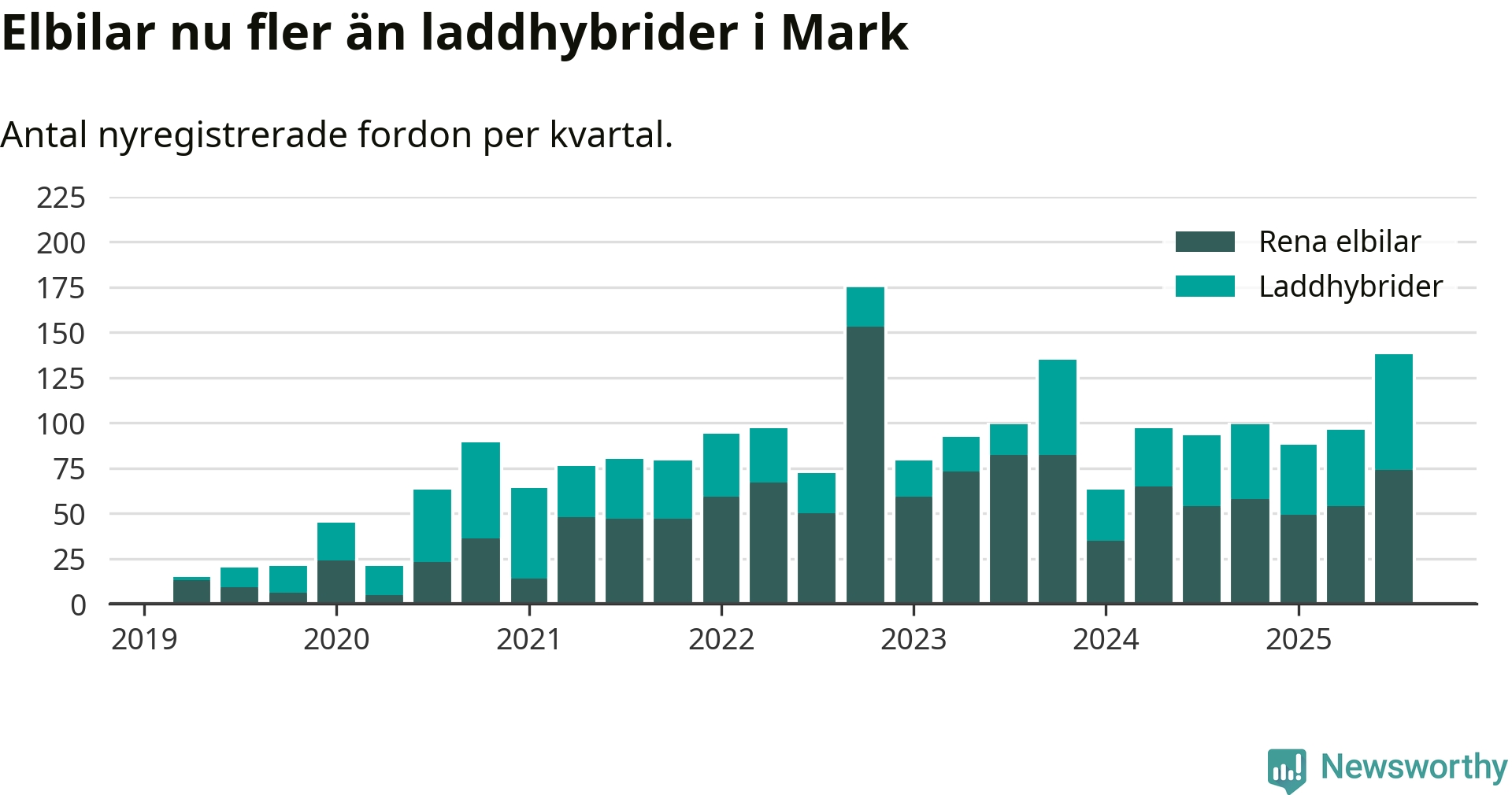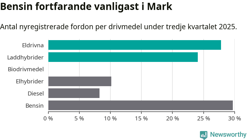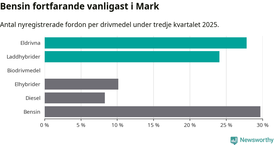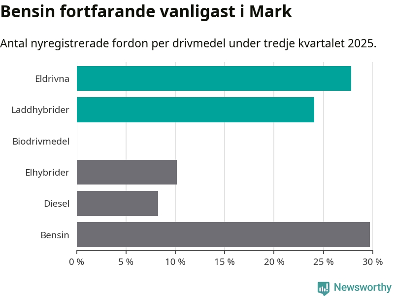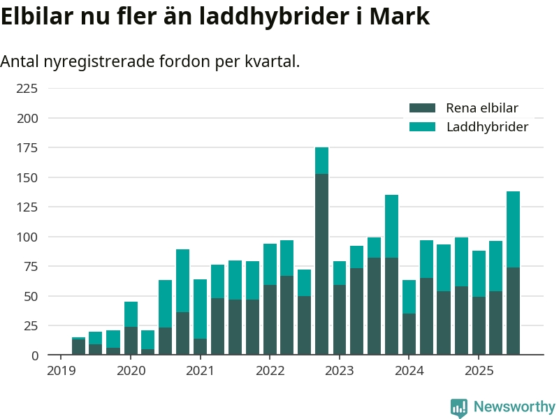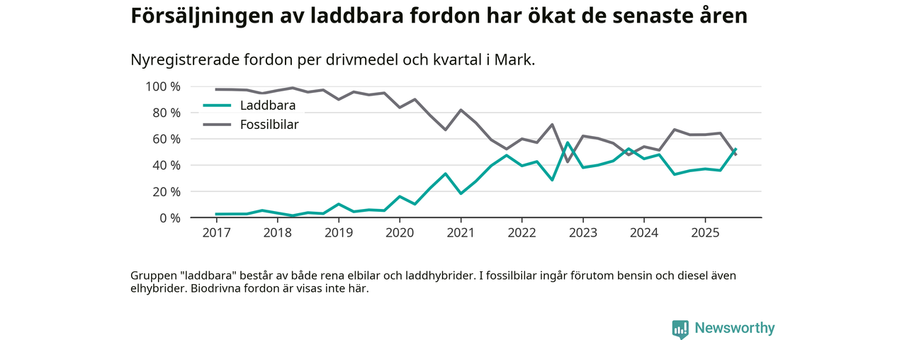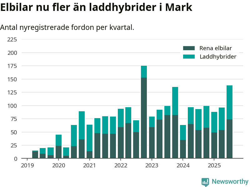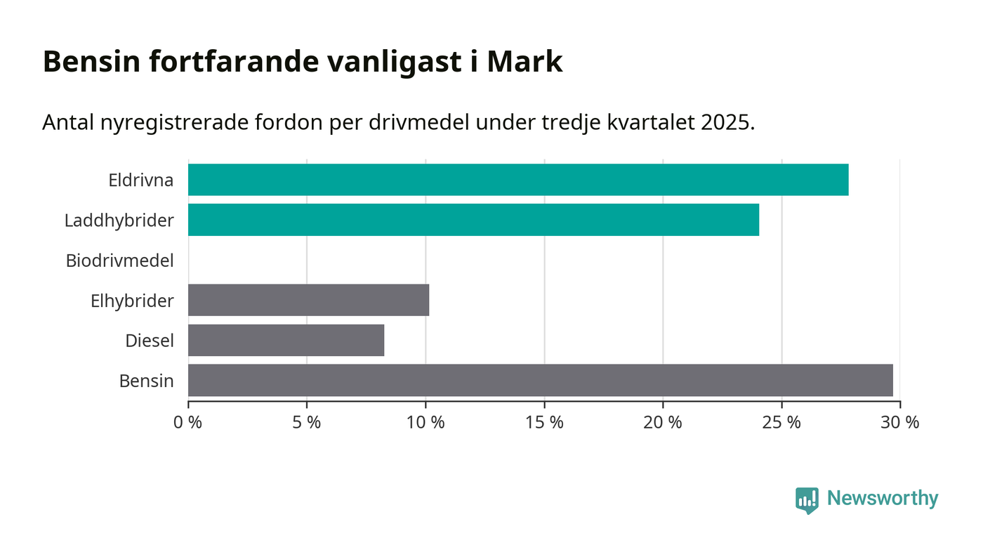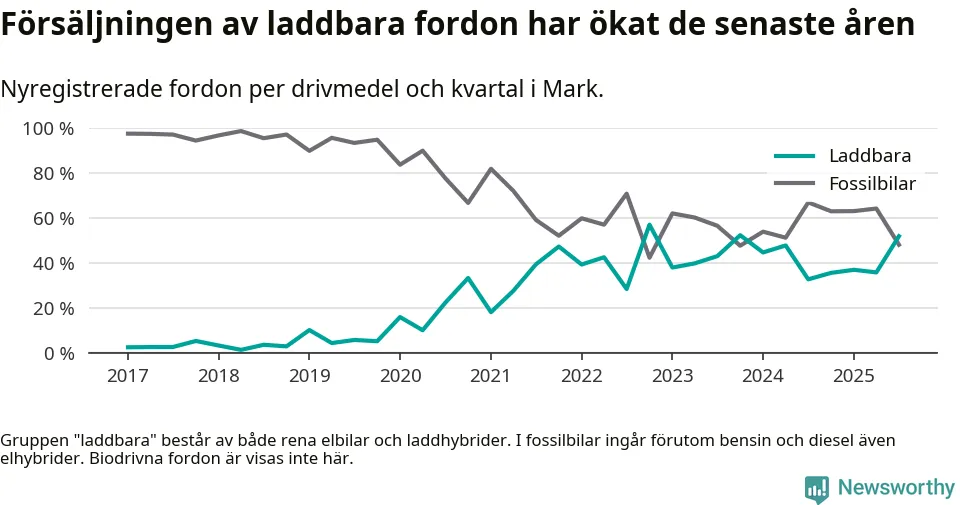 Under tredje kvartalet 2025 var 52 procent av alla nyregistrerade personbilar i Mark laddbara (sammanlagt registrerades 266 nya bilar). Merparten av de laddbara bilarna var rena elbilar (28 procent av alla).