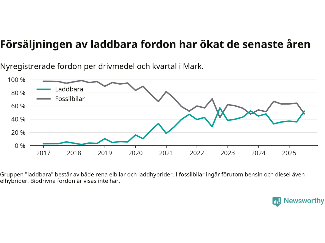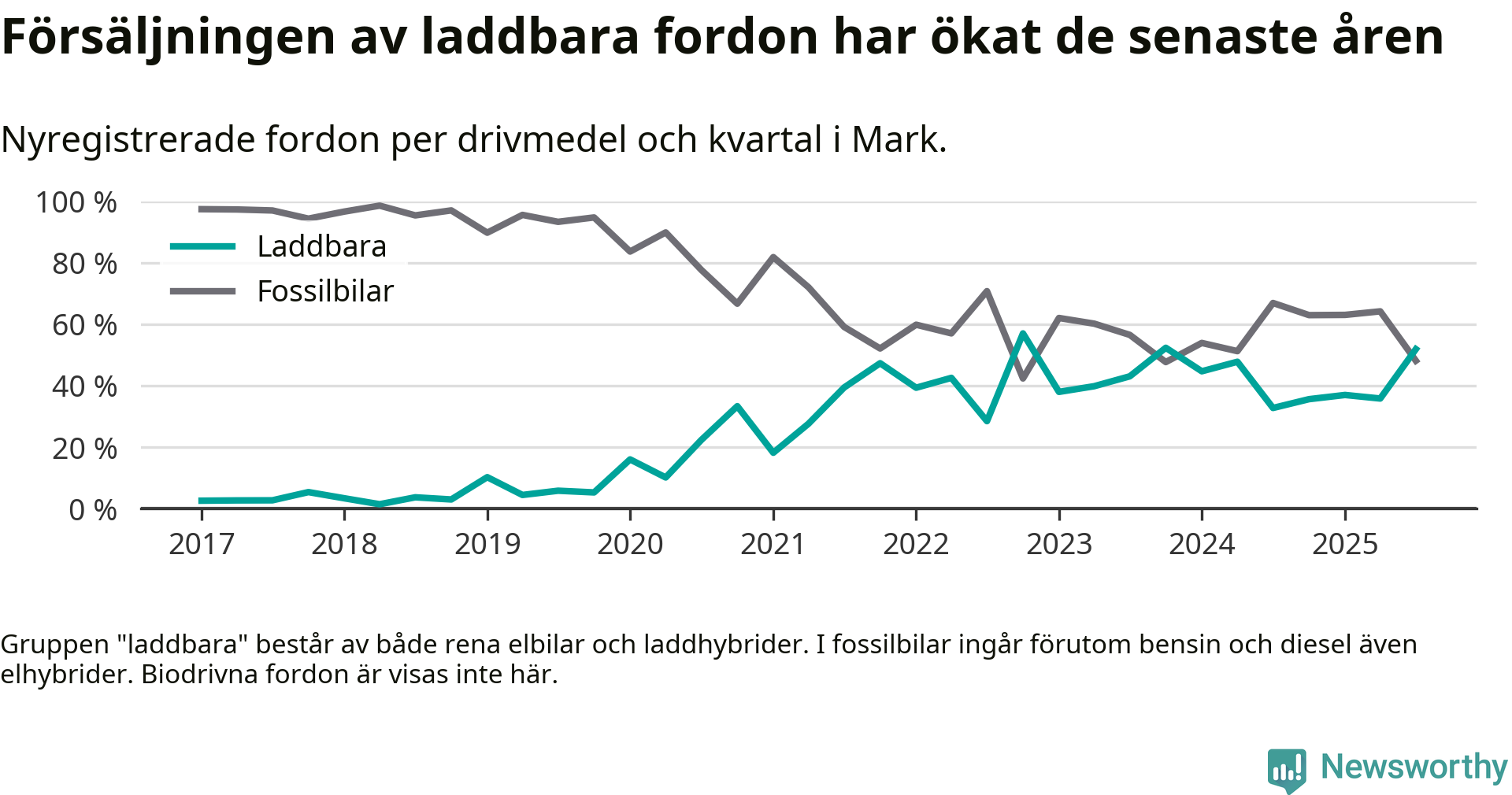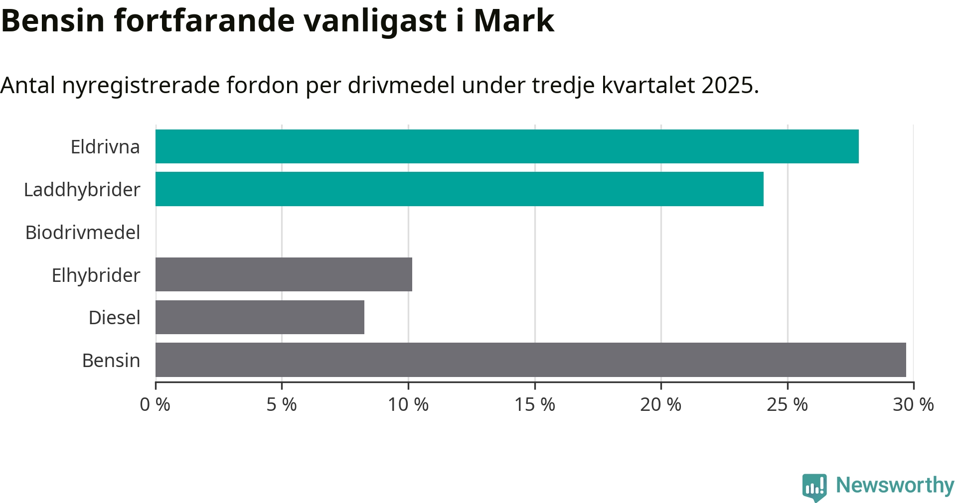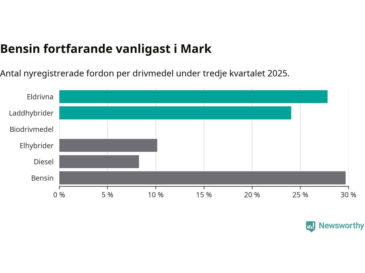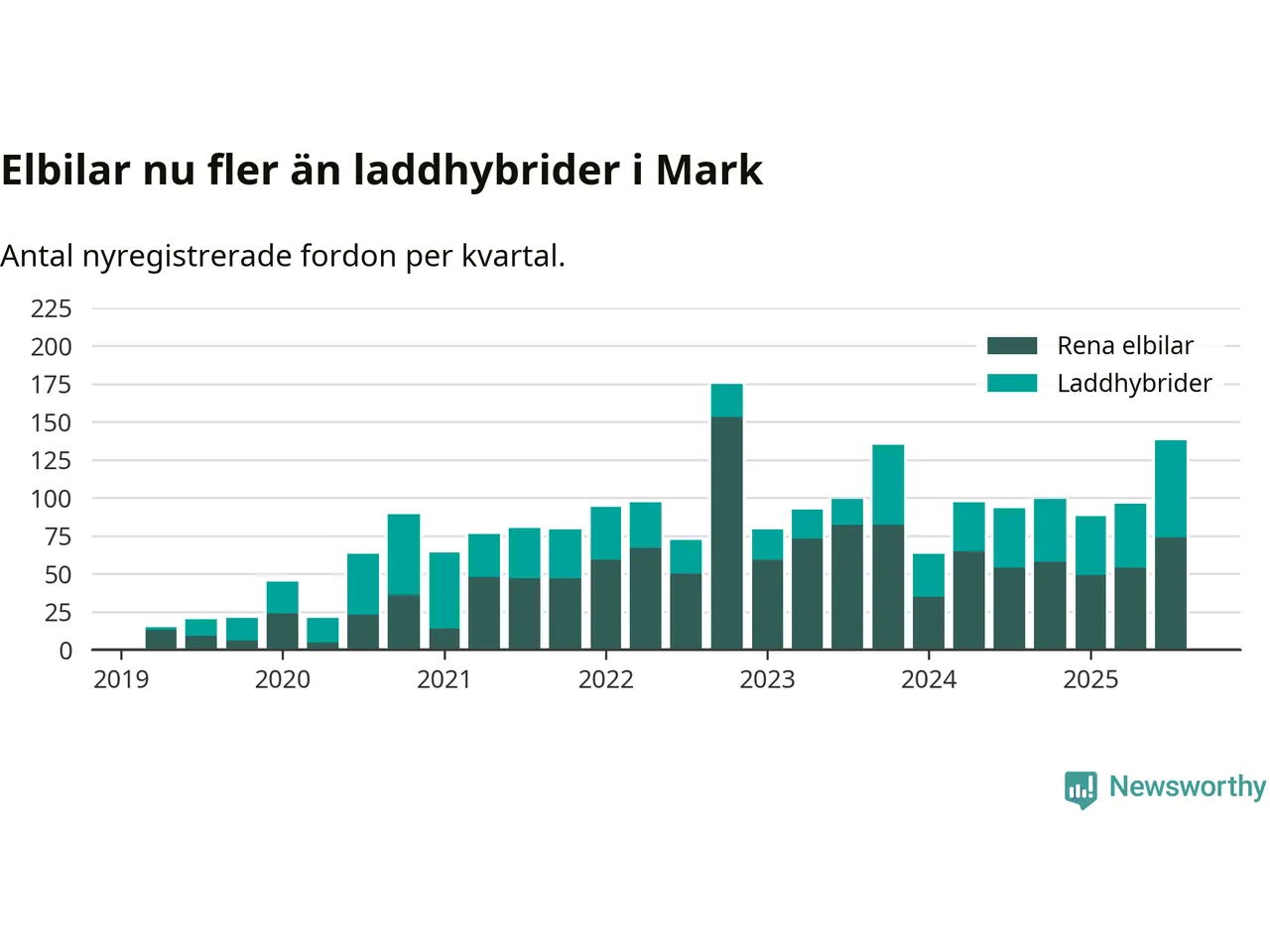 Under tredje kvartalet 2025 var 52 procent av alla nyregistrerade personbilar i Mark laddbara (sammanlagt registrerades 266 nya bilar). Merparten av de laddbara bilarna var rena elbilar (28 procent av alla).