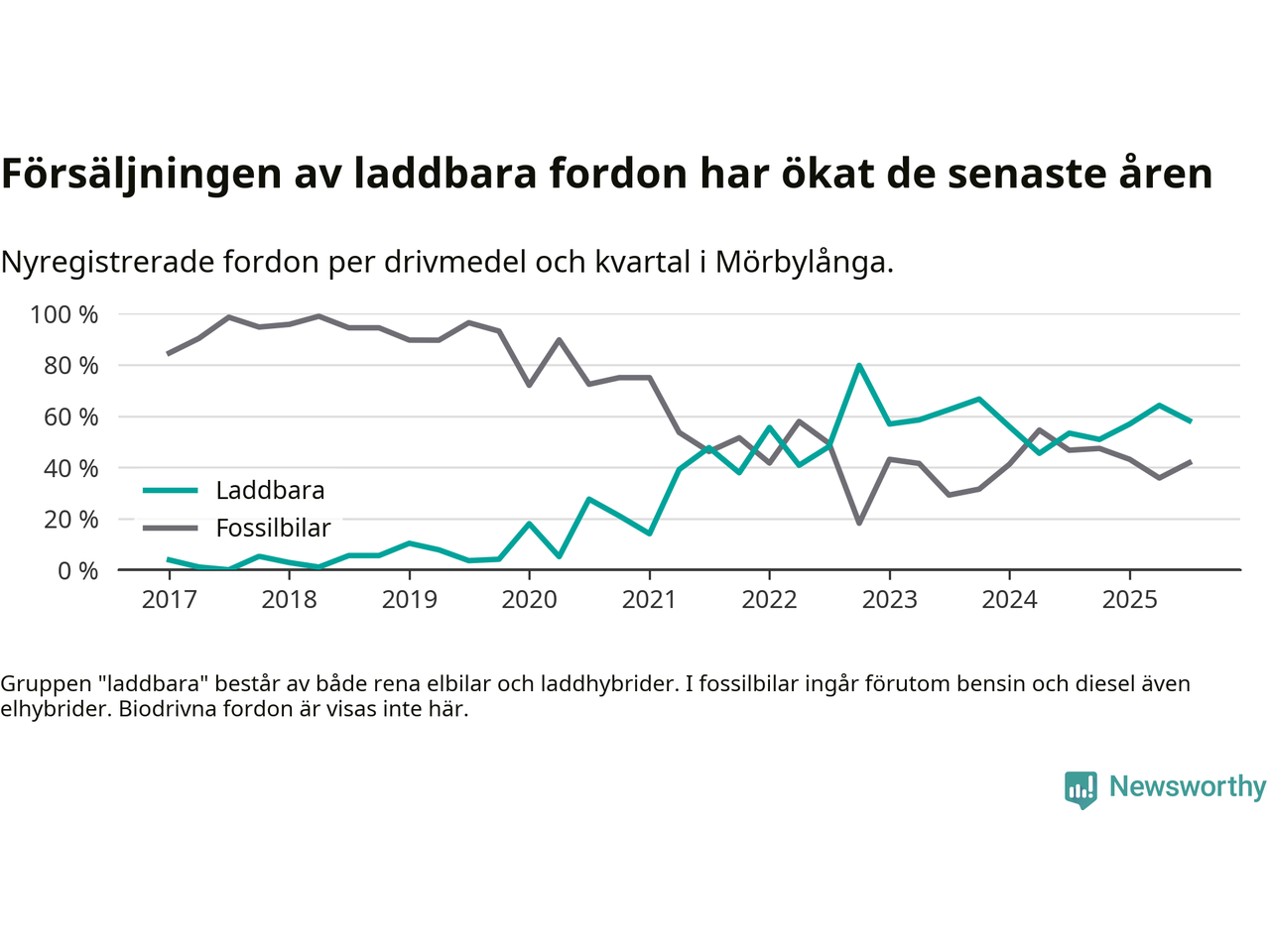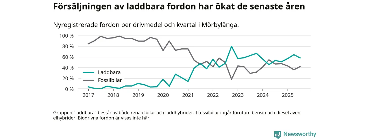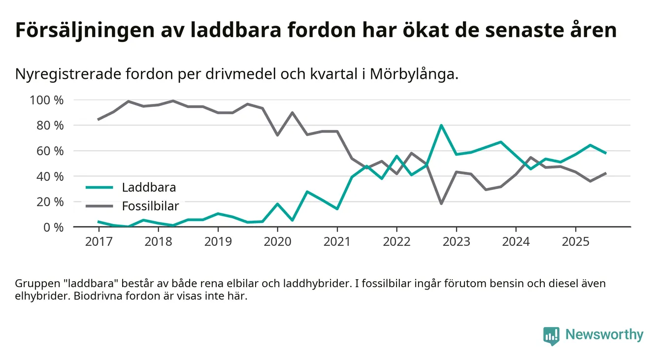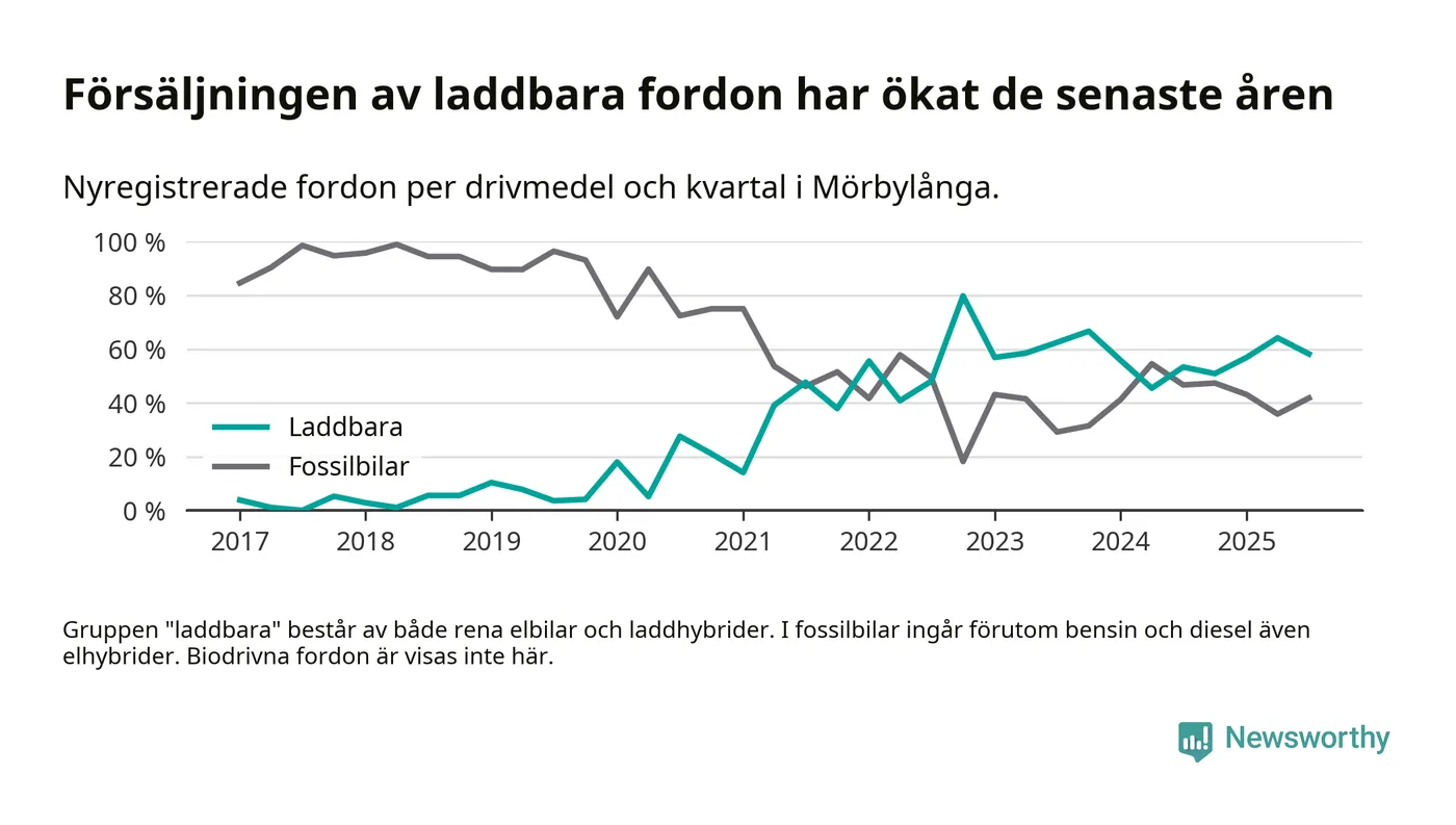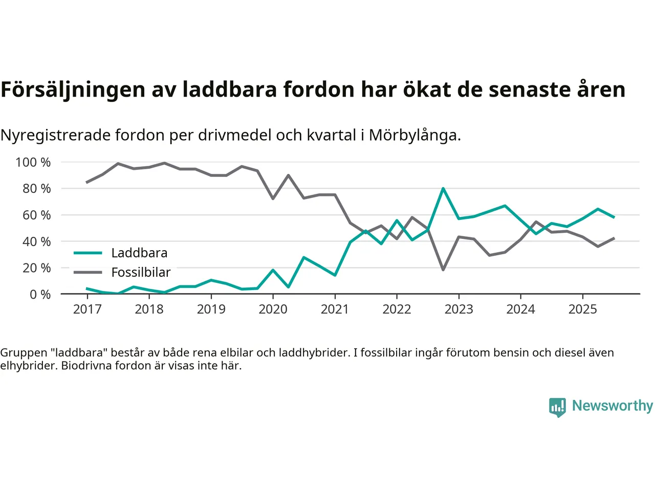 Under tredje kvartalet 2025 var 58 procent av alla nyregistrerade personbilar i Mörbylånga laddbara (sammanlagt registrerades 67 nya bilar). Merparten av de laddbara bilarna var rena elbilar (45 procent av alla).