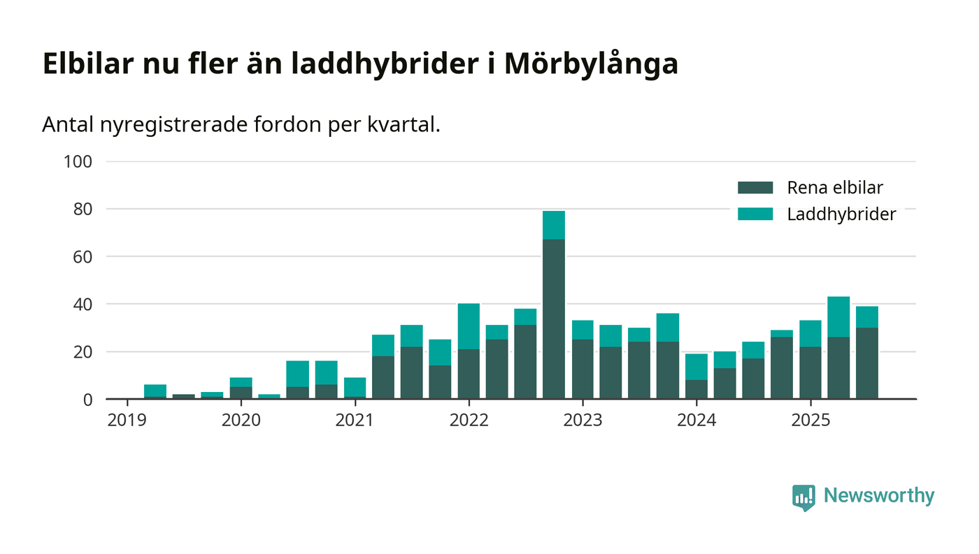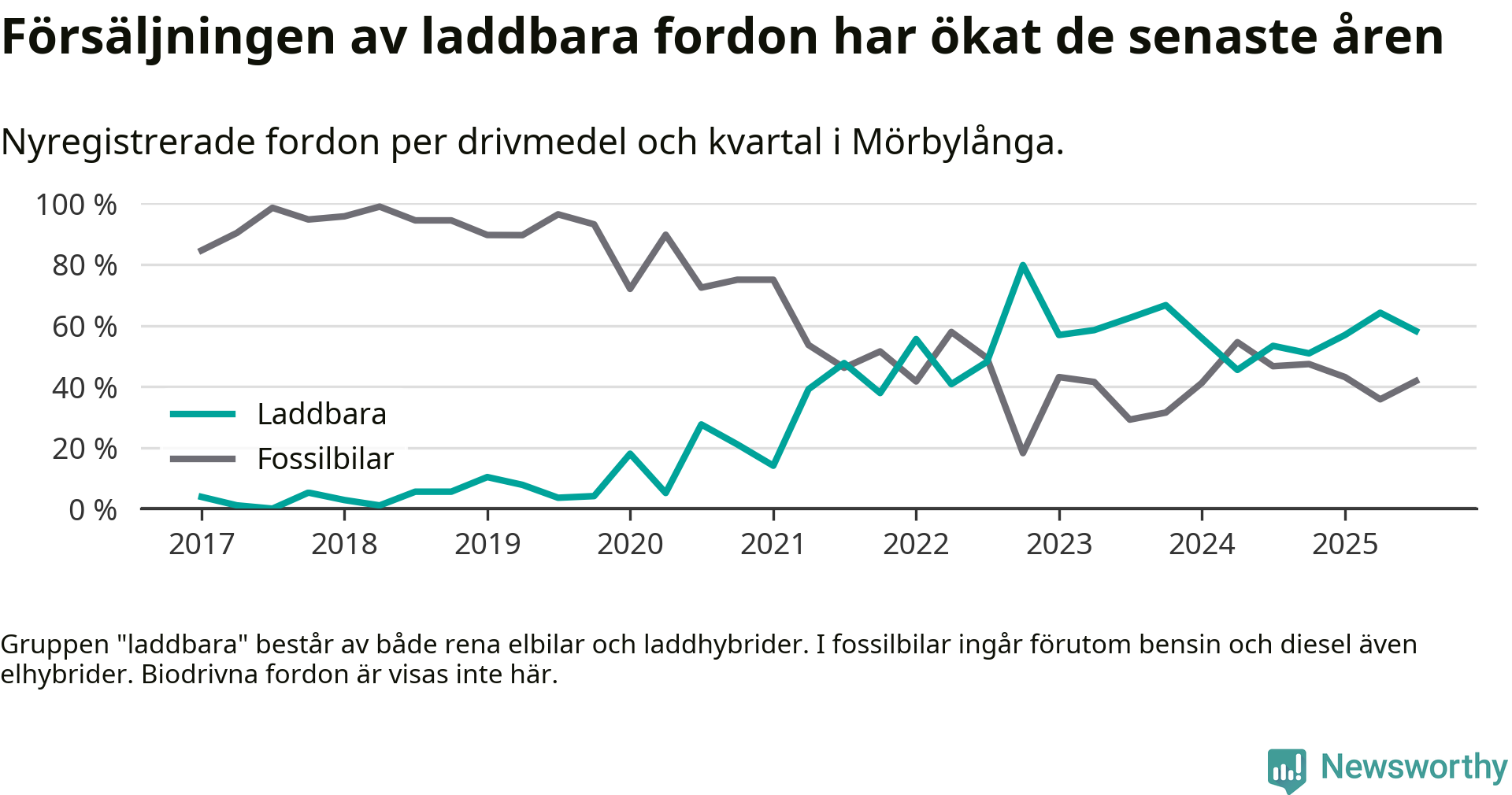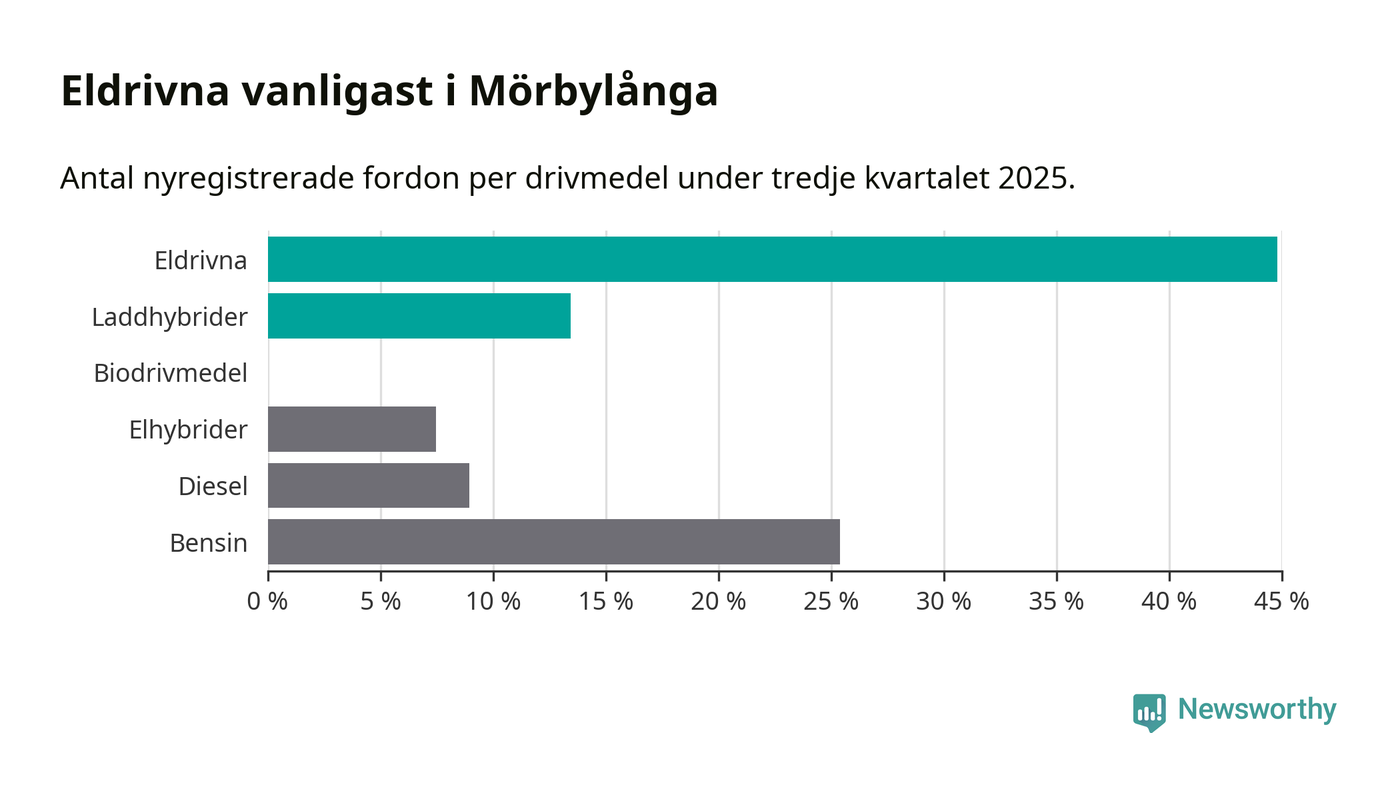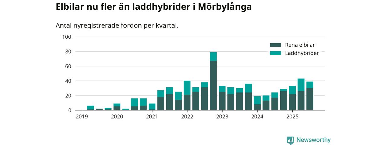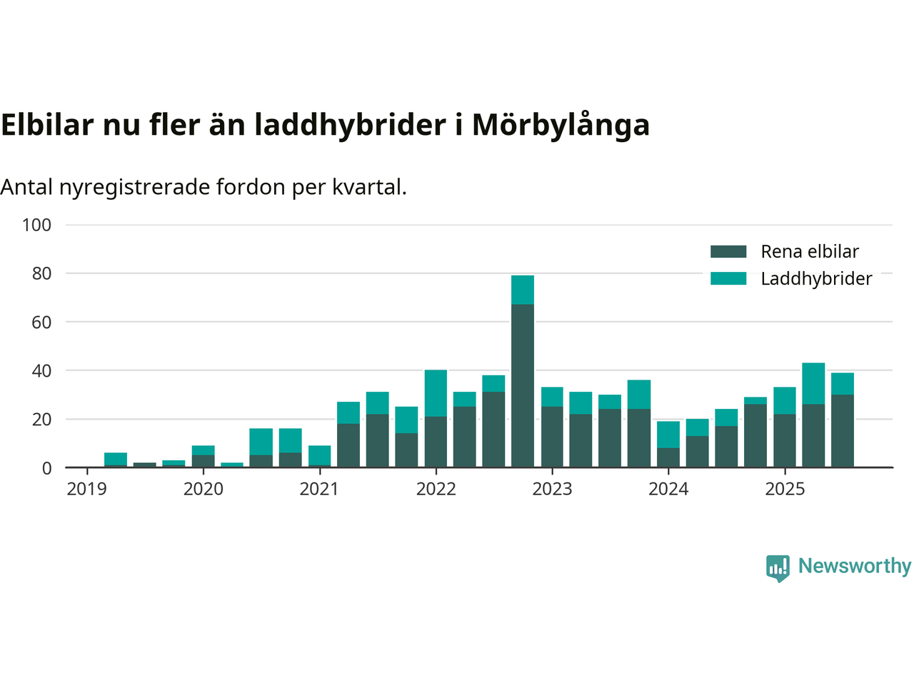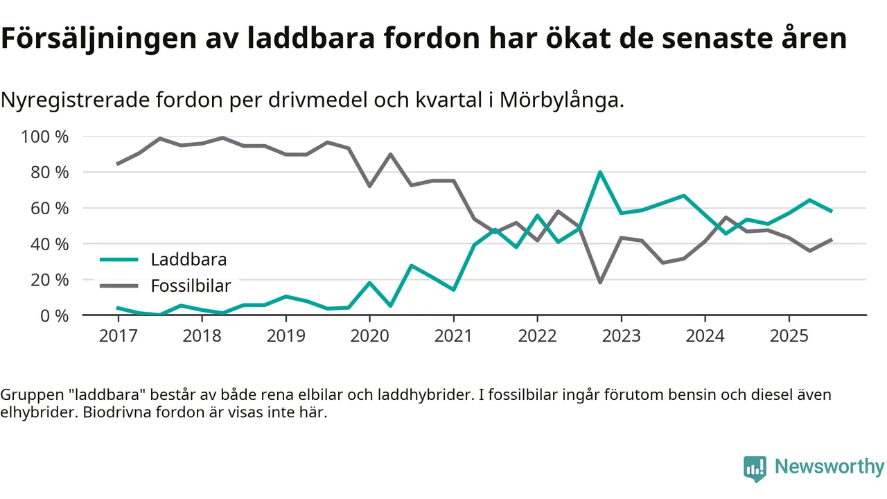 Under tredje kvartalet 2025 var 58 procent av alla nyregistrerade personbilar i Mörbylånga laddbara (sammanlagt registrerades 67 nya bilar). Merparten av de laddbara bilarna var rena elbilar (45 procent av alla).