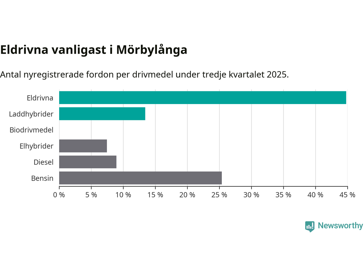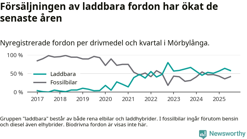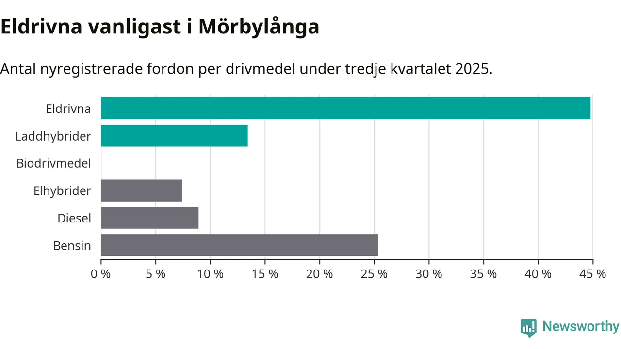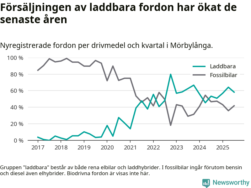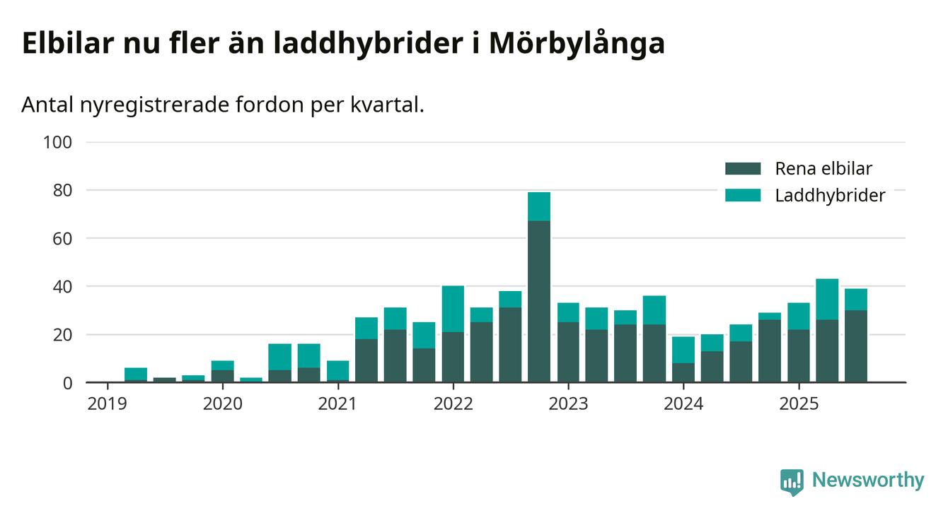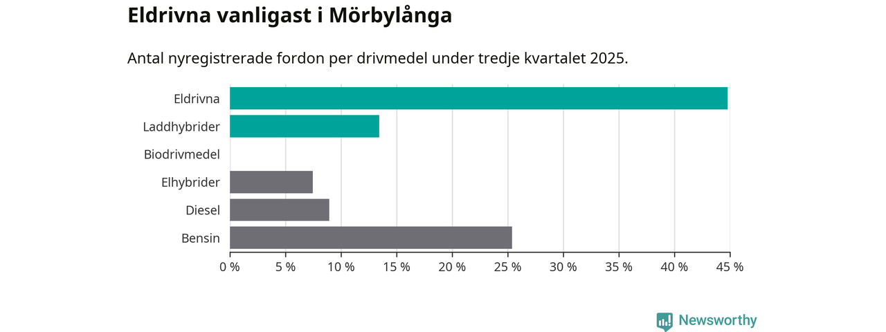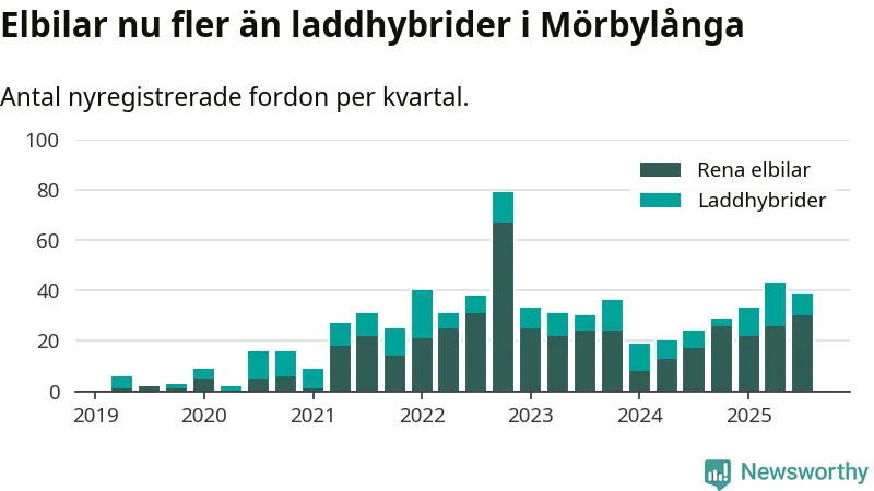 Under tredje kvartalet 2025 var 58 procent av alla nyregistrerade personbilar i Mörbylånga laddbara (sammanlagt registrerades 67 nya bilar). Merparten av de laddbara bilarna var rena elbilar (45 procent av alla).