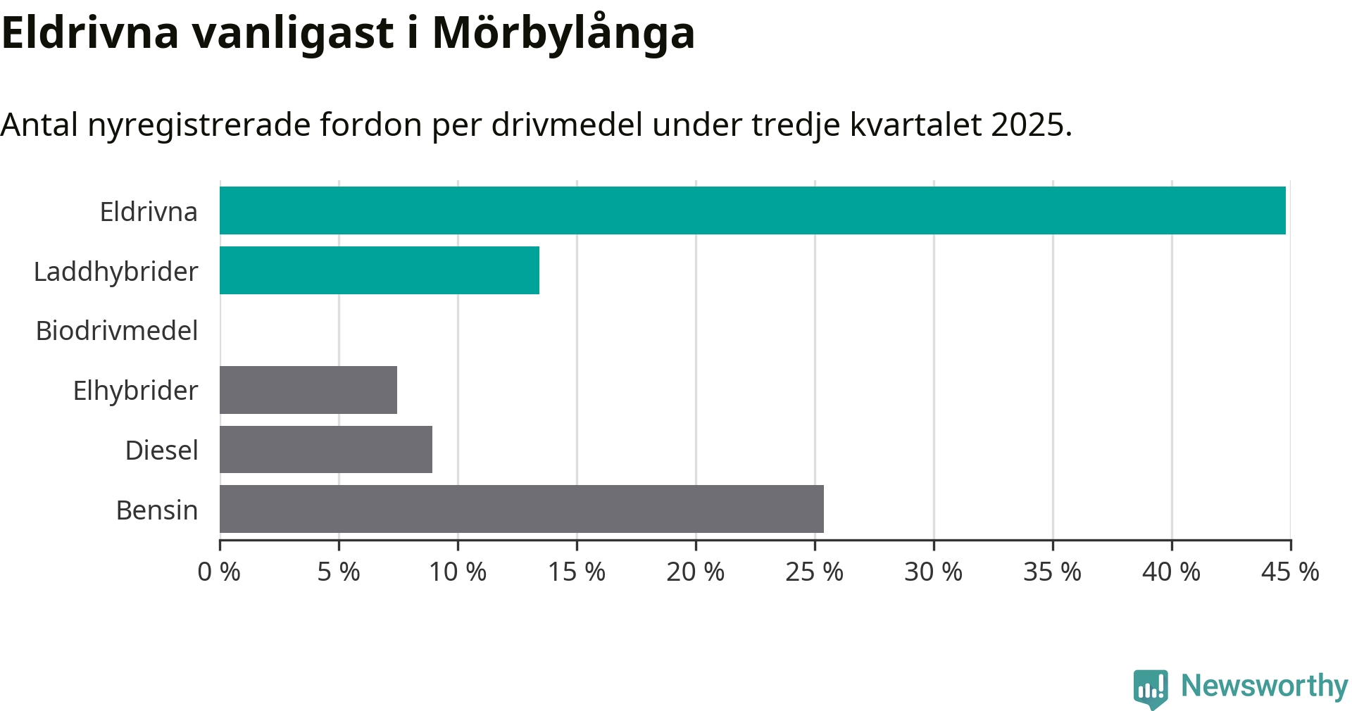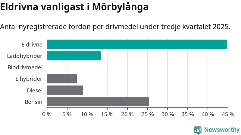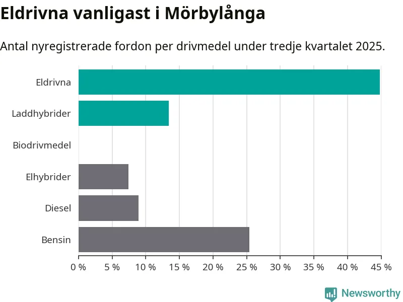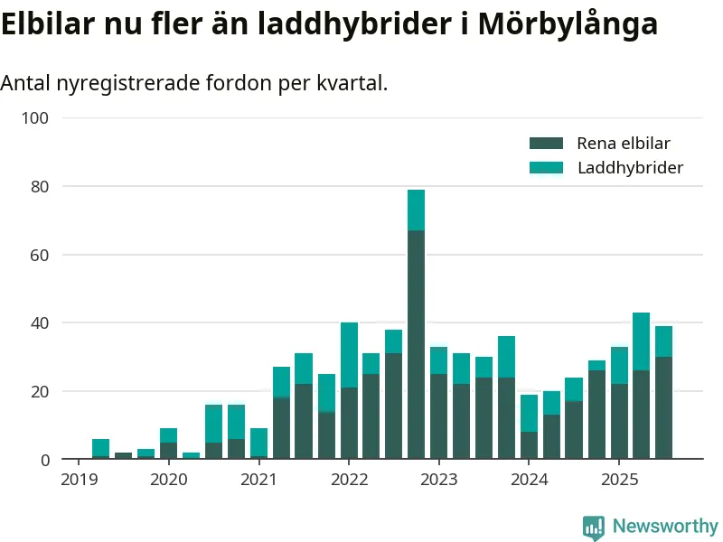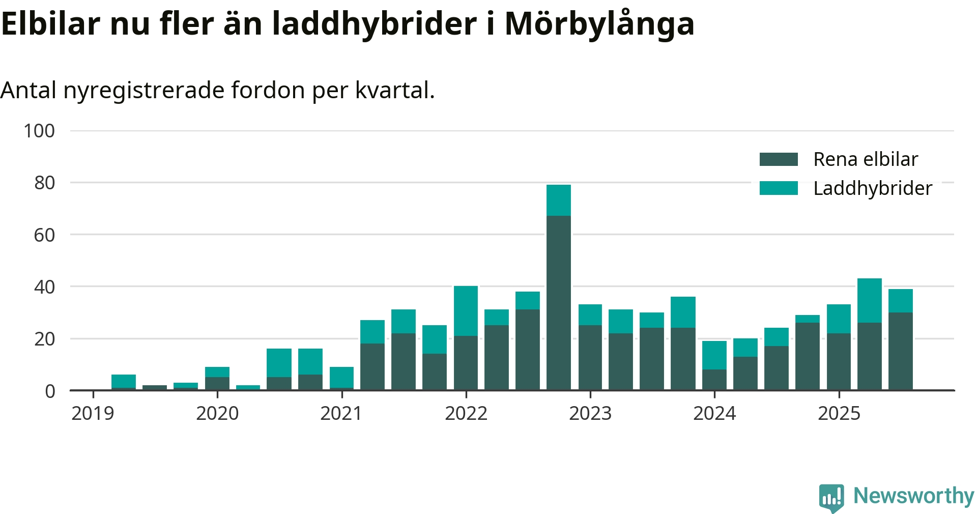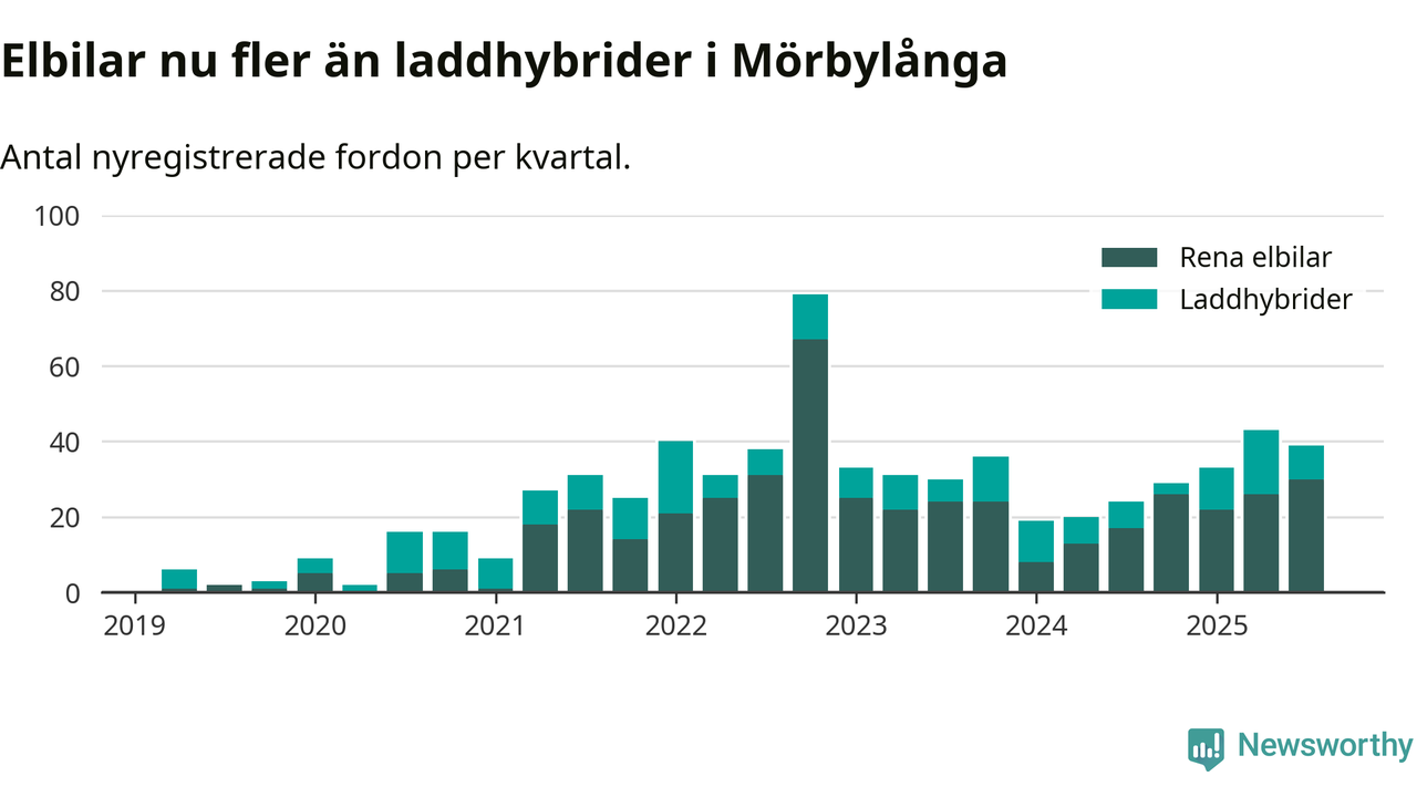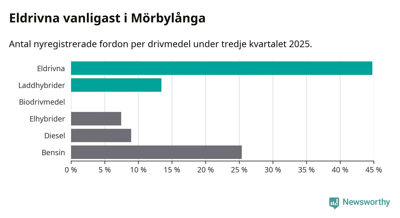 Under tredje kvartalet 2025 var 58 procent av alla nyregistrerade personbilar i Mörbylånga laddbara (sammanlagt registrerades 67 nya bilar). Merparten av de laddbara bilarna var rena elbilar (45 procent av alla).