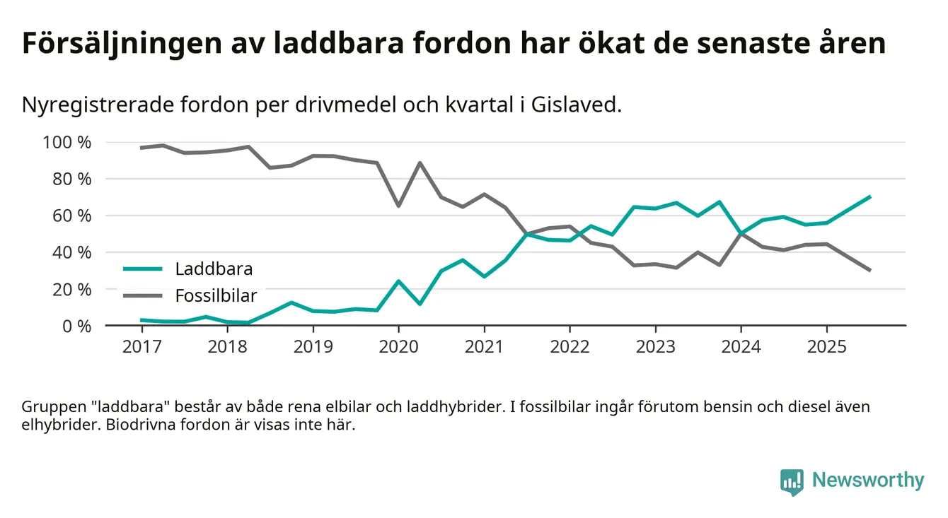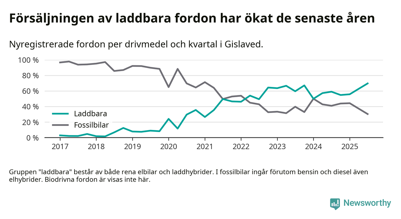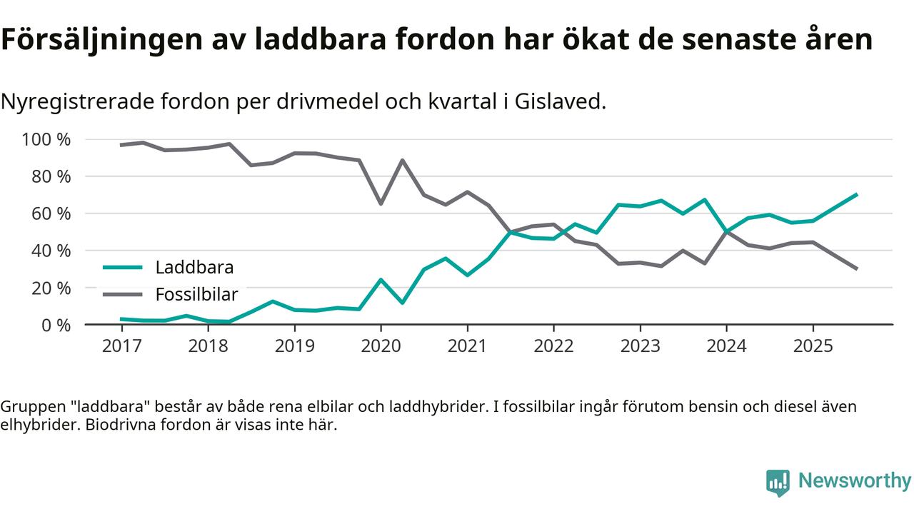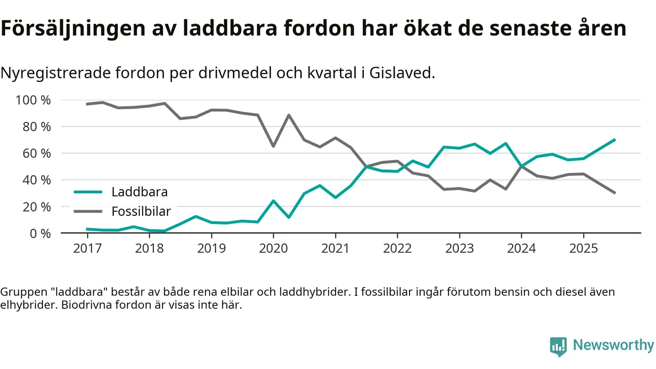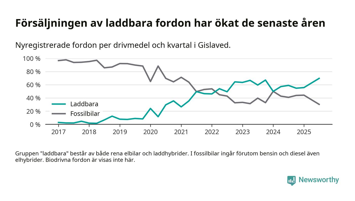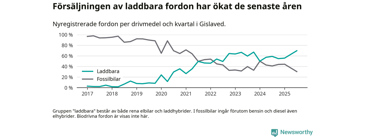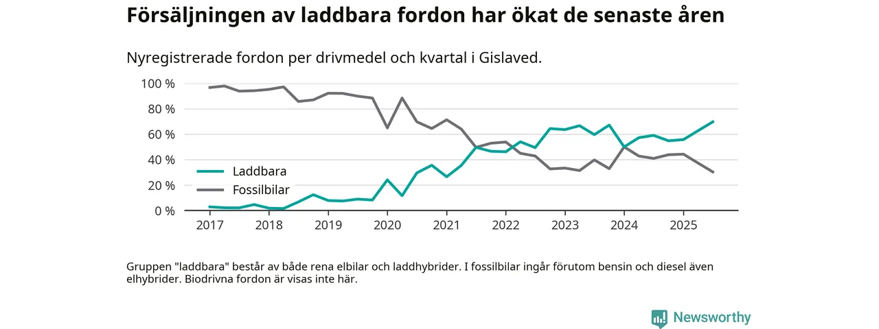Under tredje kvartalet 2025 var 70 procent av alla nyregistrerade personbilar i Gislaved laddbara (sammanlagt registrerades 132 nya bilar). Merparten av de laddbara bilarna var rena elbilar (39 procent av alla).