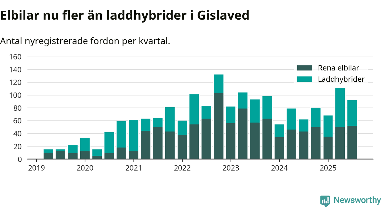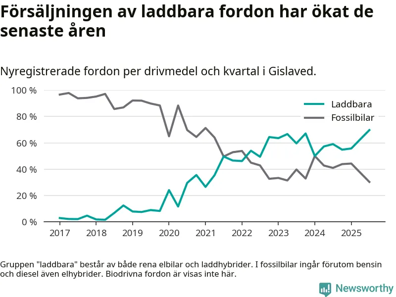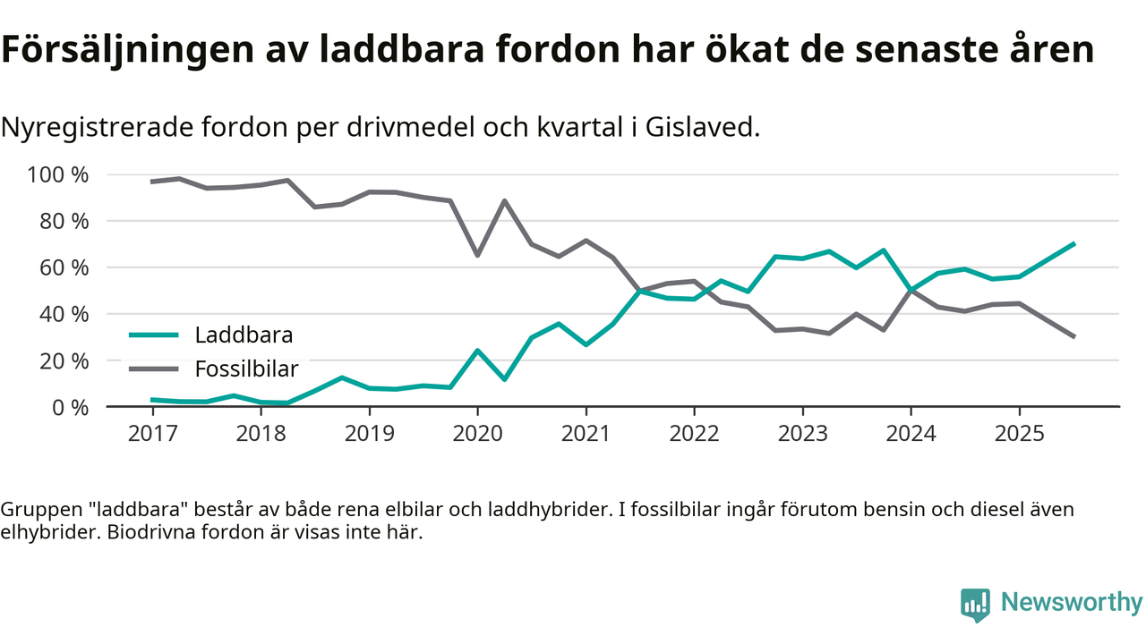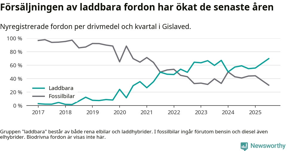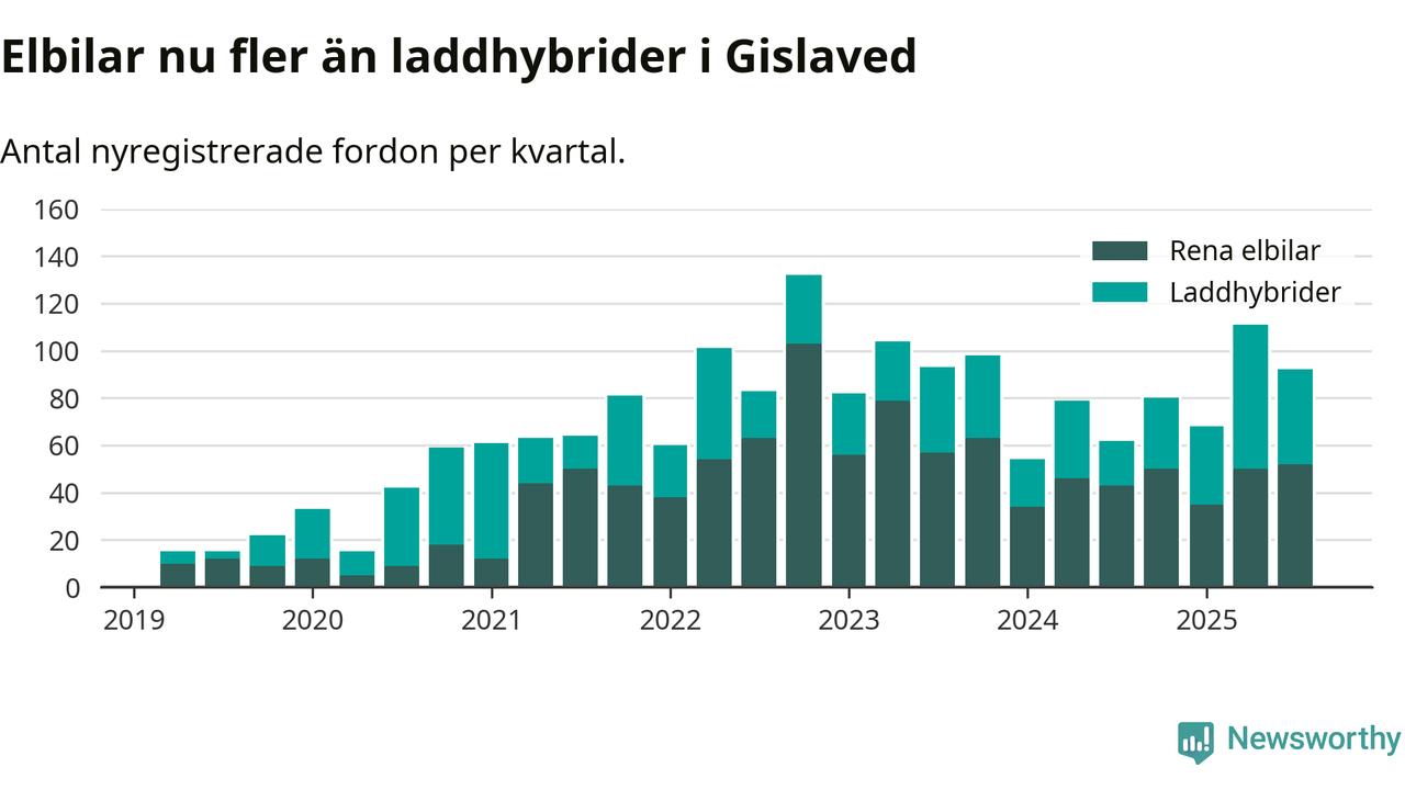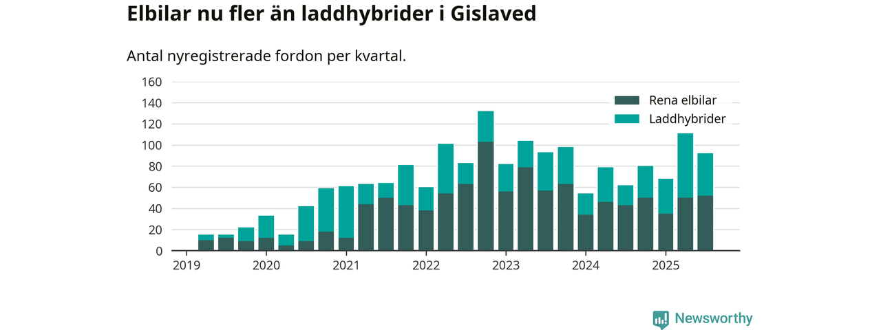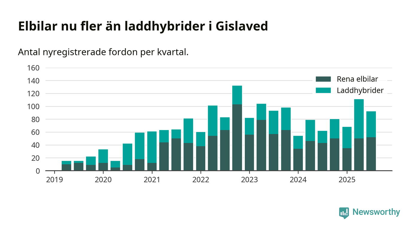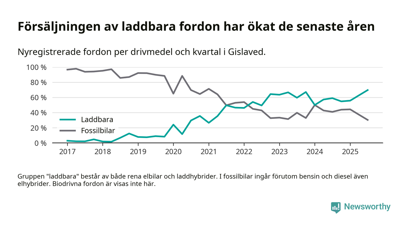 Under tredje kvartalet 2025 var 70 procent av alla nyregistrerade personbilar i Gislaved laddbara (sammanlagt registrerades 132 nya bilar). Merparten av de laddbara bilarna var rena elbilar (39 procent av alla).