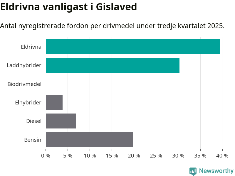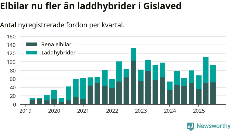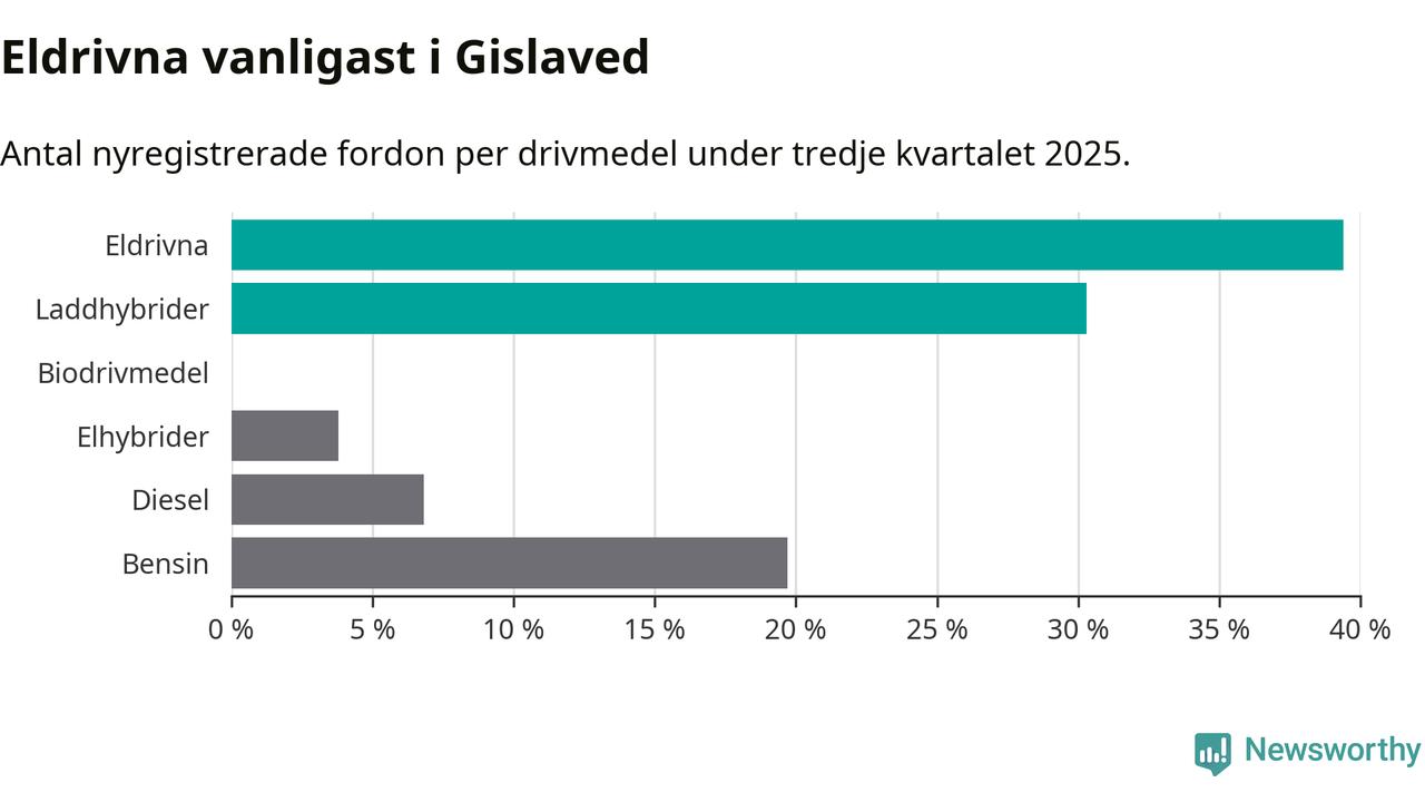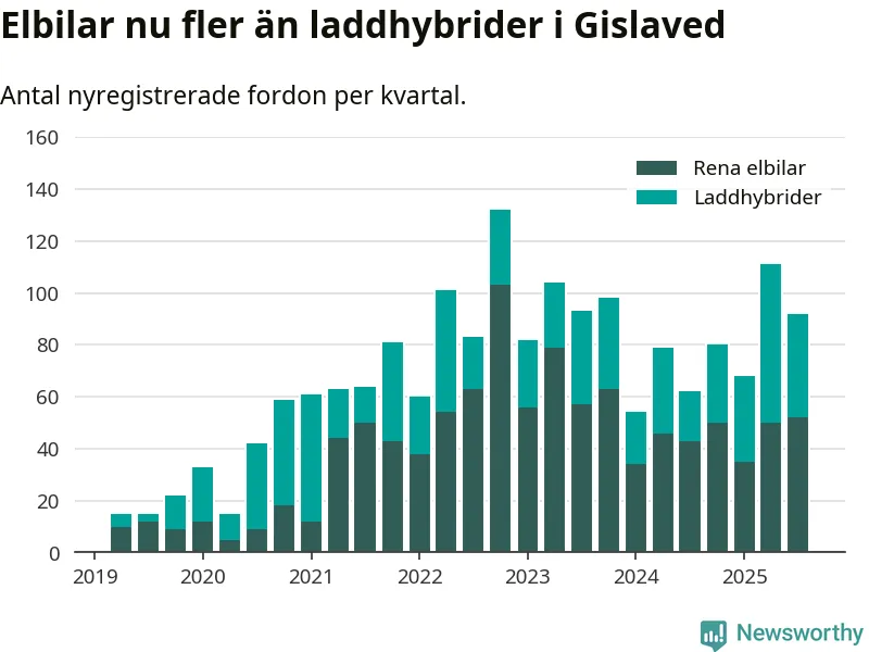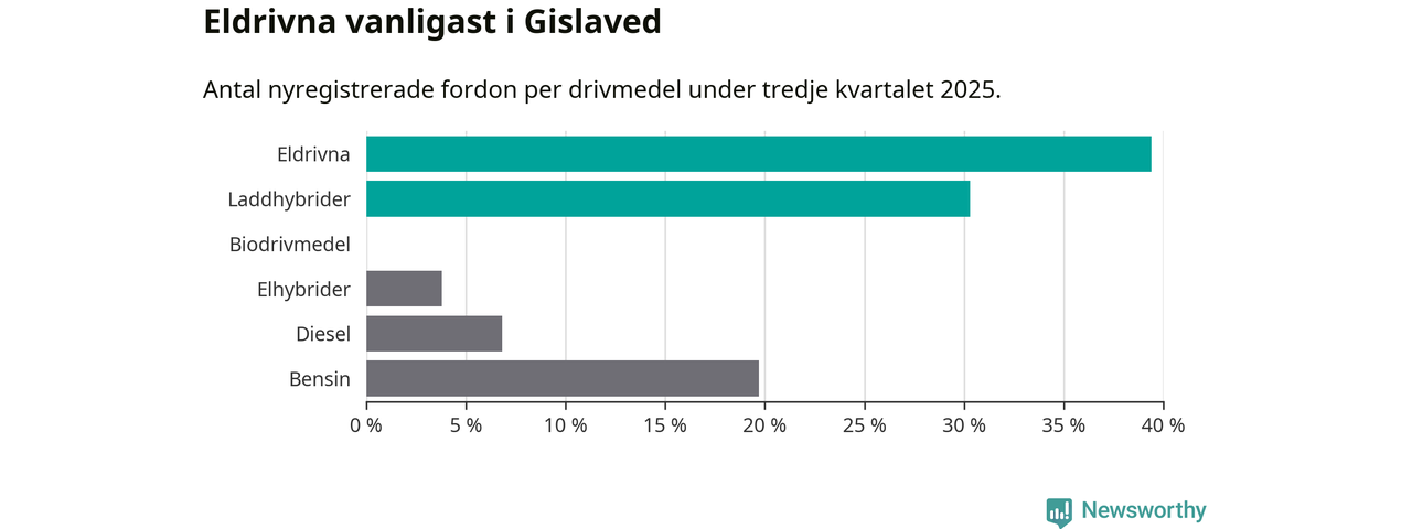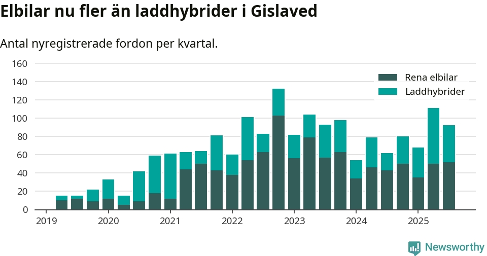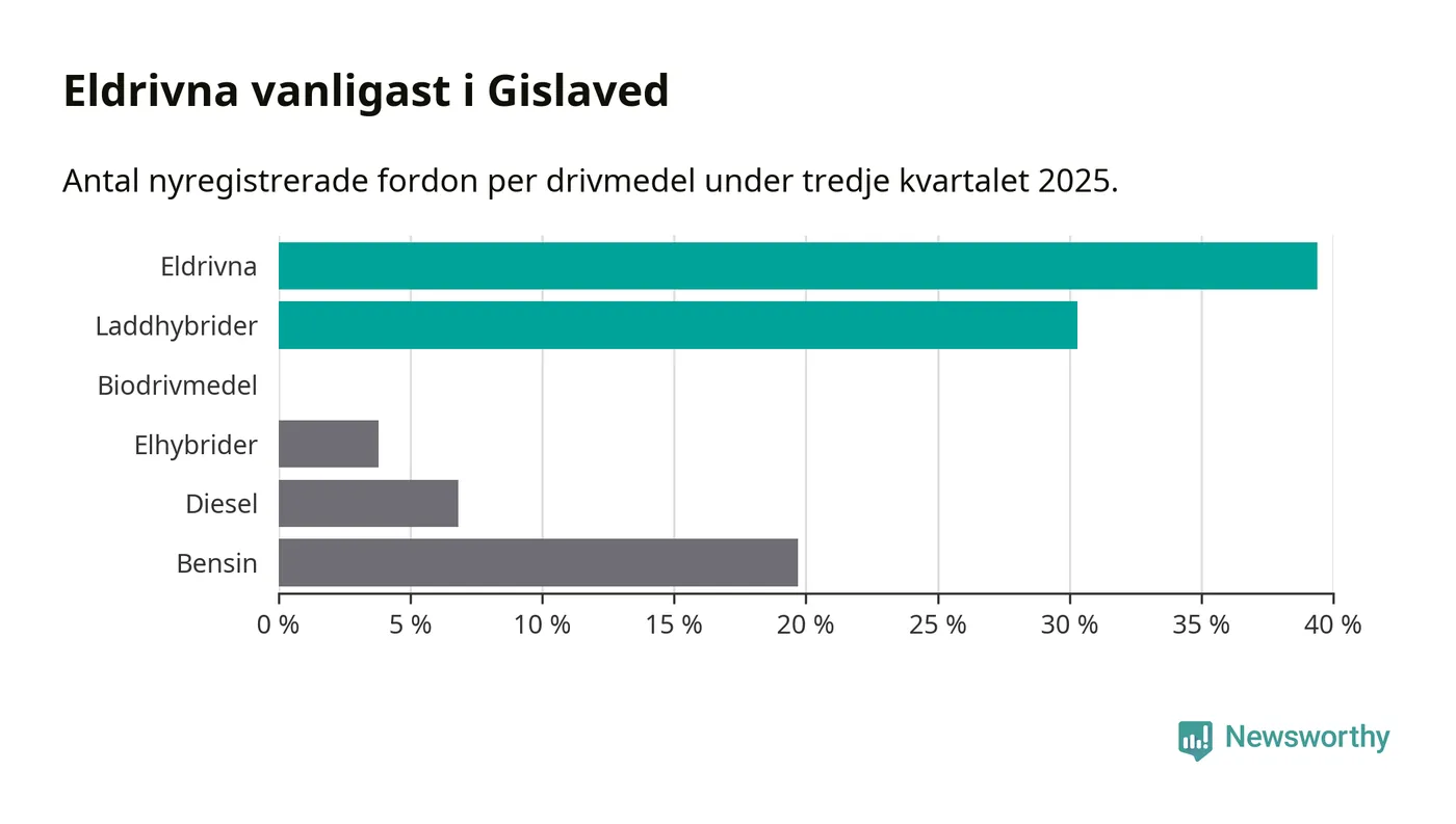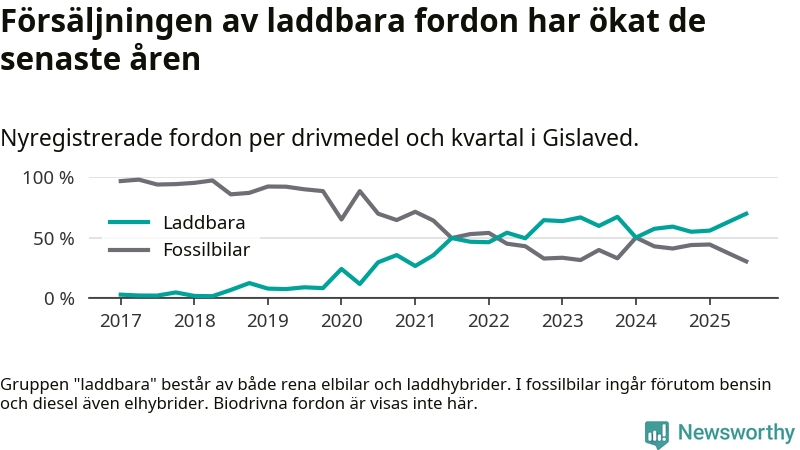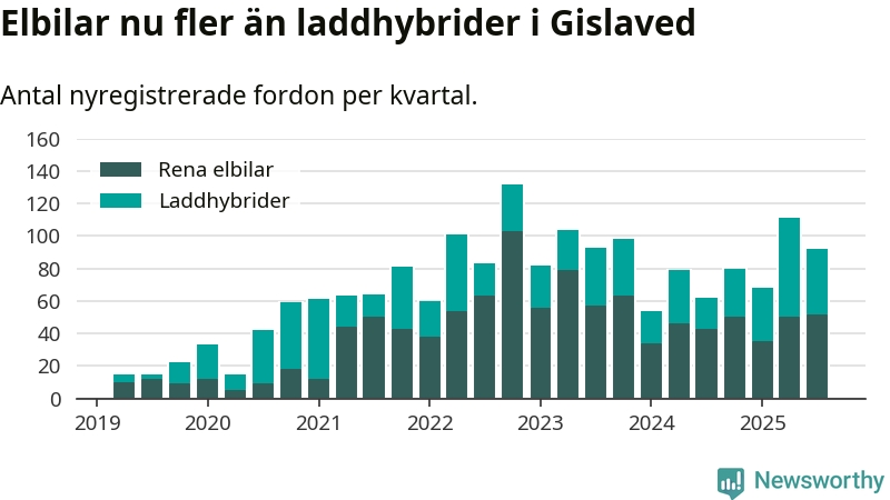 Under tredje kvartalet 2025 var 70 procent av alla nyregistrerade personbilar i Gislaved laddbara (sammanlagt registrerades 132 nya bilar). Merparten av de laddbara bilarna var rena elbilar (39 procent av alla).