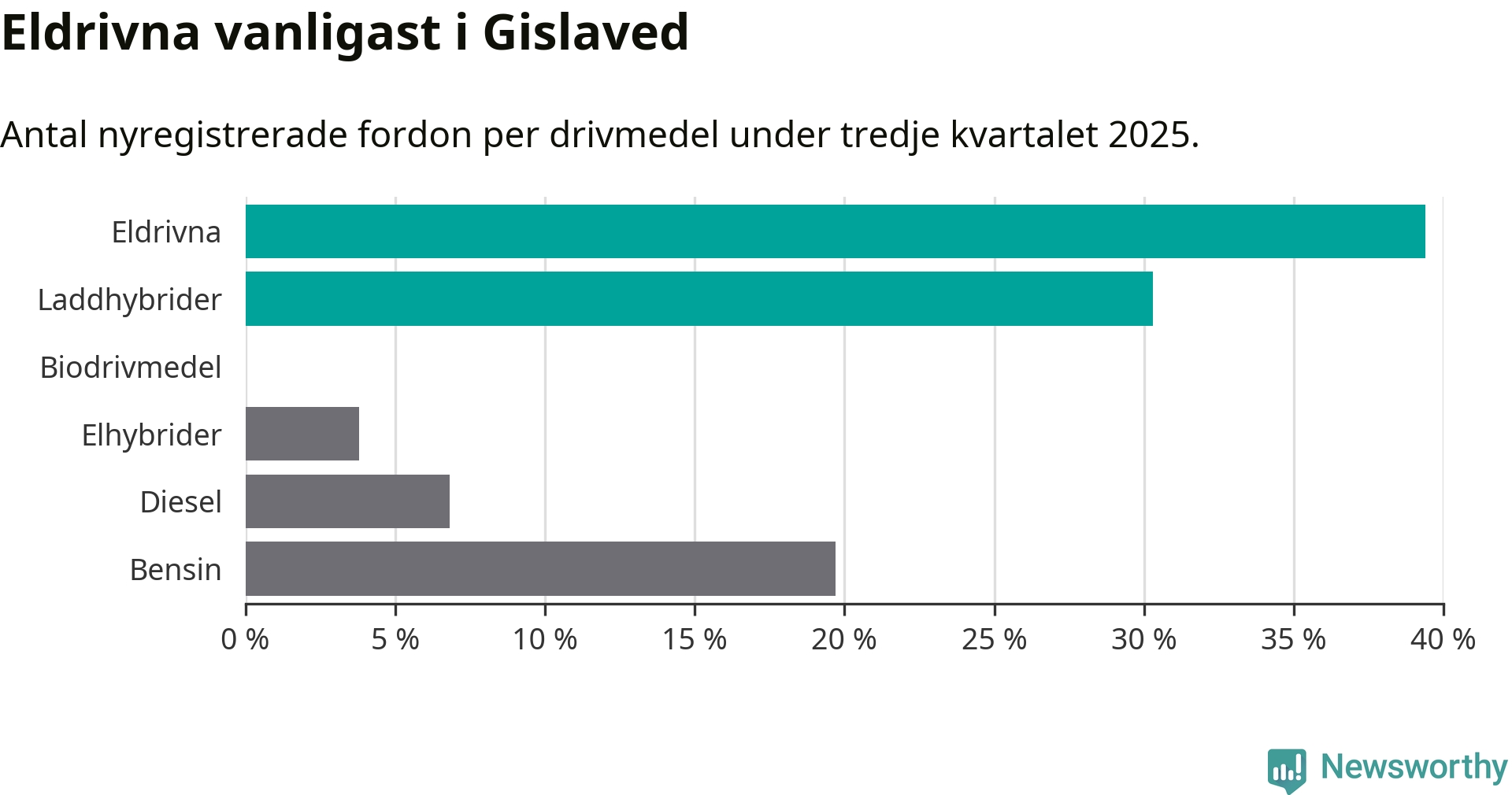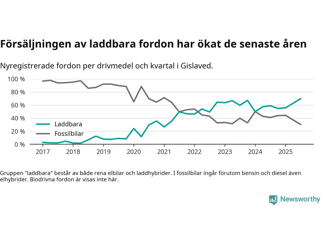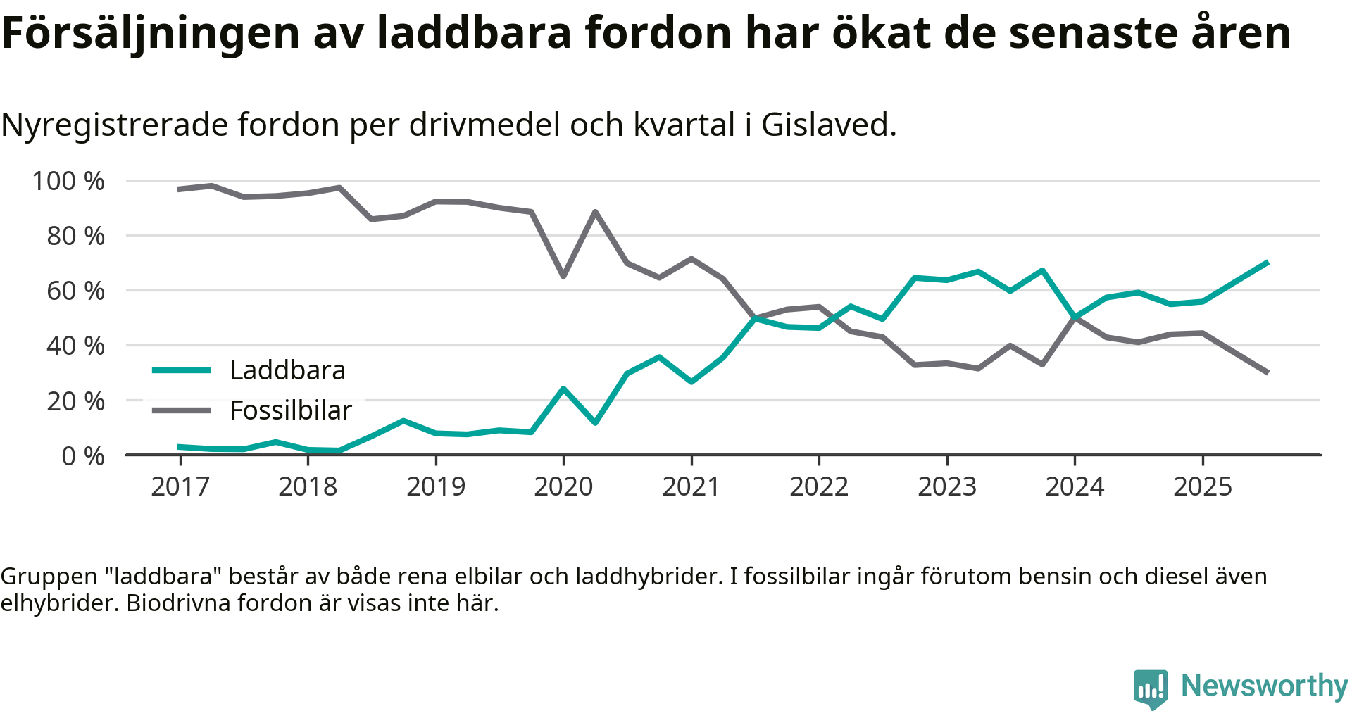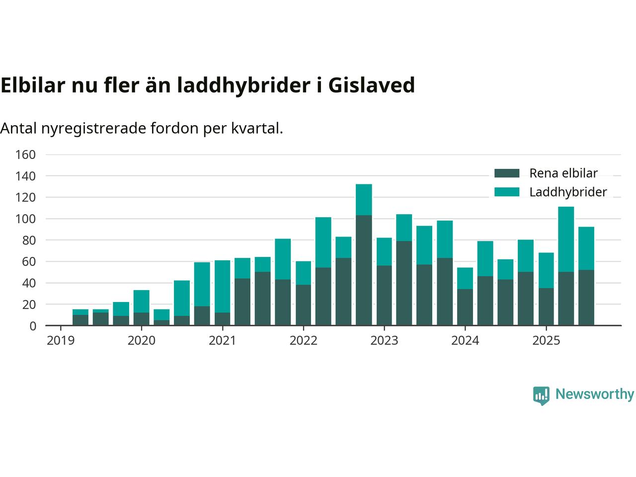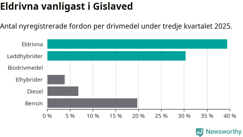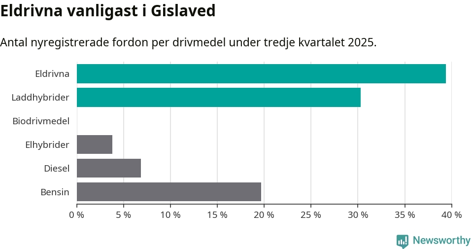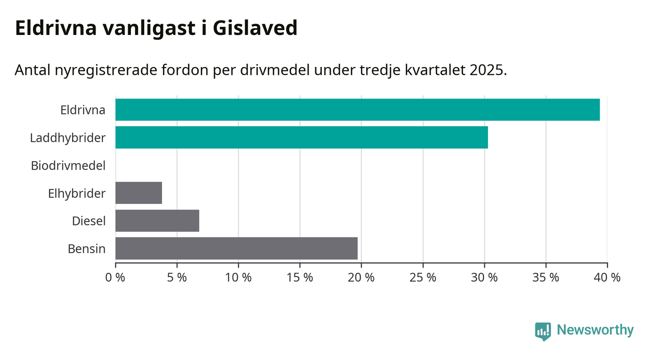 Under tredje kvartalet 2025 var 70 procent av alla nyregistrerade personbilar i Gislaved laddbara (sammanlagt registrerades 132 nya bilar). Merparten av de laddbara bilarna var rena elbilar (39 procent av alla).