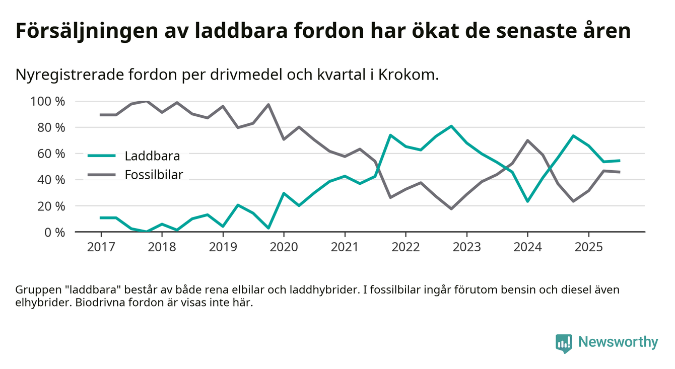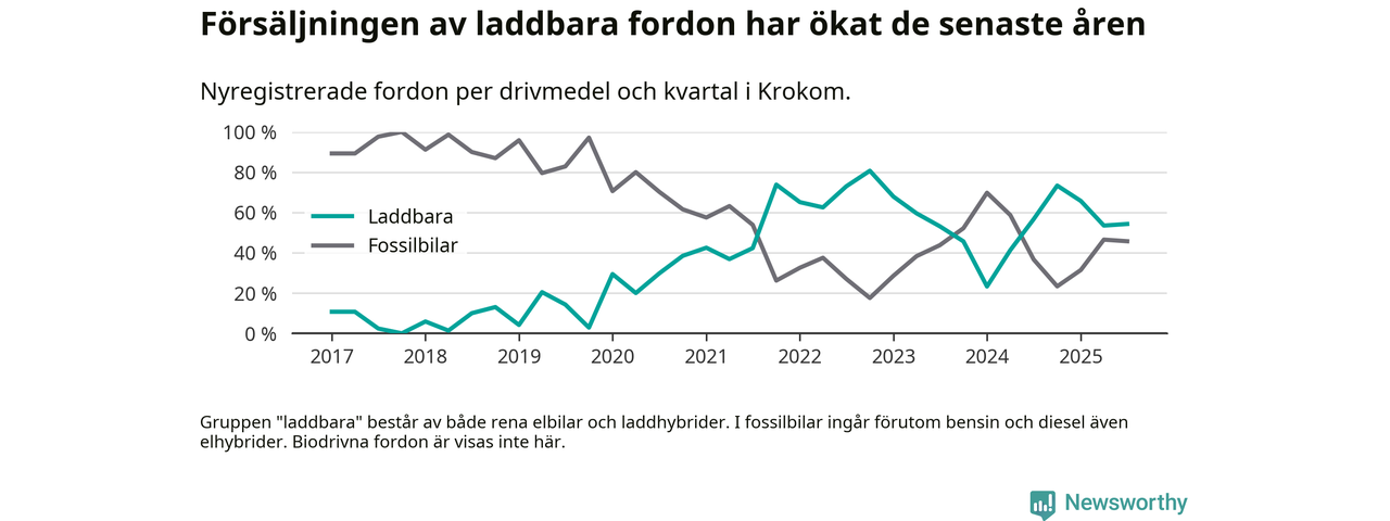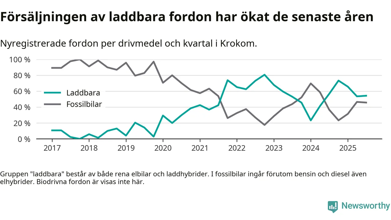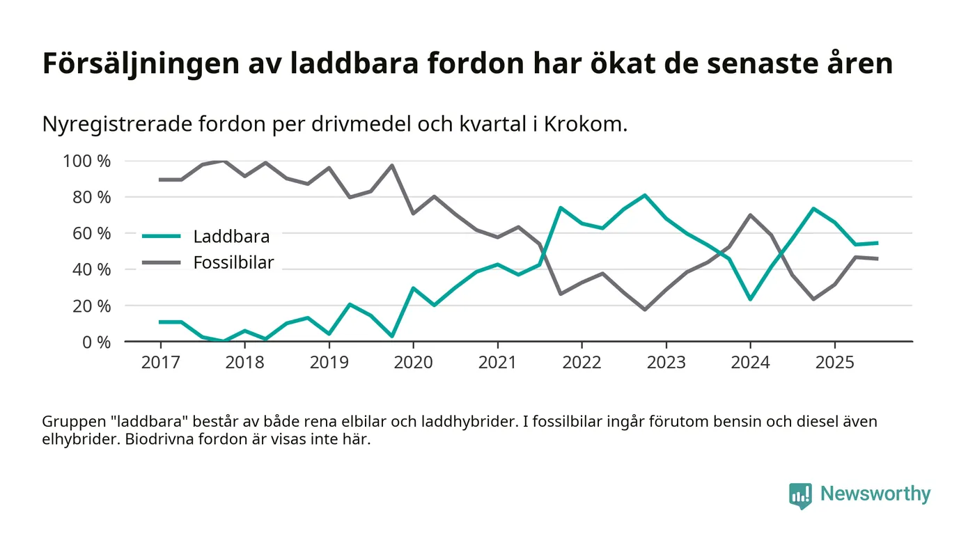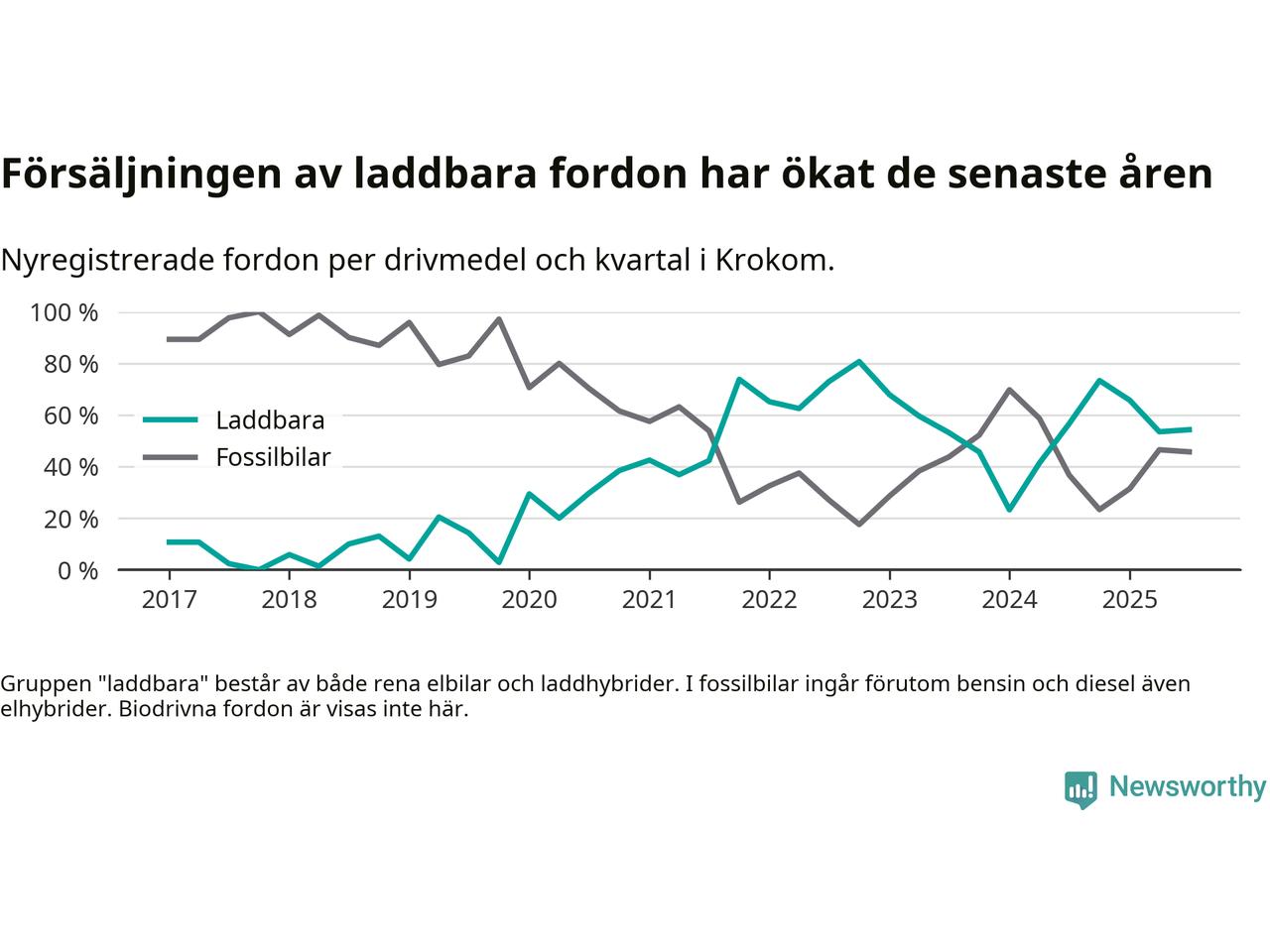 Under tredje kvartalet var hälften av alla nyregistrerade bilar i Krokoms kommun rena elbilar eller laddhybrider, en ökning jämfört med kvartalet innan. I riket däremot minskade andelen laddbara bilar något. Framför allt elbilsförsäljningen har tappat fart.