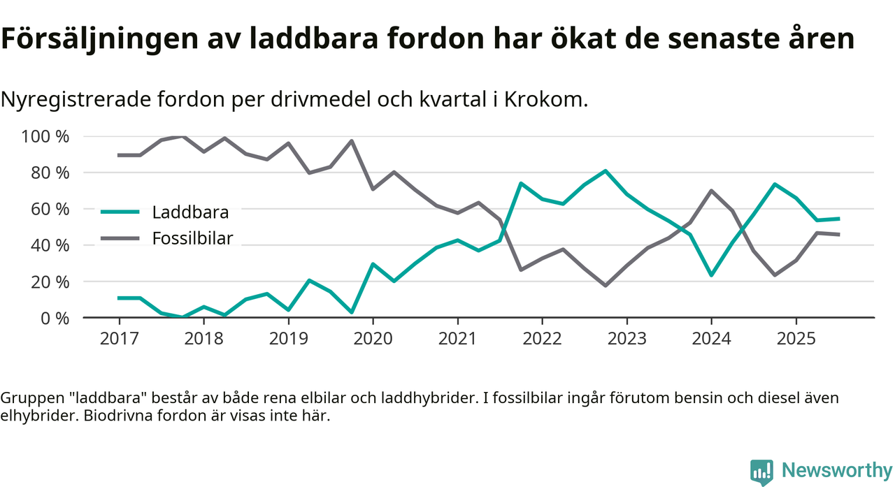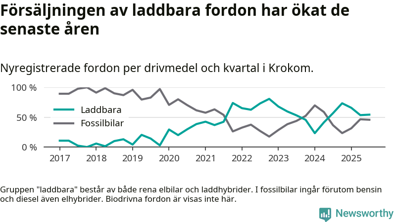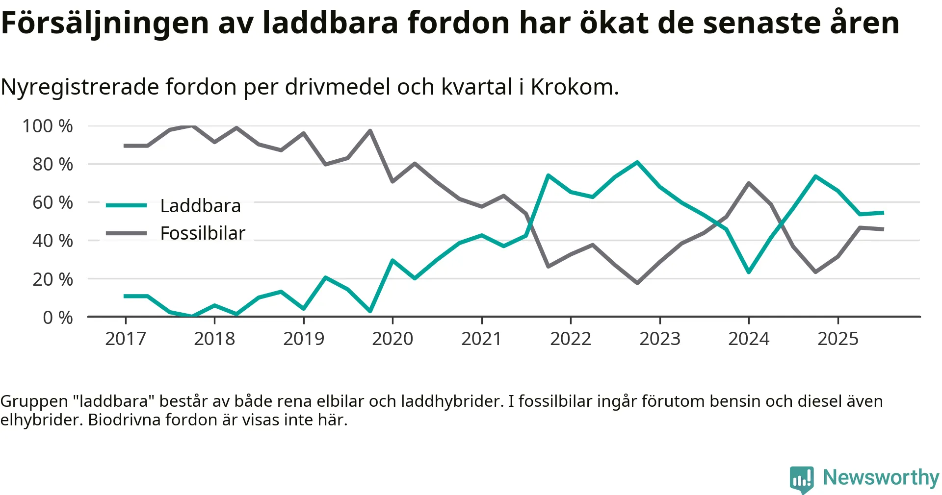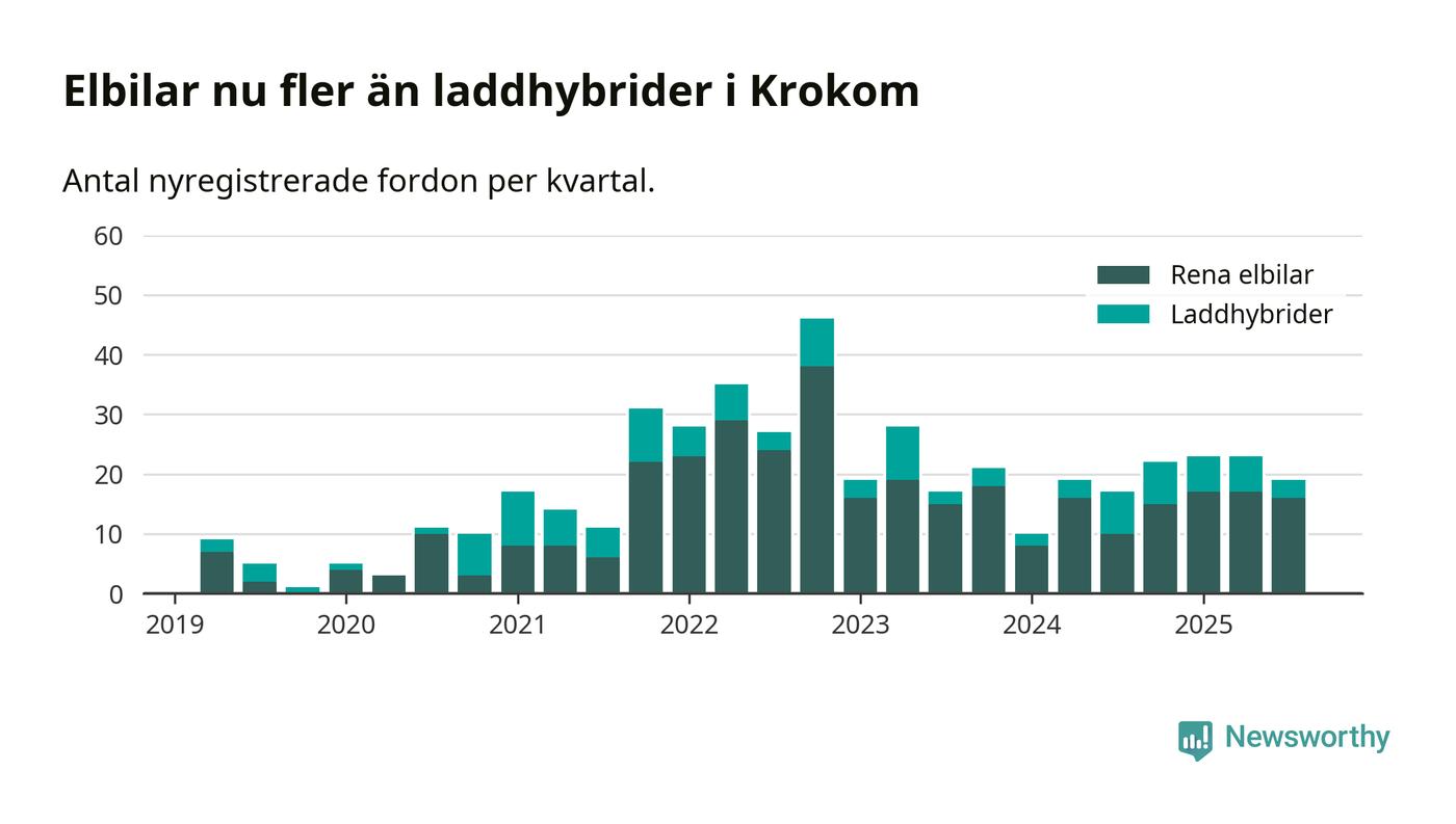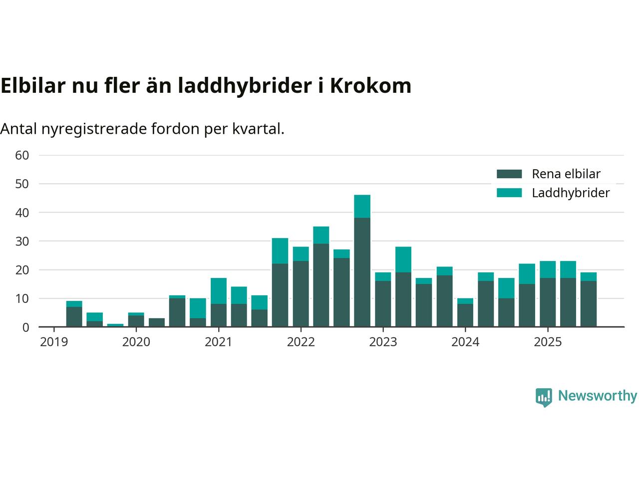 Under tredje kvartalet var hälften av alla nyregistrerade bilar i Krokoms kommun rena elbilar eller laddhybrider, en ökning jämfört med kvartalet innan. I riket däremot minskade andelen laddbara bilar något. Framför allt elbilsförsäljningen har tappat fart.