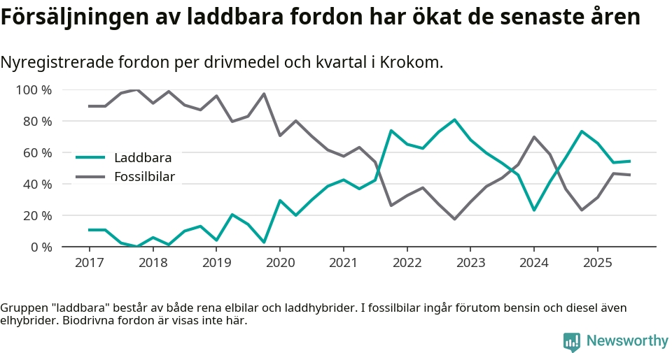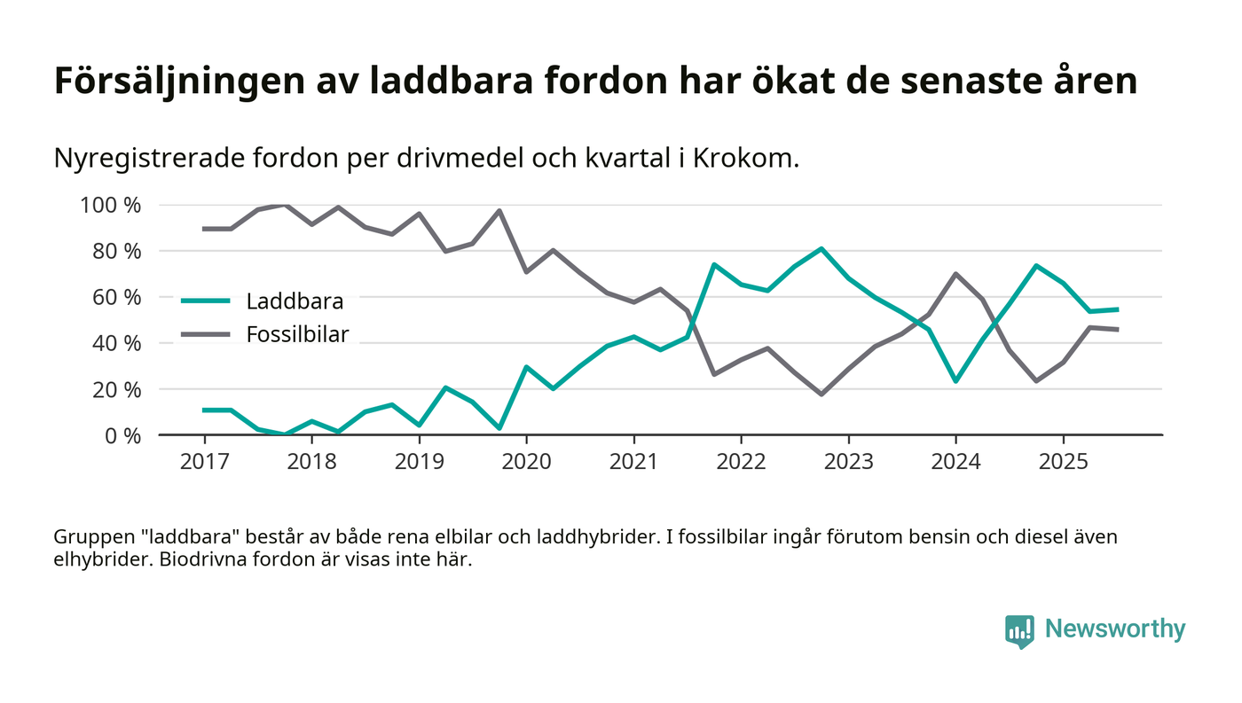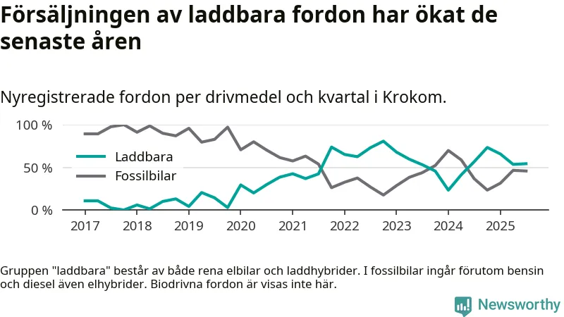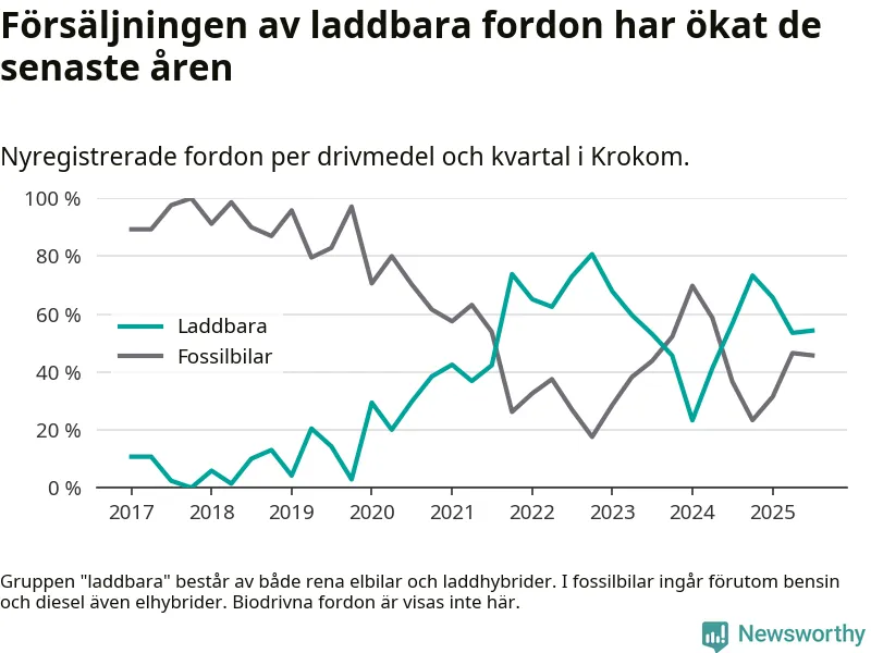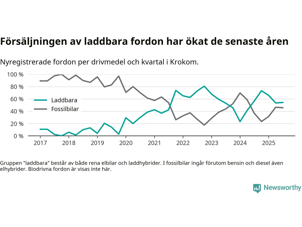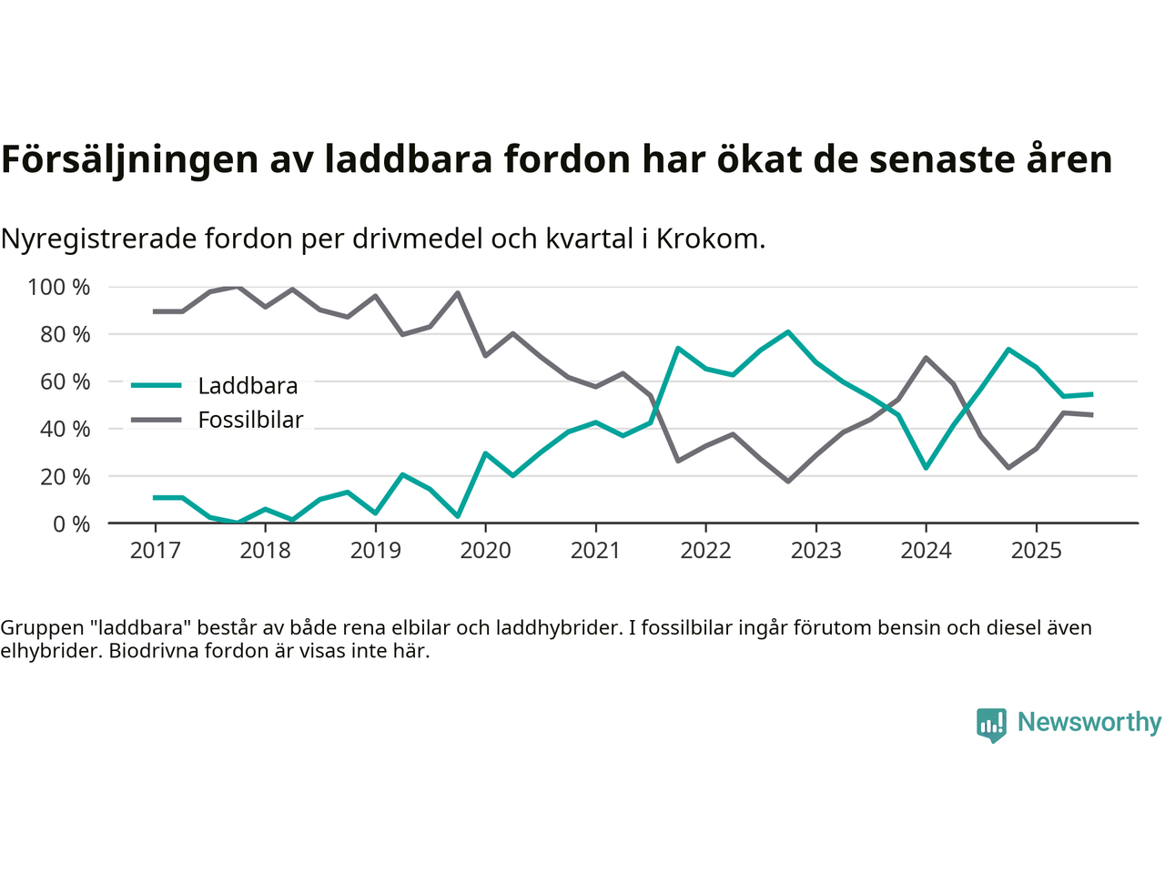 Under tredje kvartalet 2025 var 54 procent av alla nyregistrerade personbilar i Krokom laddbara (sammanlagt registrerades 35 nya bilar). Merparten av de laddbara bilarna var rena elbilar (46 procent av alla).