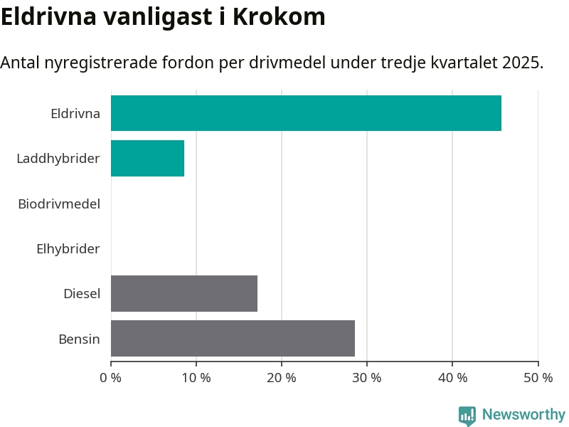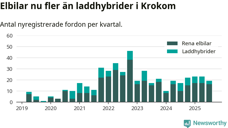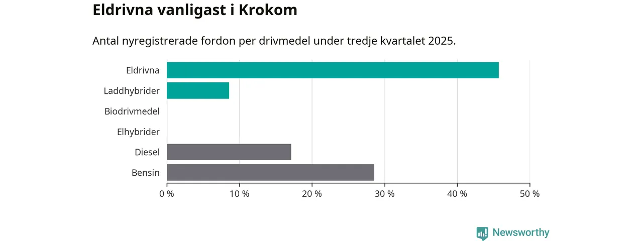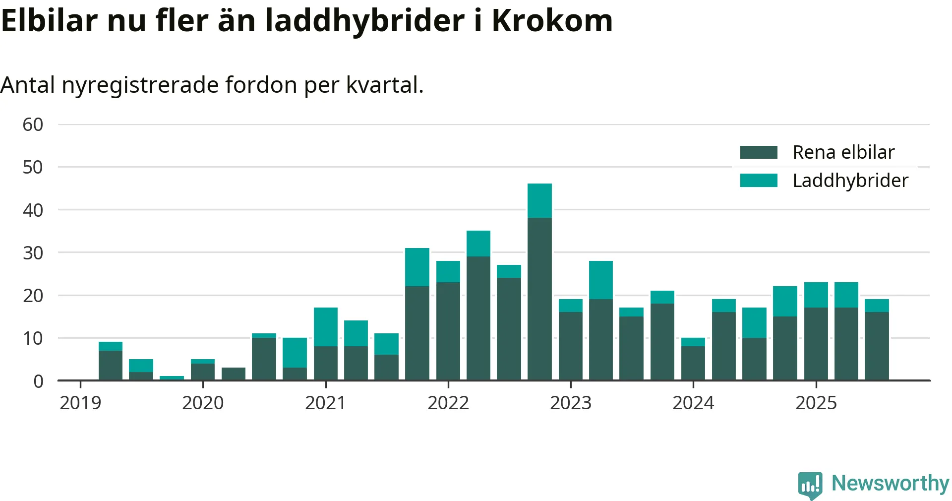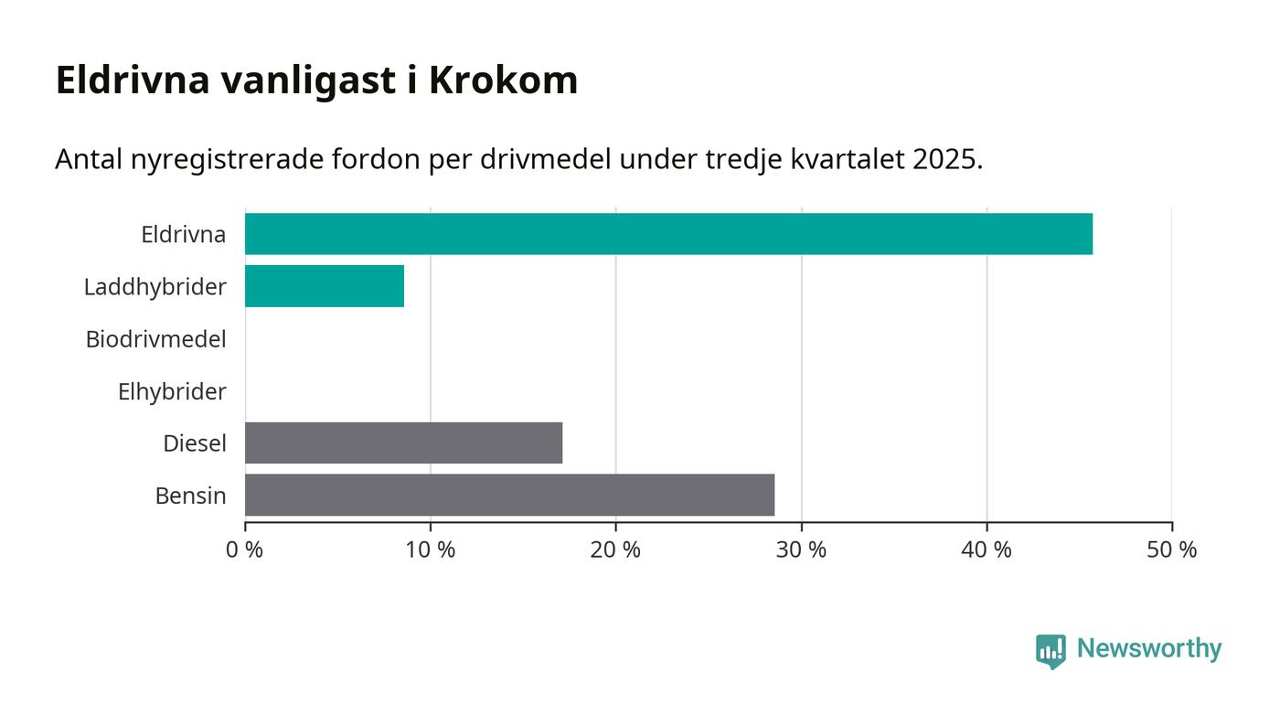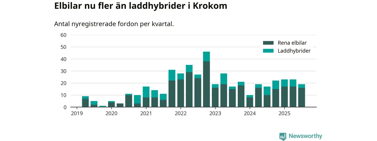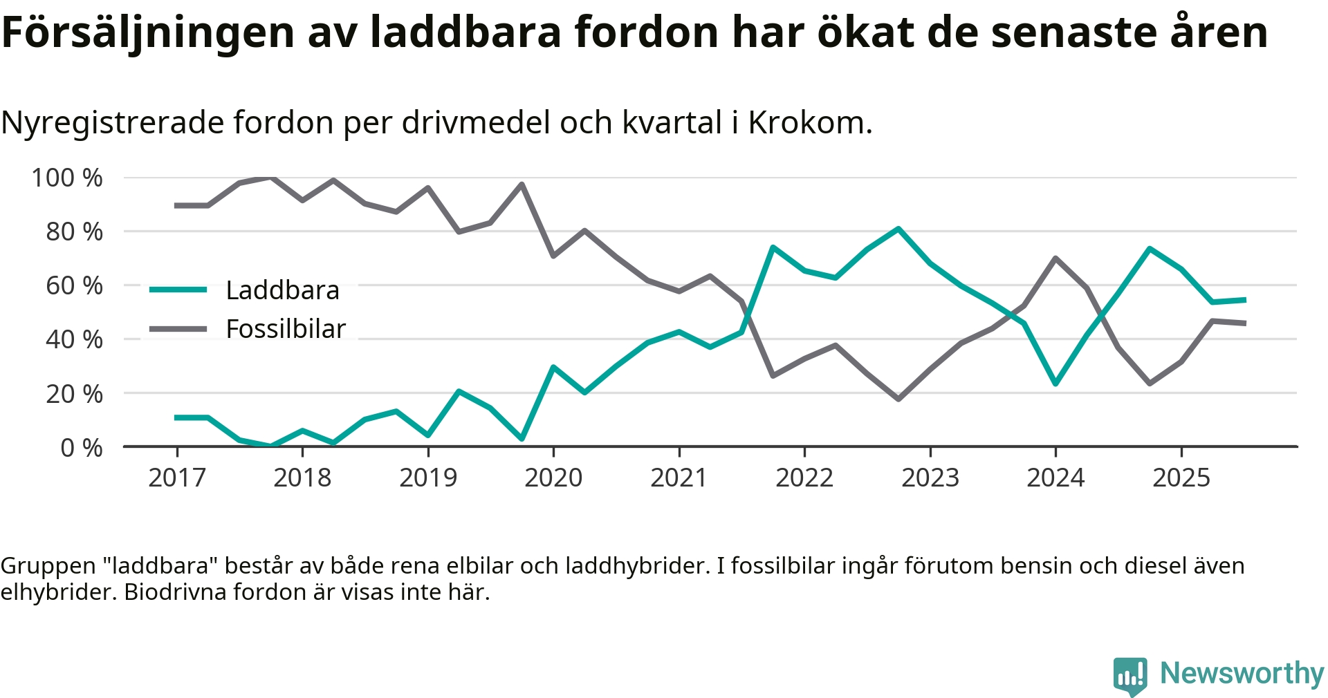 Under tredje kvartalet 2025 var 54 procent av alla nyregistrerade personbilar i Krokom laddbara (sammanlagt registrerades 35 nya bilar). Merparten av de laddbara bilarna var rena elbilar (46 procent av alla).