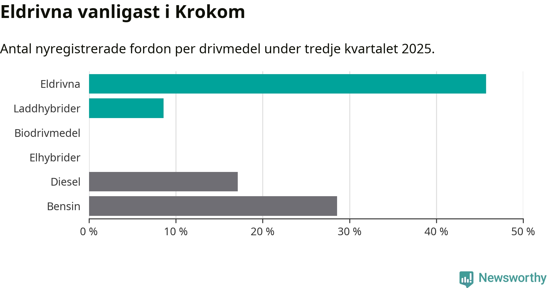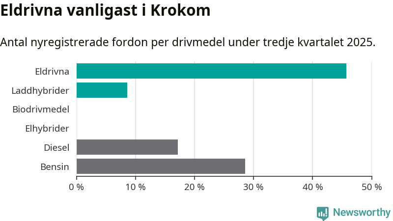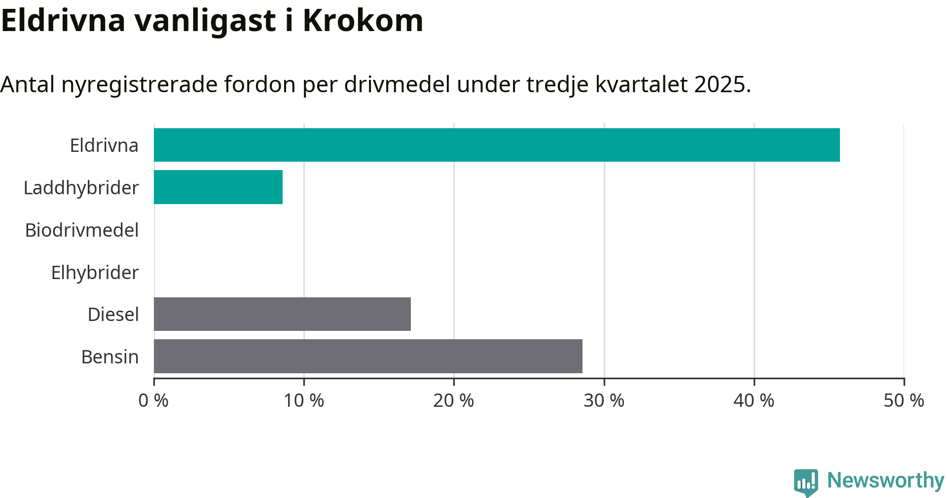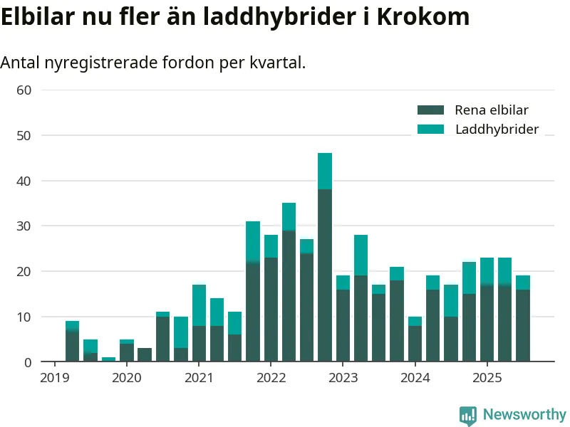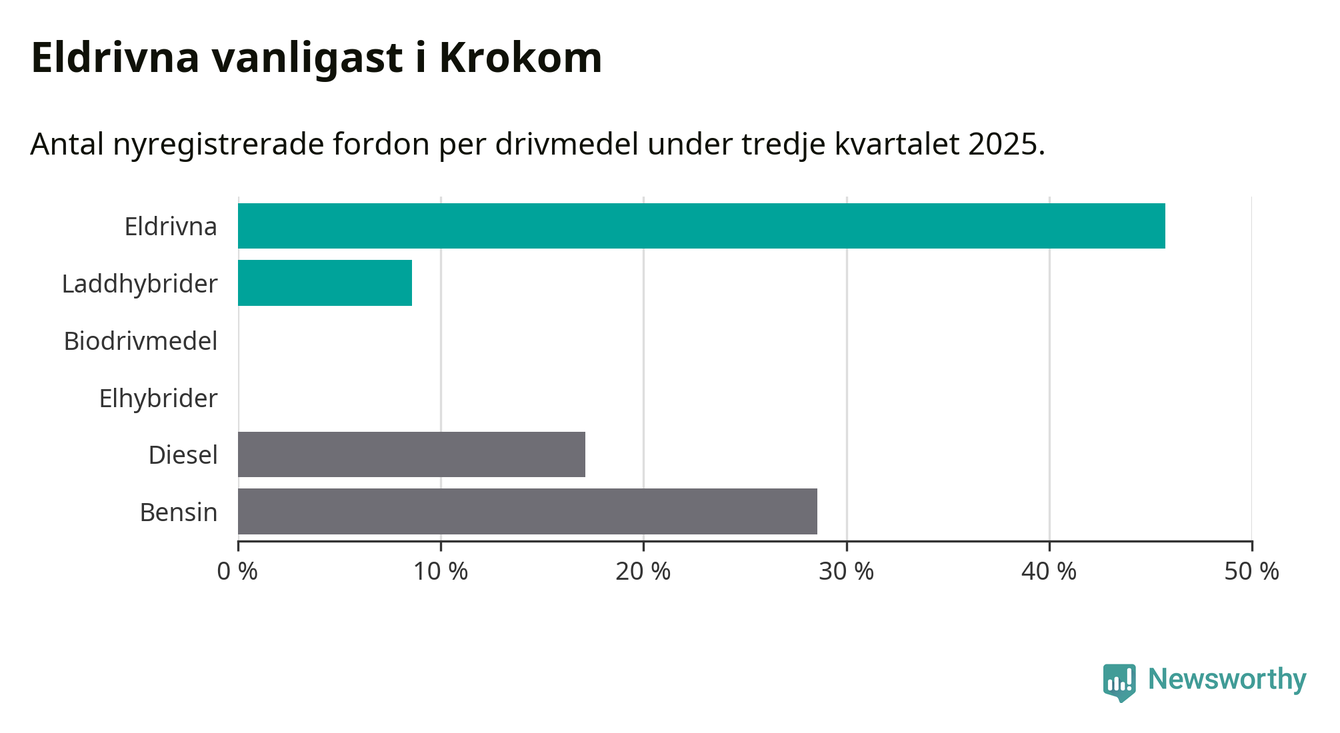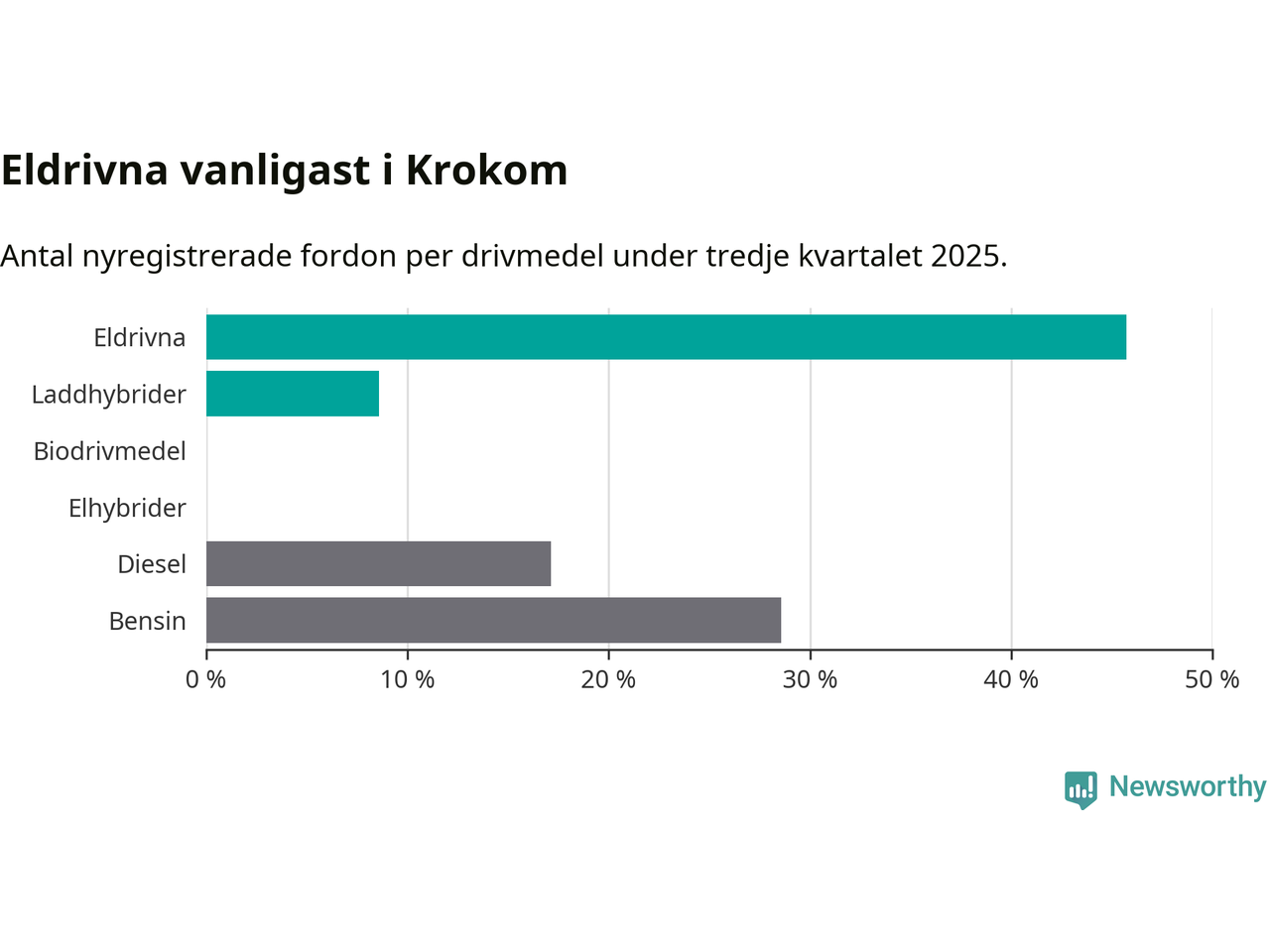 Under tredje kvartalet 2025 var 54 procent av alla nyregistrerade personbilar i Krokom laddbara (sammanlagt registrerades 35 nya bilar). Merparten av de laddbara bilarna var rena elbilar (46 procent av alla).