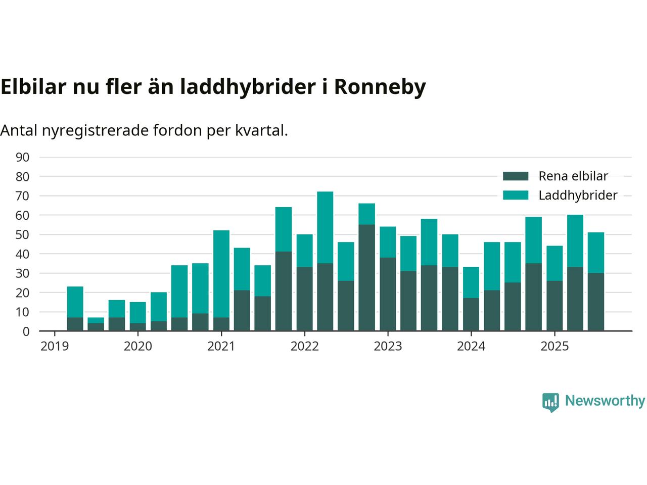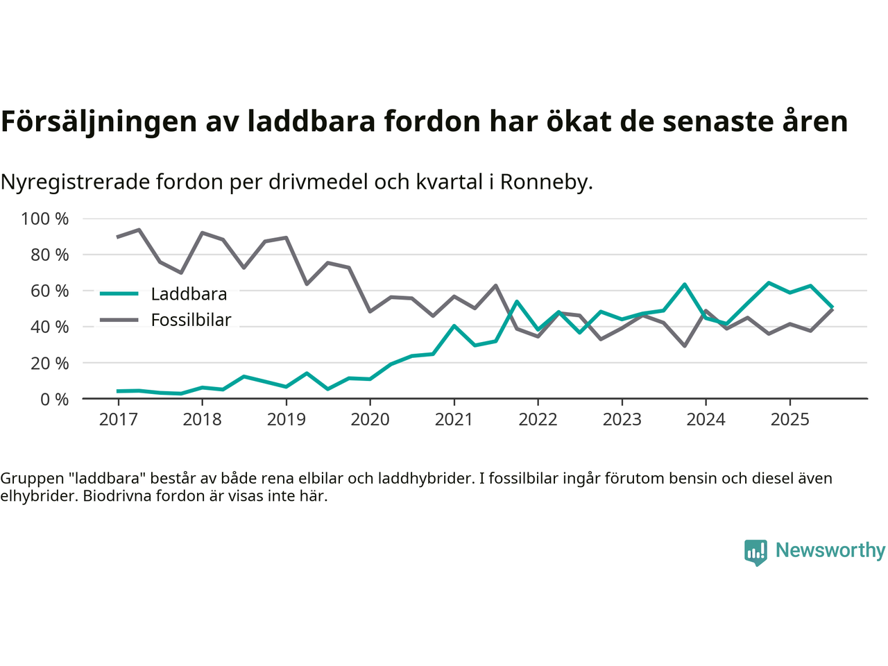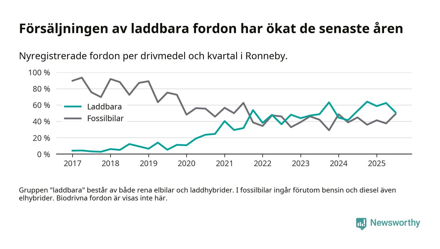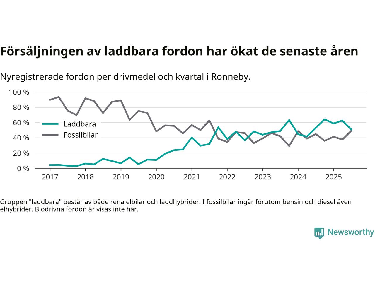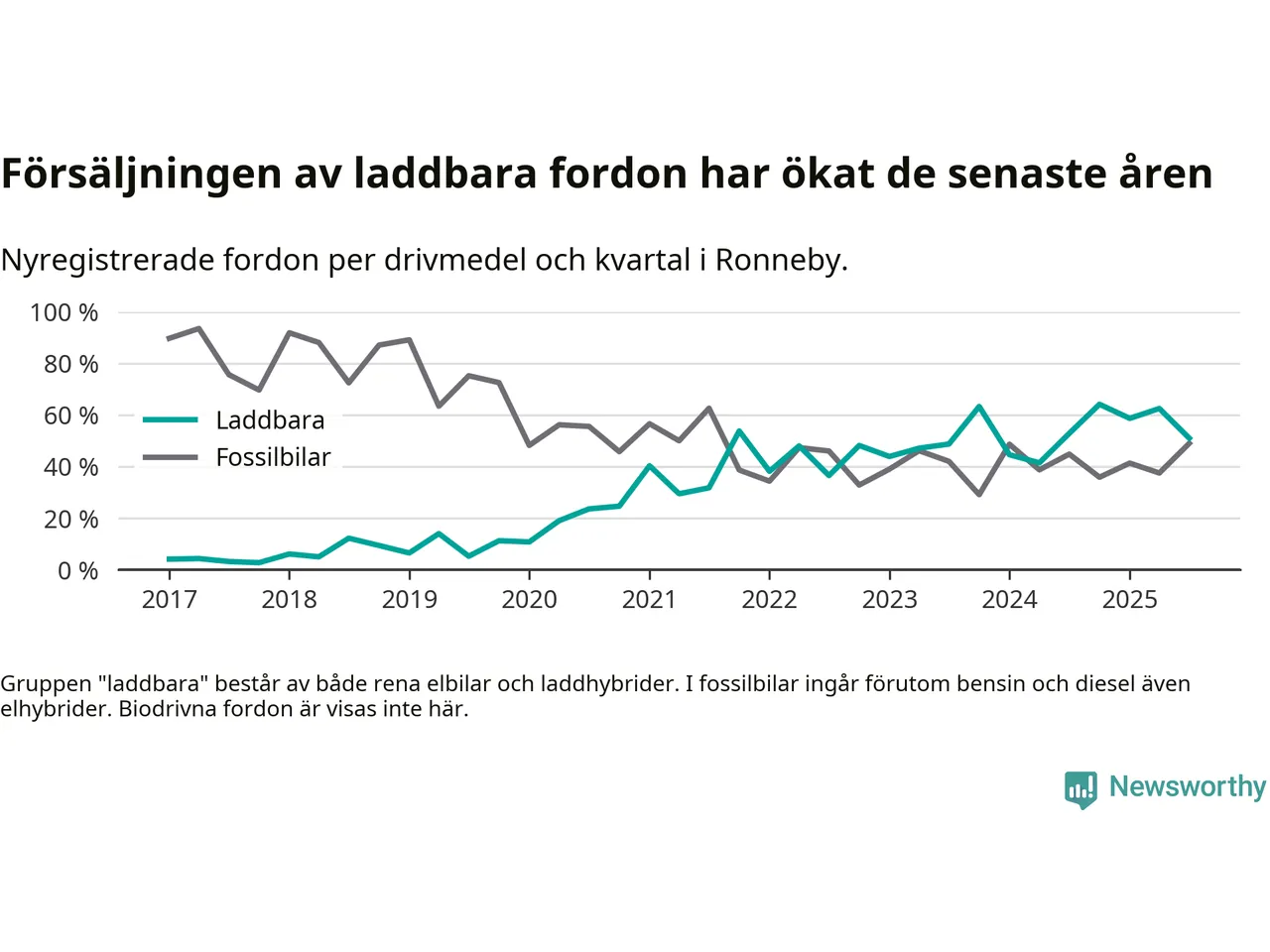 Under tredje kvartalet 2025 var 51 procent av alla nyregistrerade personbilar i Ronneby laddbara (sammanlagt registrerades 100 nya bilar). Merparten av de laddbara bilarna var rena elbilar (30 procent av alla).