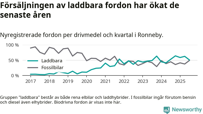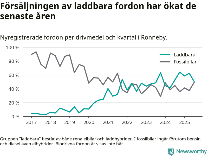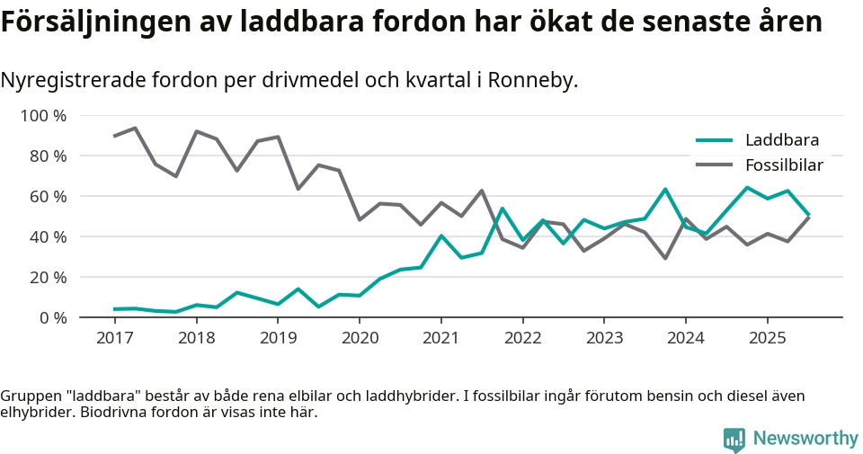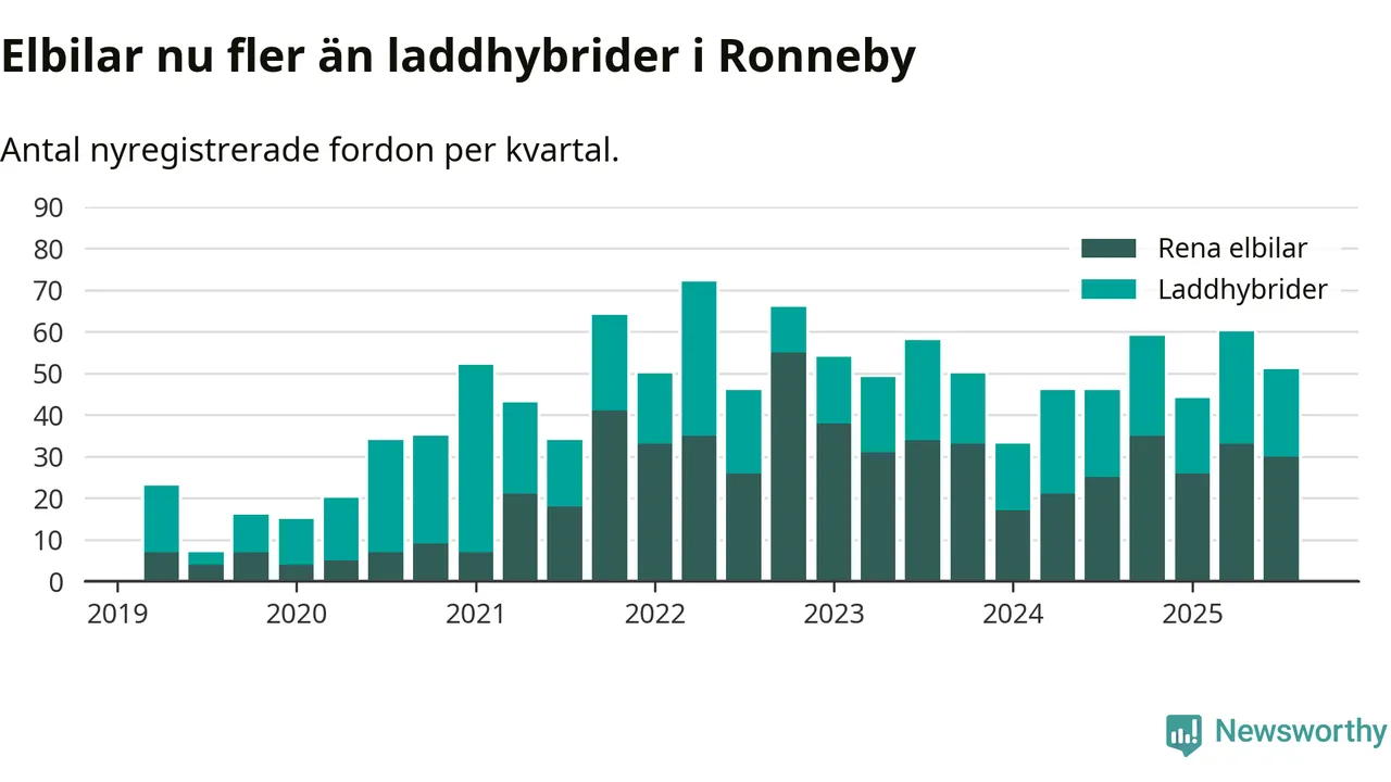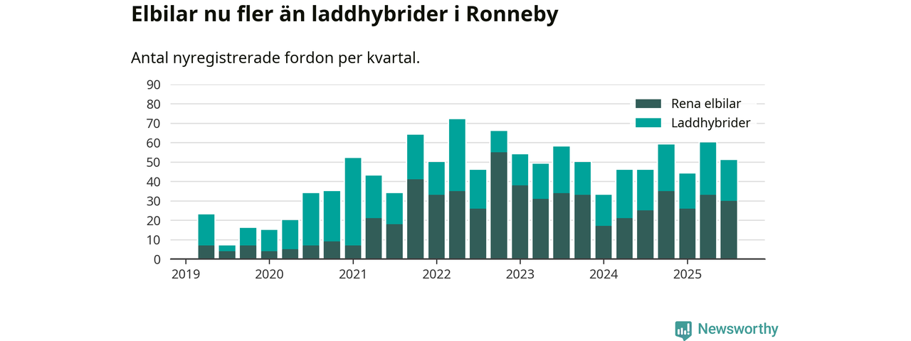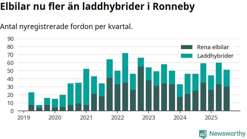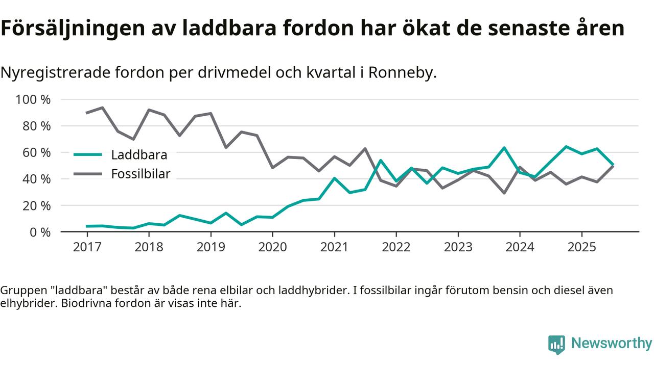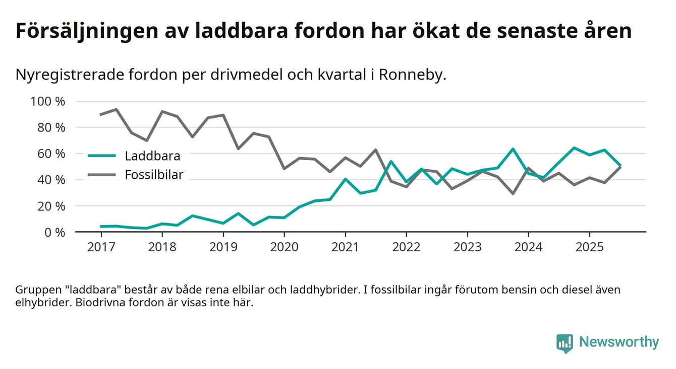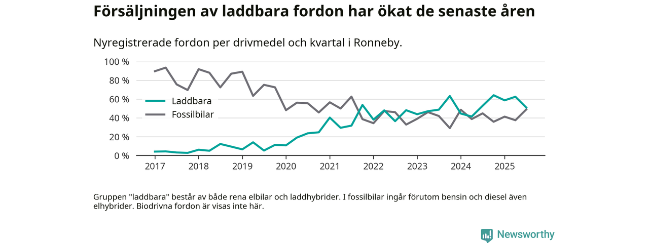 Under tredje kvartalet 2025 var 51 procent av alla nyregistrerade personbilar i Ronneby laddbara (sammanlagt registrerades 100 nya bilar). Merparten av de laddbara bilarna var rena elbilar (30 procent av alla).