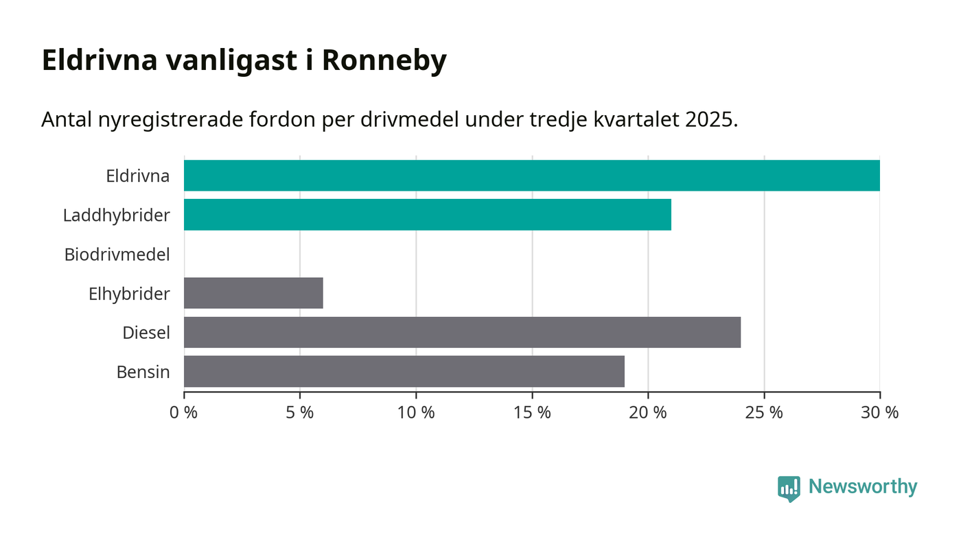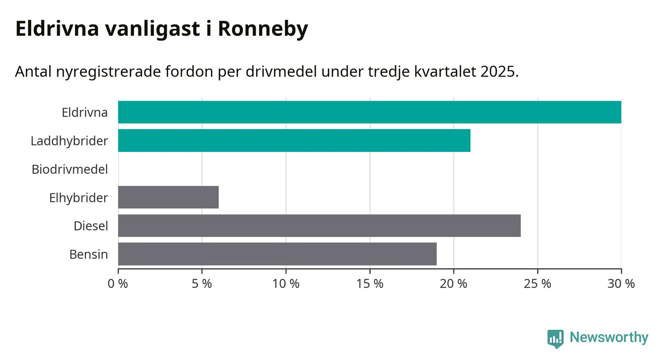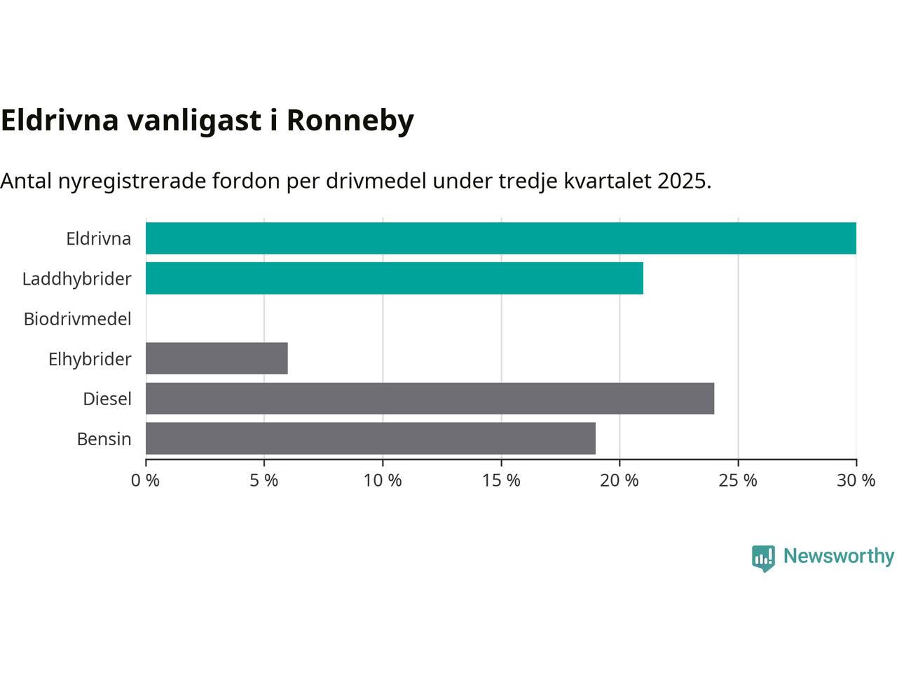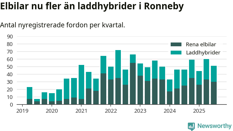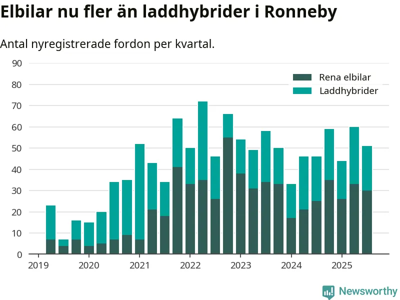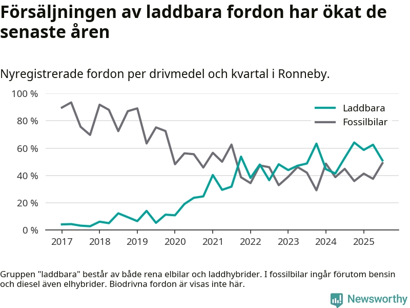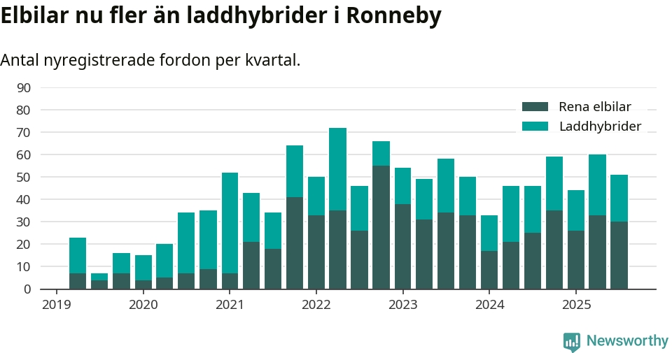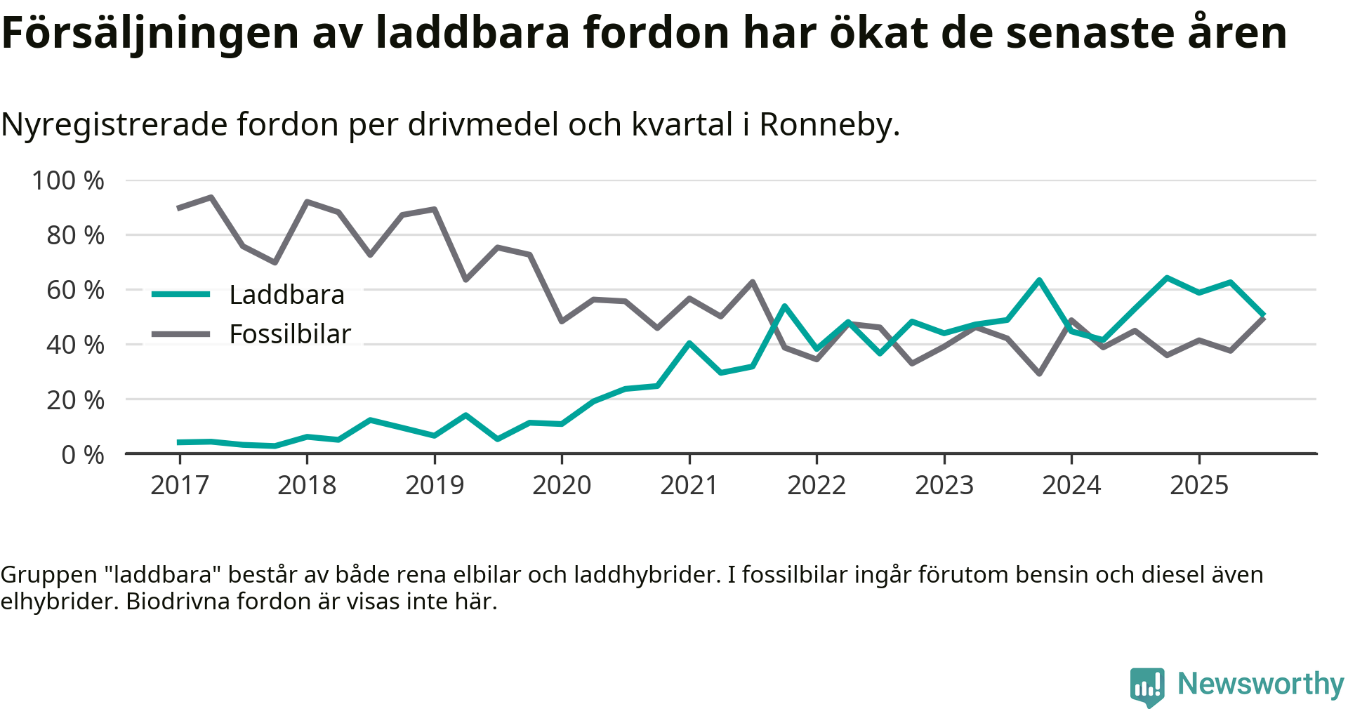 Under tredje kvartalet 2025 var 51 procent av alla nyregistrerade personbilar i Ronneby laddbara (sammanlagt registrerades 100 nya bilar). Merparten av de laddbara bilarna var rena elbilar (30 procent av alla).