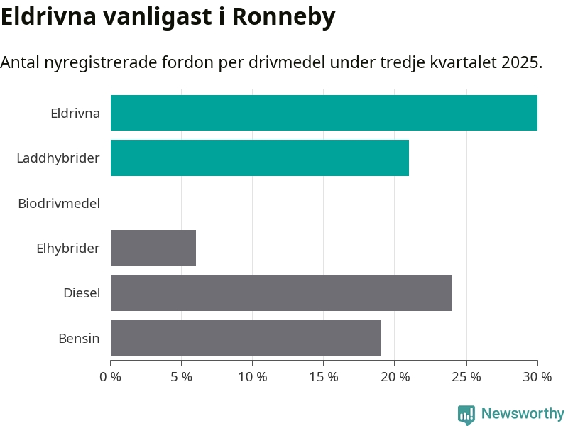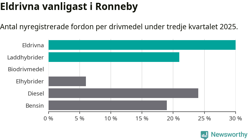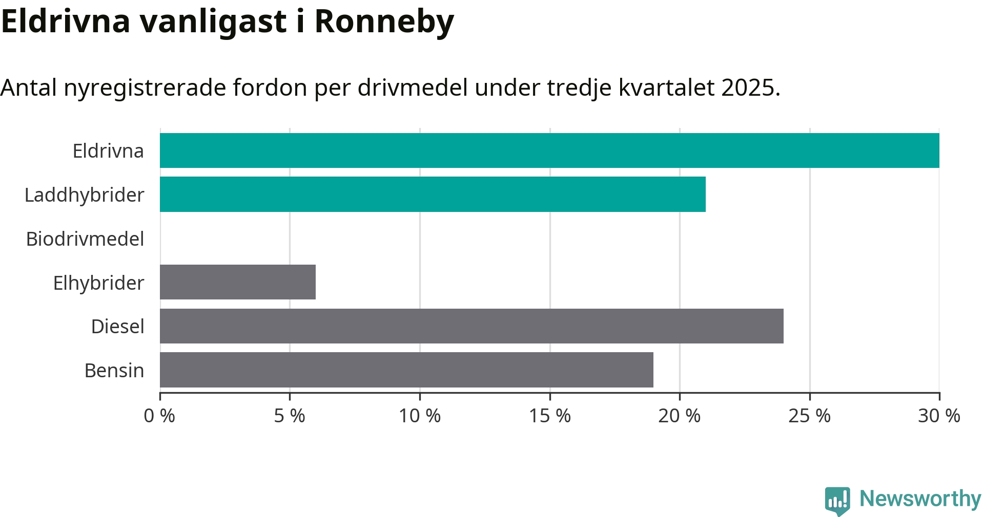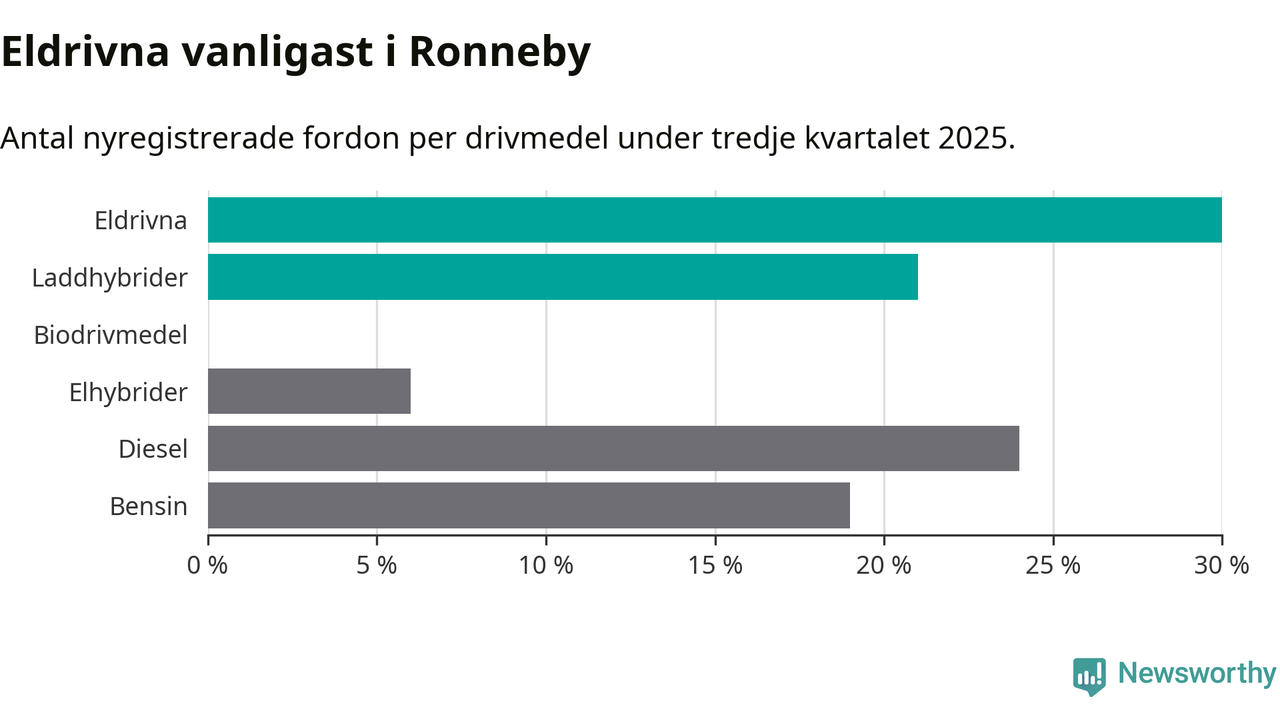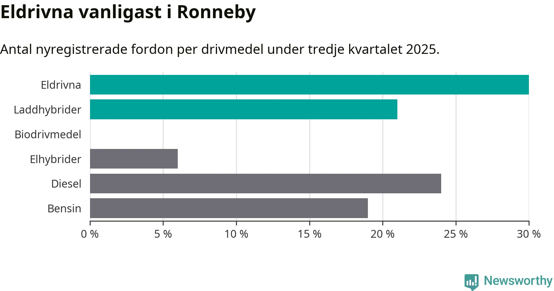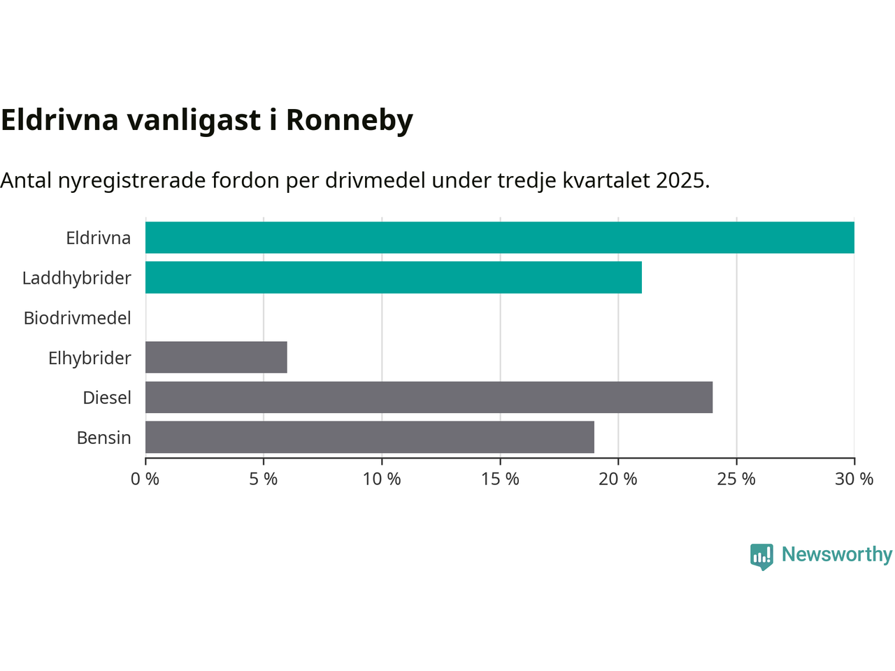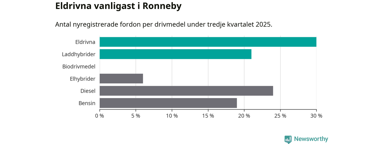 Under tredje kvartalet 2025 var 51 procent av alla nyregistrerade personbilar i Ronneby laddbara (sammanlagt registrerades 100 nya bilar). Merparten av de laddbara bilarna var rena elbilar (30 procent av alla).