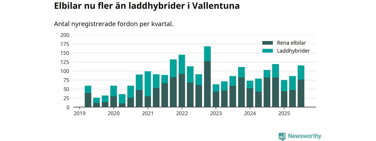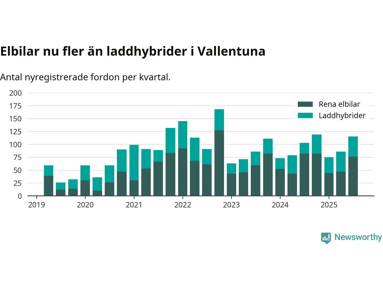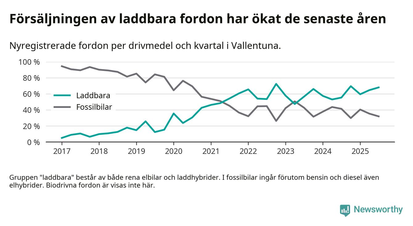 Under tredje kvartalet var sju av tio nyregistrerade bilar i Vallentuna kommun rena elbilar eller laddhybrider, en ökning jämfört med kvartalet innan. I riket däremot minskade andelen laddbara bilar något. Framför allt elbilsförsäljningen har tappat fart.