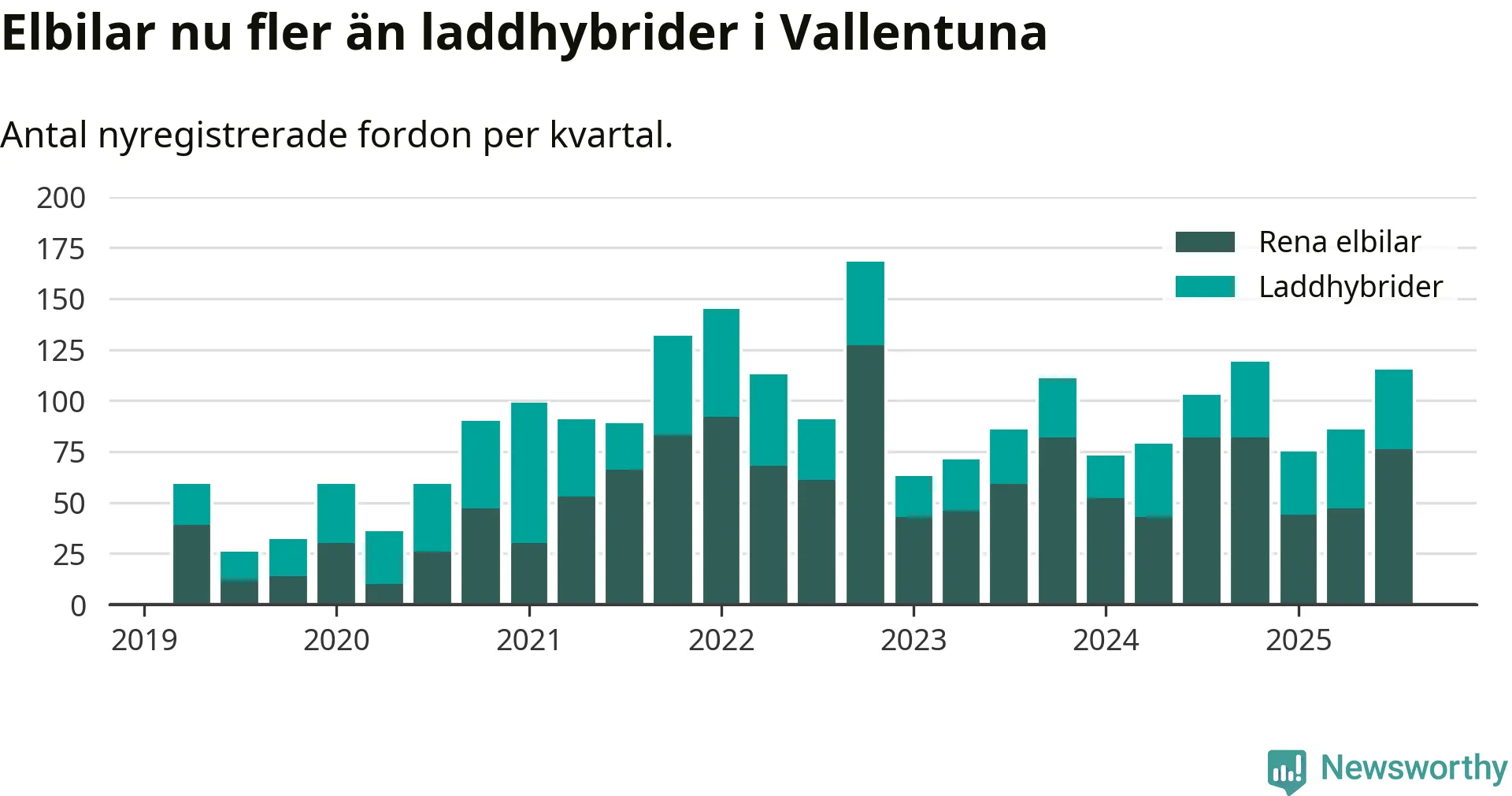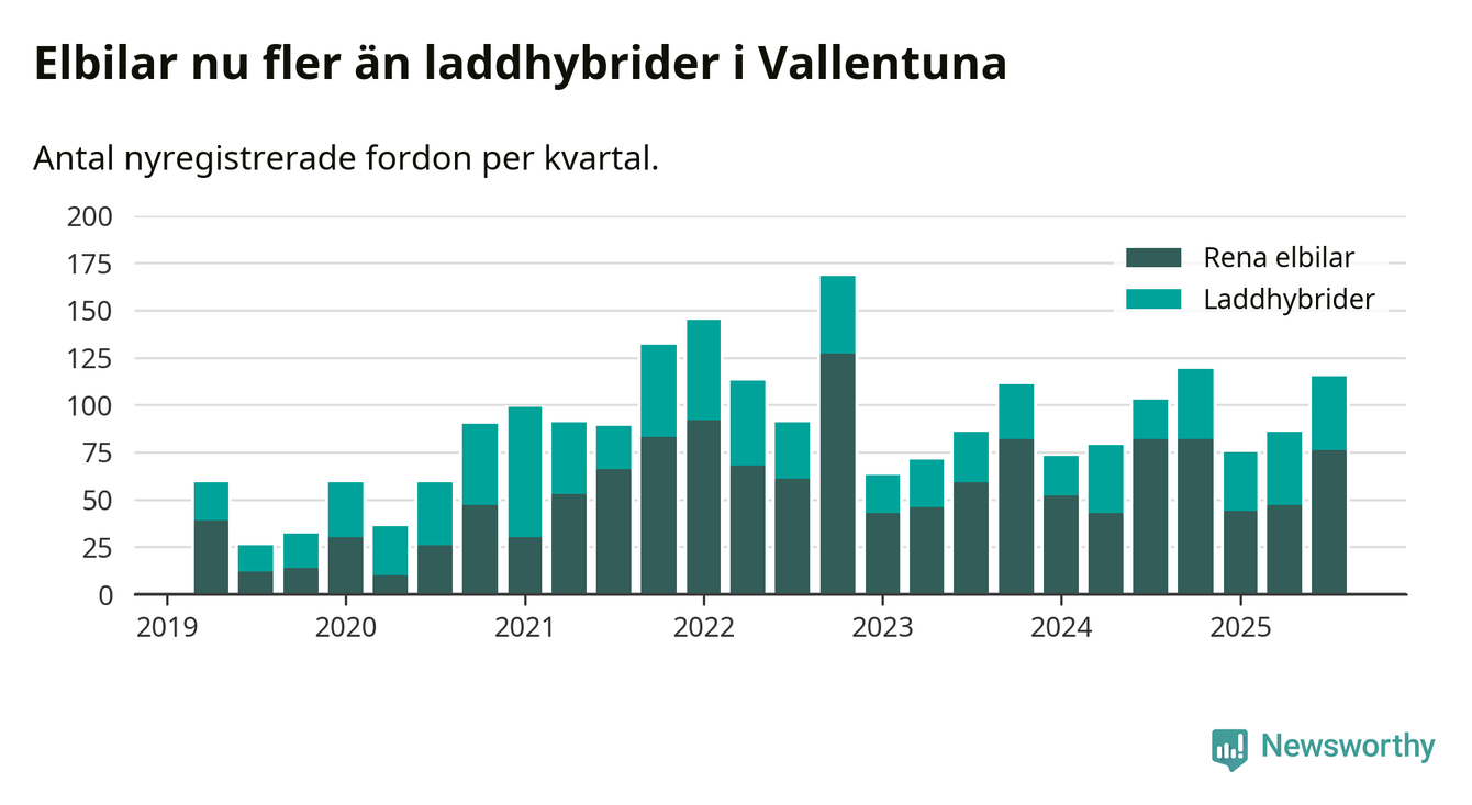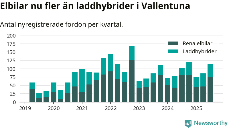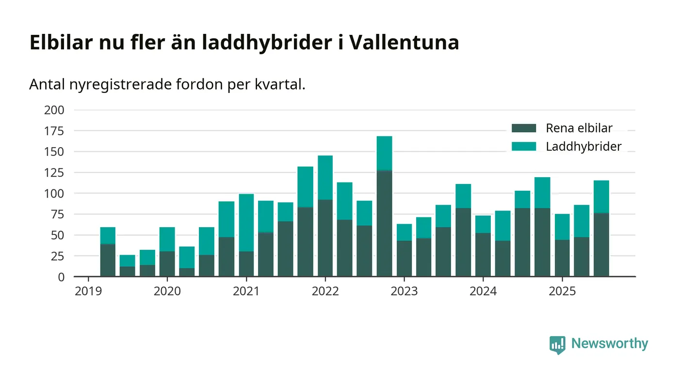 Under tredje kvartalet var sju av tio nyregistrerade bilar i Vallentuna kommun rena elbilar eller laddhybrider, en ökning jämfört med kvartalet innan. I riket däremot minskade andelen laddbara bilar något. Framför allt elbilsförsäljningen har tappat fart.