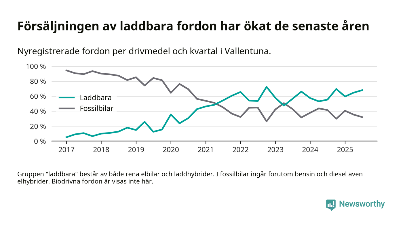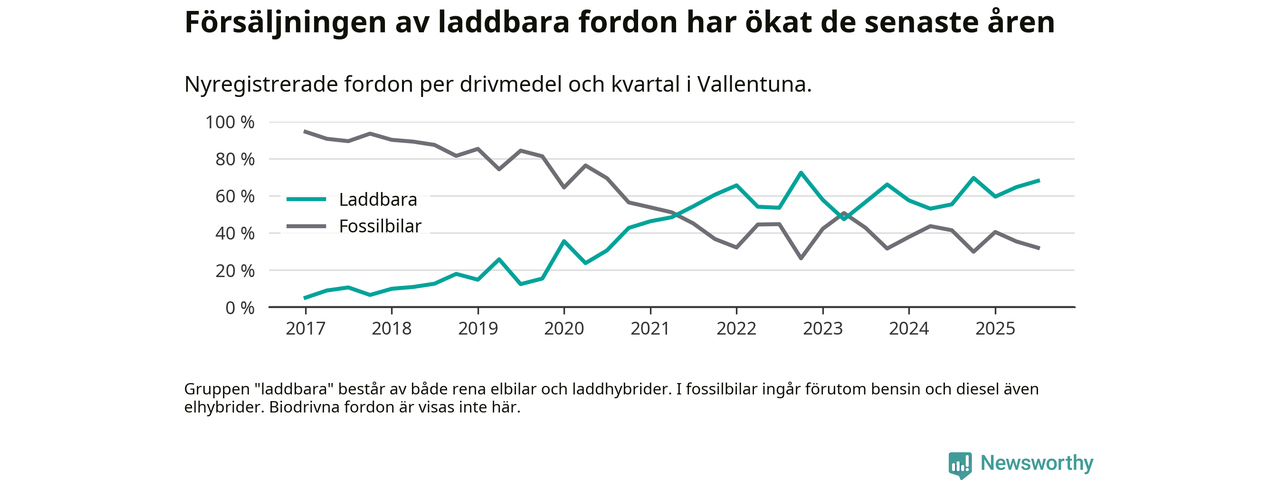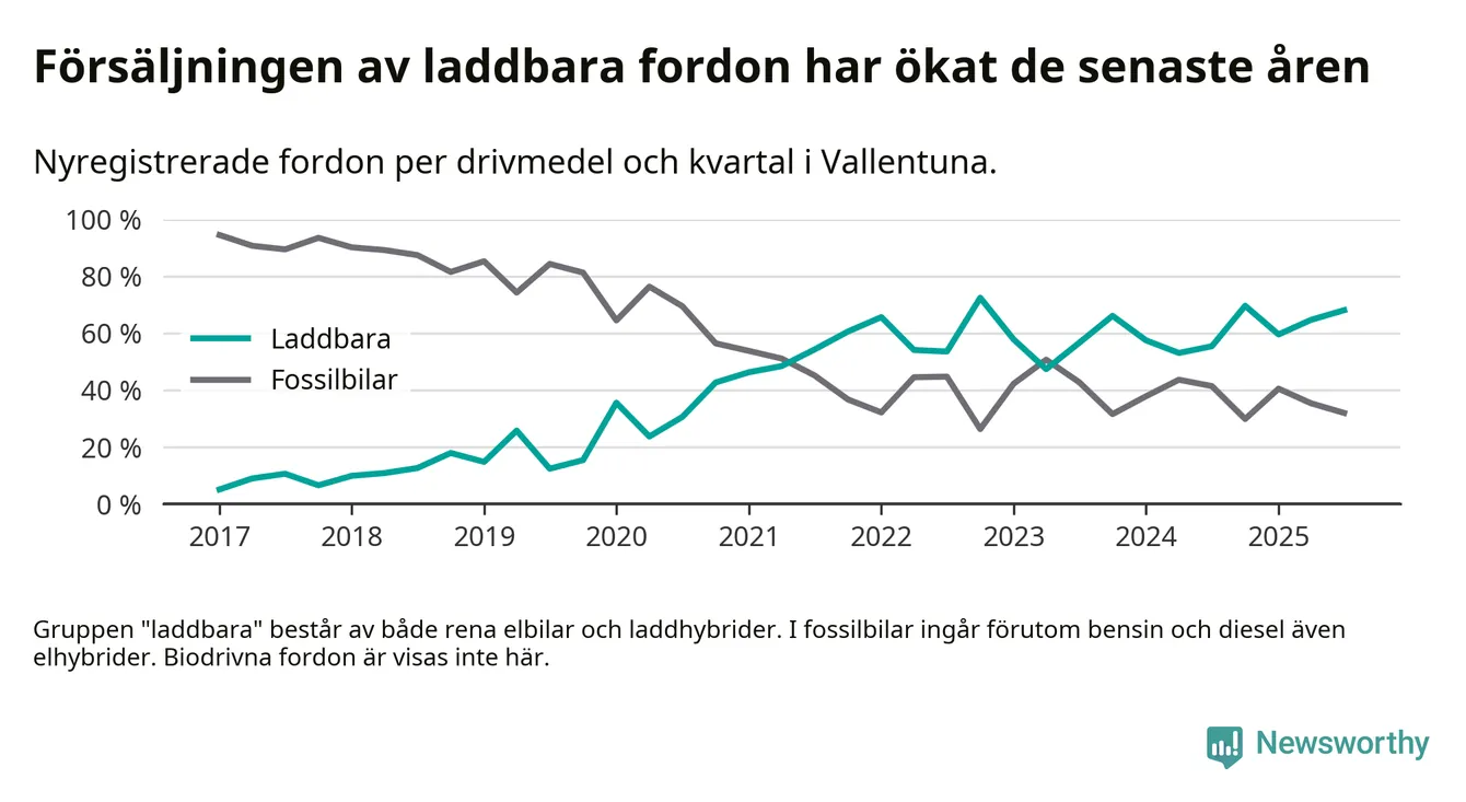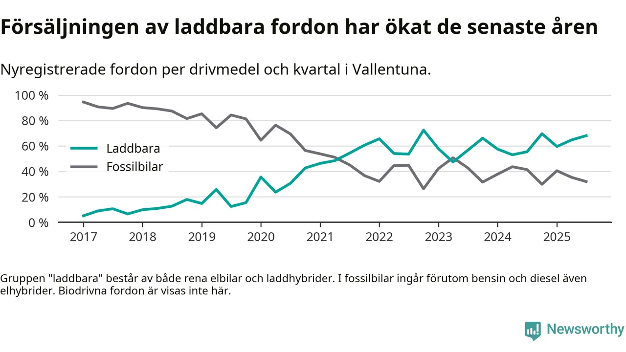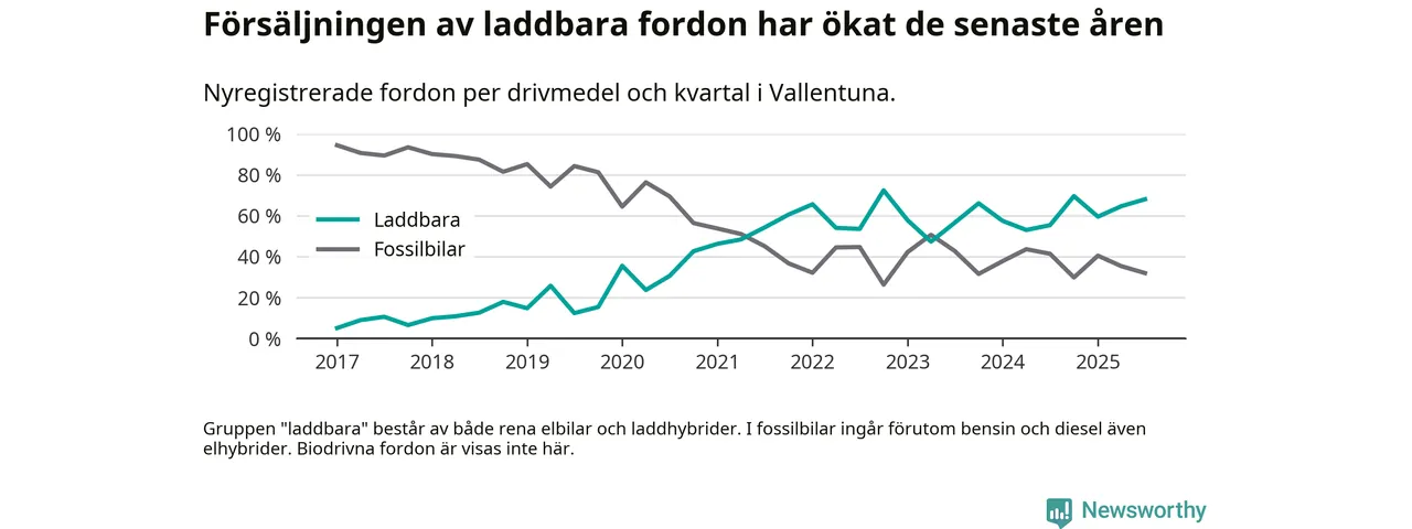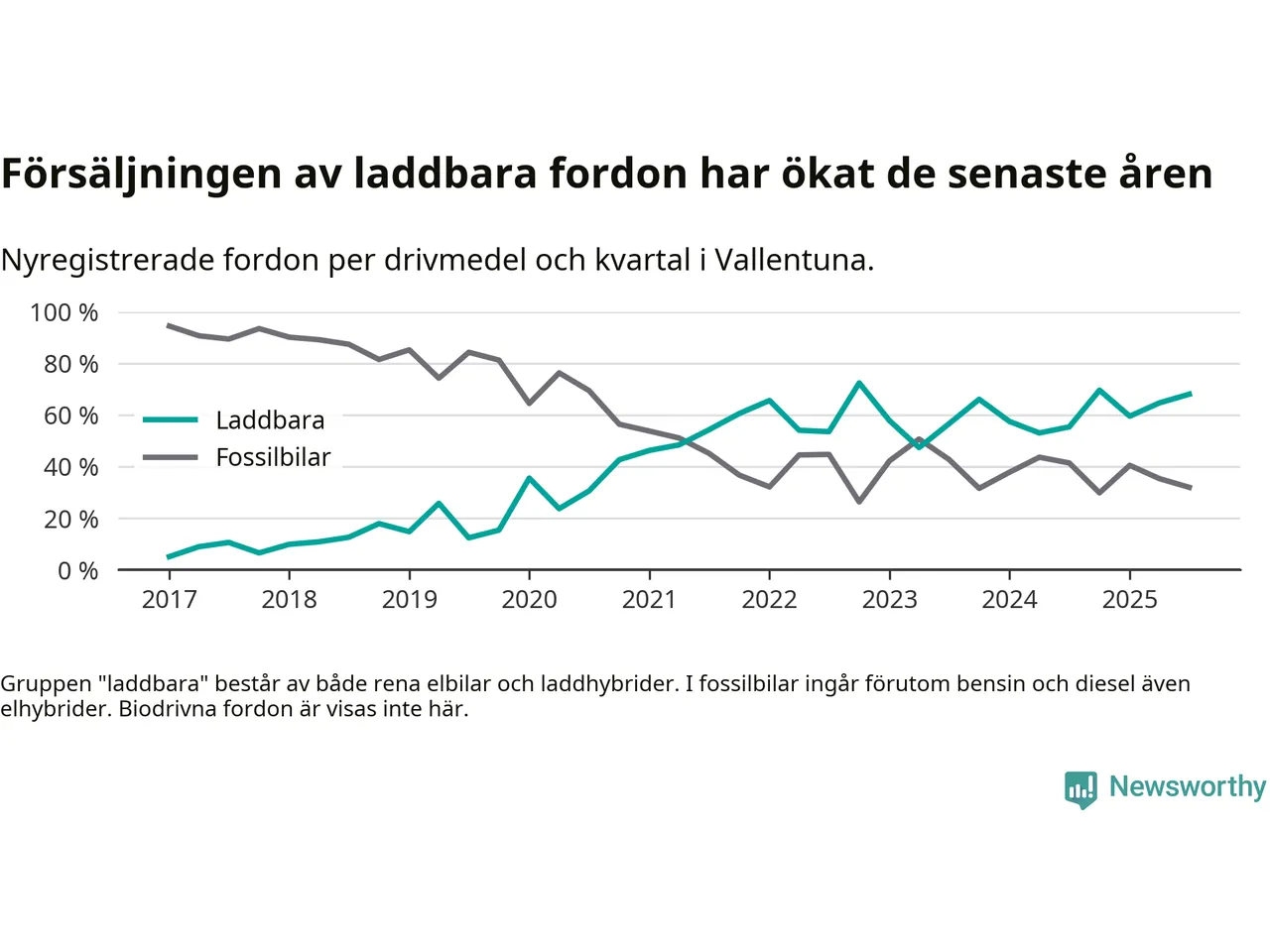 Under tredje kvartalet 2025 var 68 procent av alla nyregistrerade personbilar i Vallentuna laddbara (sammanlagt registrerades 169 nya bilar). Merparten av de laddbara bilarna var rena elbilar (45 procent av alla).