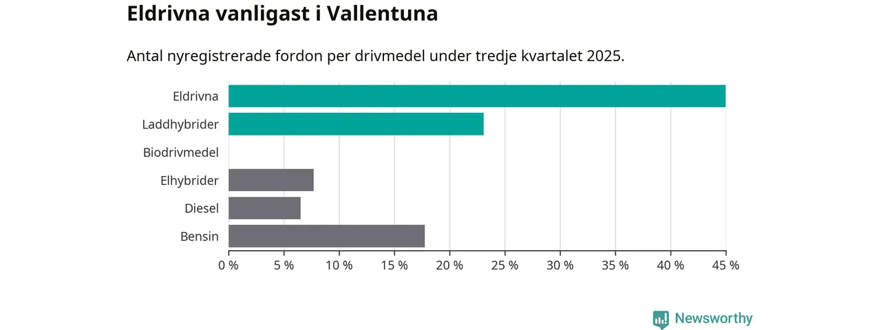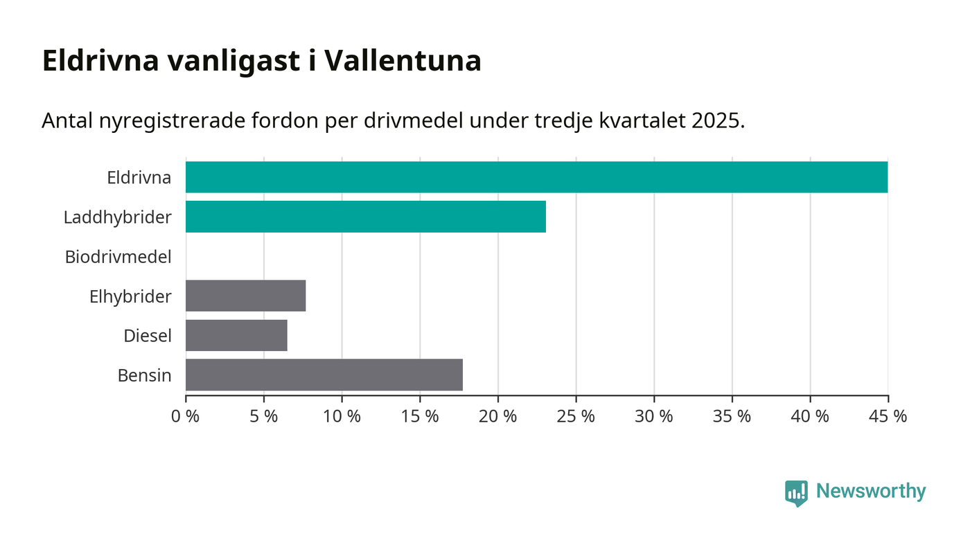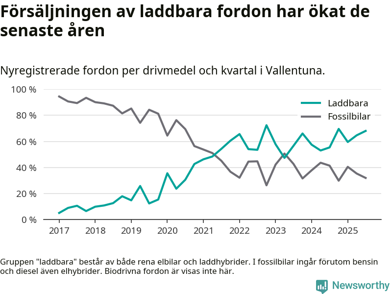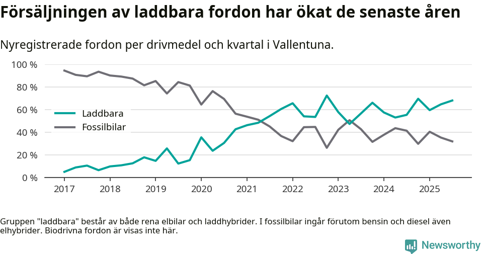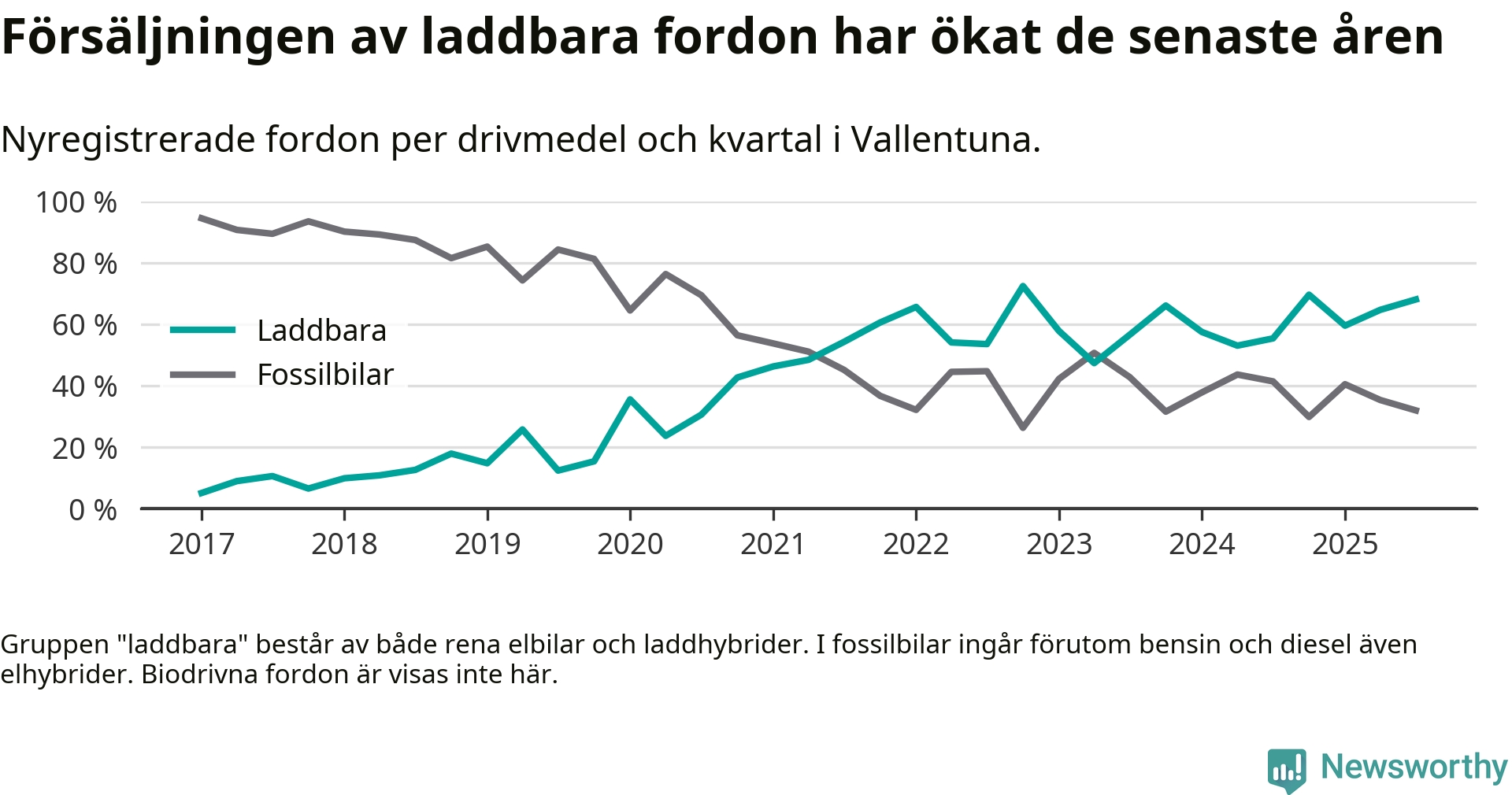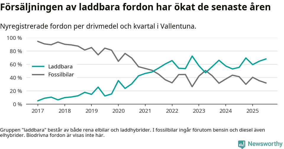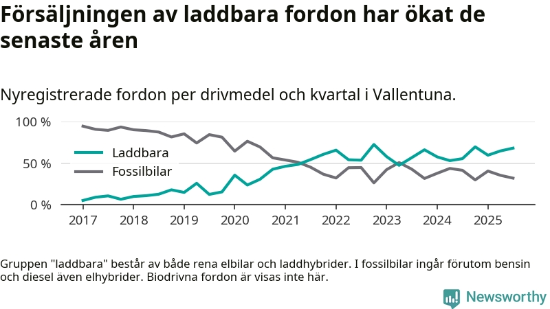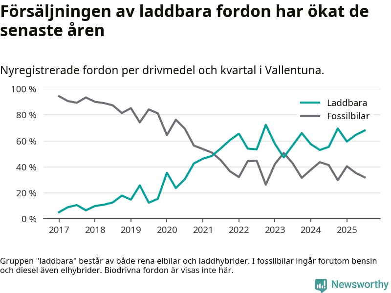 Under tredje kvartalet 2025 var 68 procent av alla nyregistrerade personbilar i Vallentuna laddbara (sammanlagt registrerades 169 nya bilar). Merparten av de laddbara bilarna var rena elbilar (45 procent av alla).