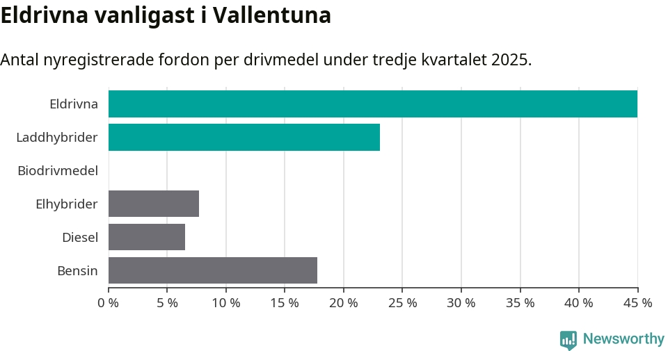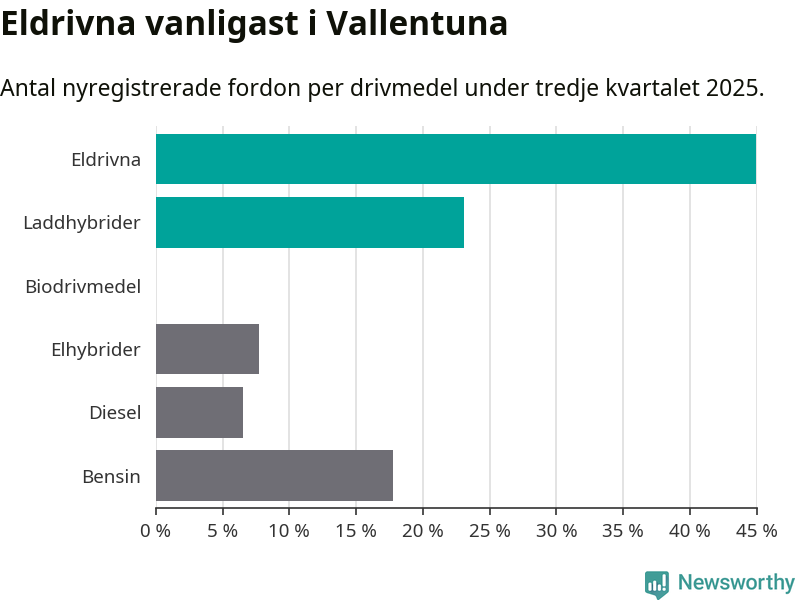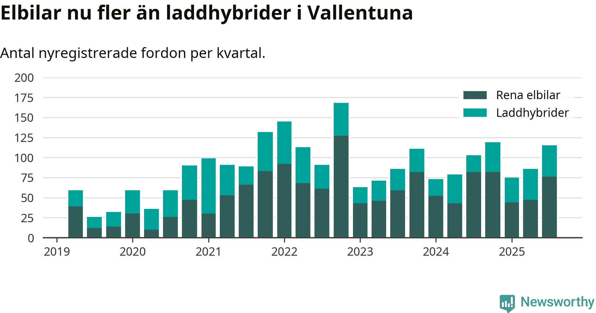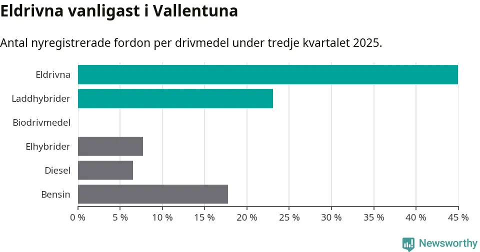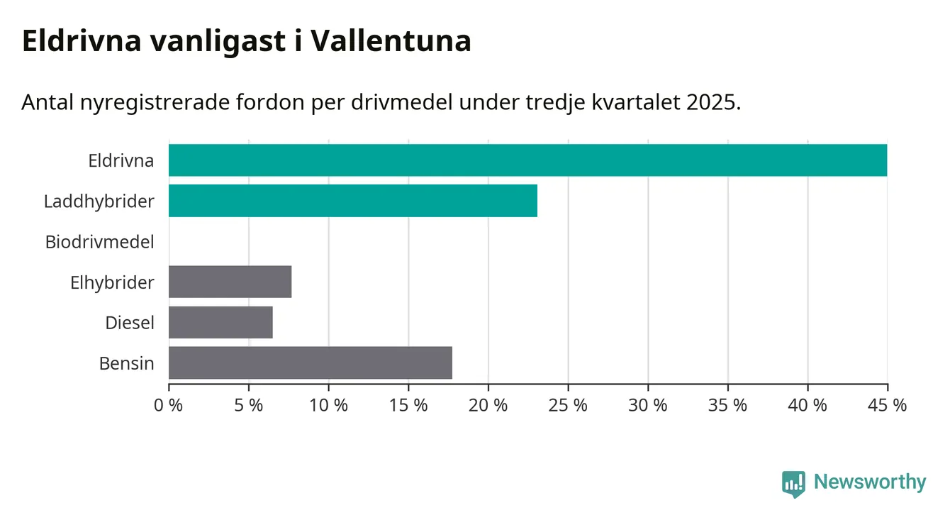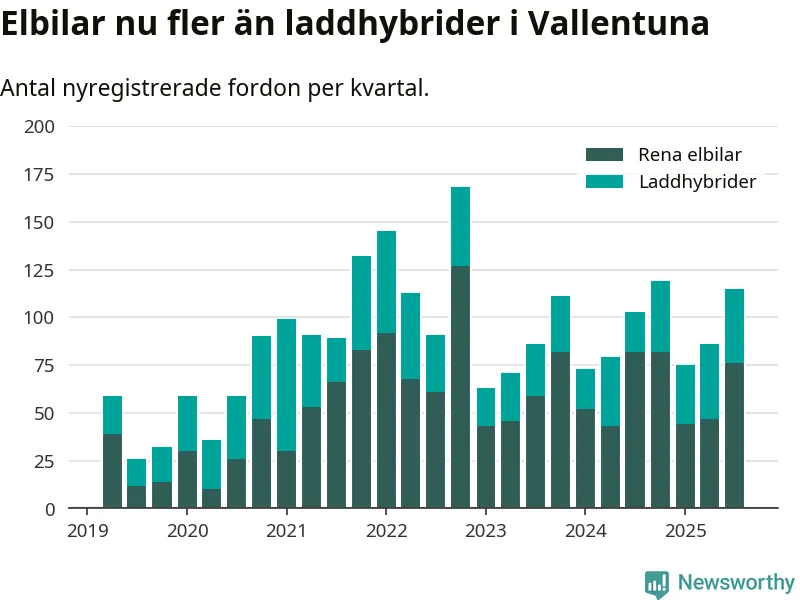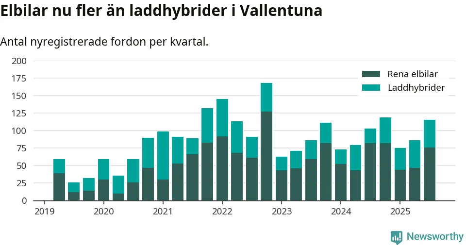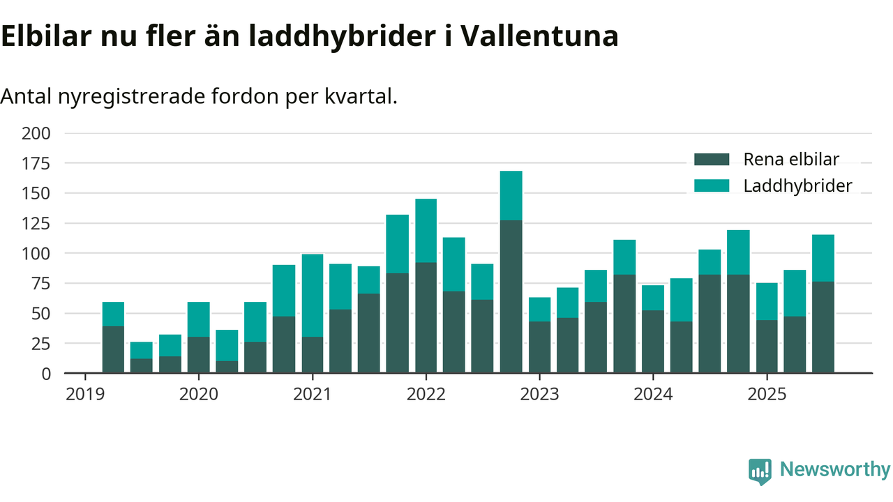 Under tredje kvartalet 2025 var 68 procent av alla nyregistrerade personbilar i Vallentuna laddbara (sammanlagt registrerades 169 nya bilar). Merparten av de laddbara bilarna var rena elbilar (45 procent av alla).