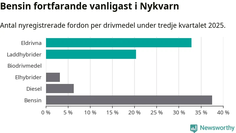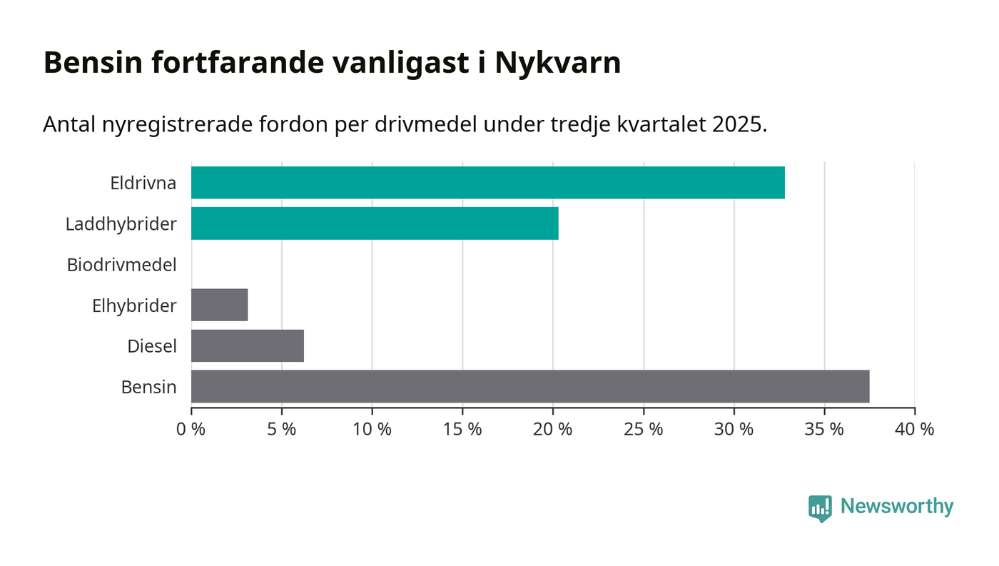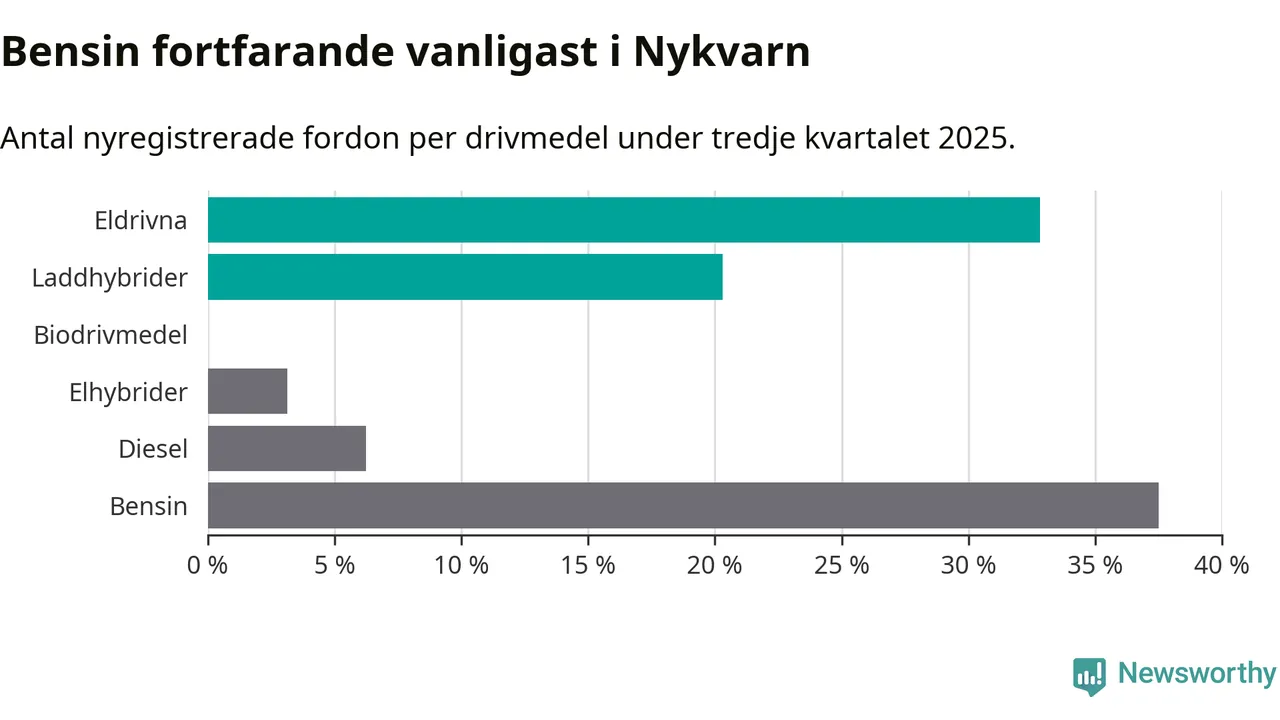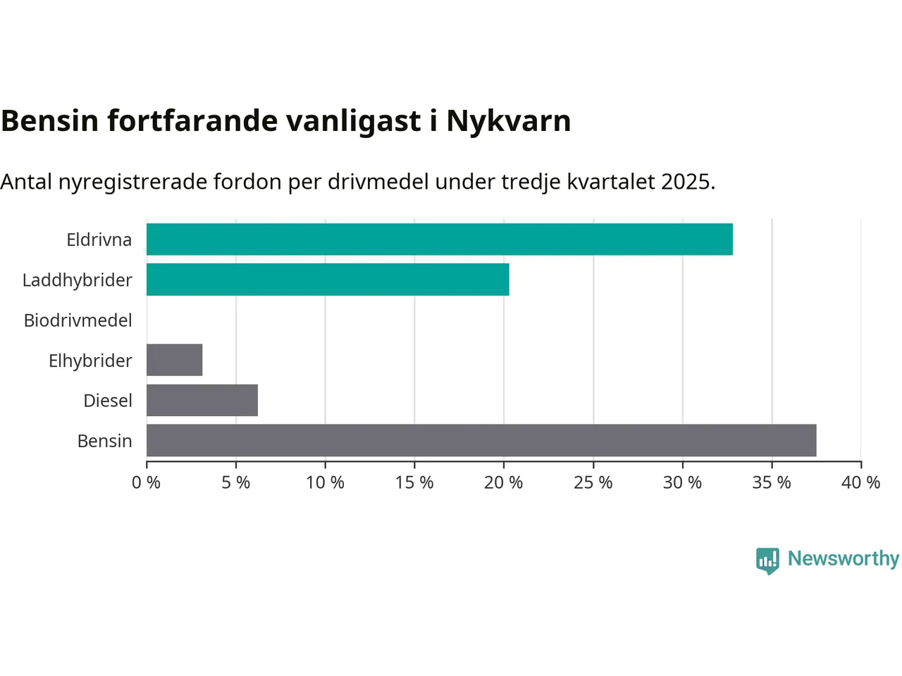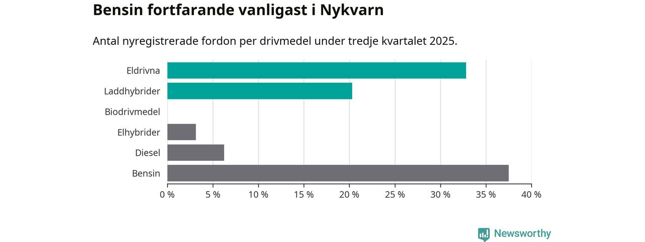 Under tredje kvartalet 2025 var 53 procent av alla nyregistrerade personbilar i Nykvarn laddbara (sammanlagt registrerades 64 nya bilar). Merparten av de laddbara bilarna var rena elbilar (33 procent av alla).