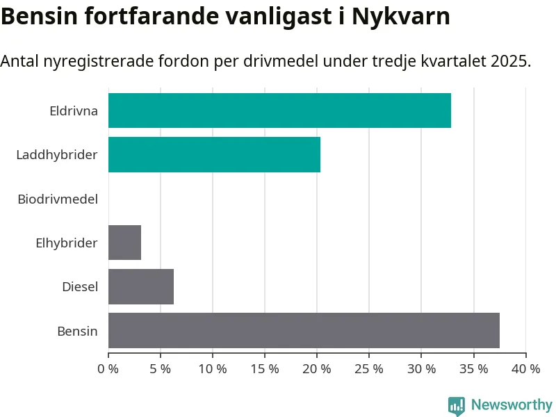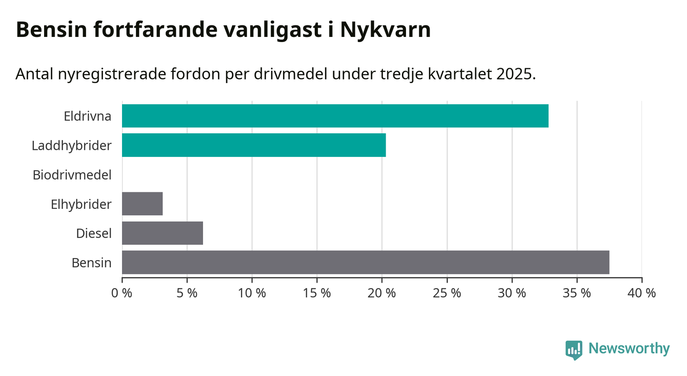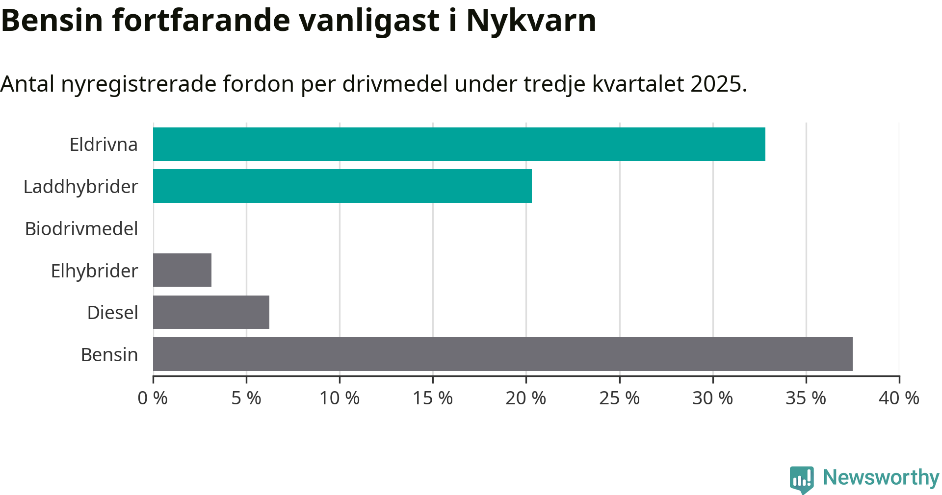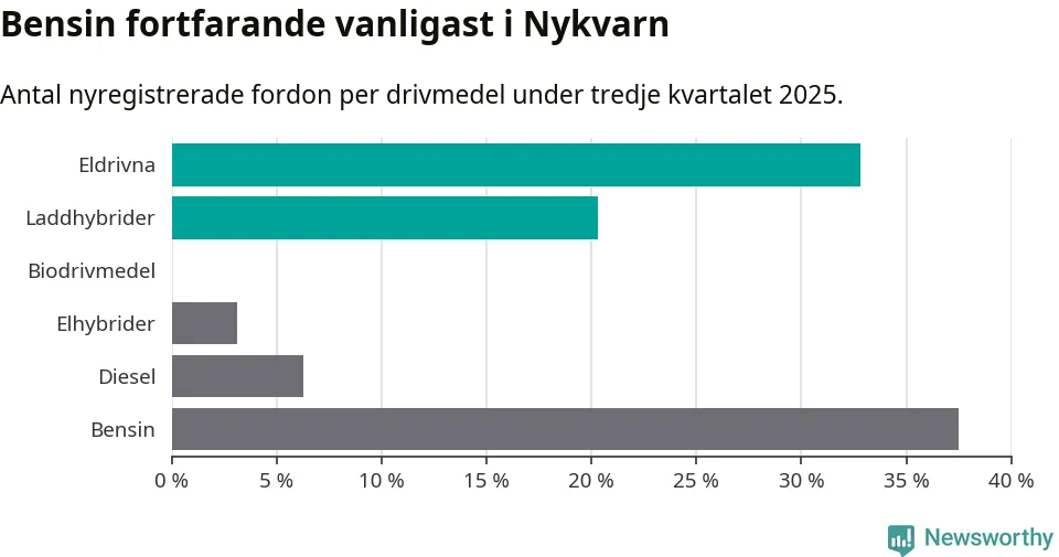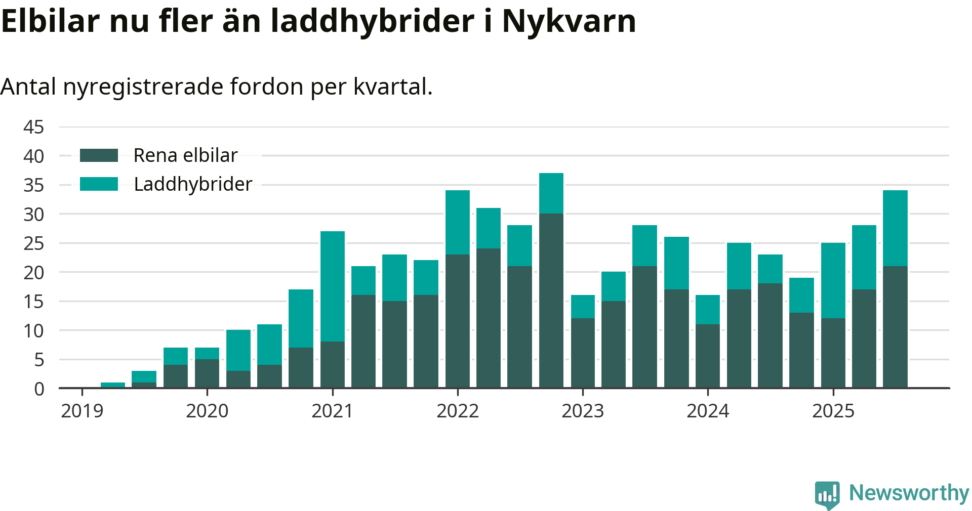 Under tredje kvartalet 2025 var 53 procent av alla nyregistrerade personbilar i Nykvarn laddbara (sammanlagt registrerades 64 nya bilar). Merparten av de laddbara bilarna var rena elbilar (33 procent av alla).